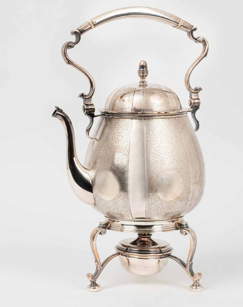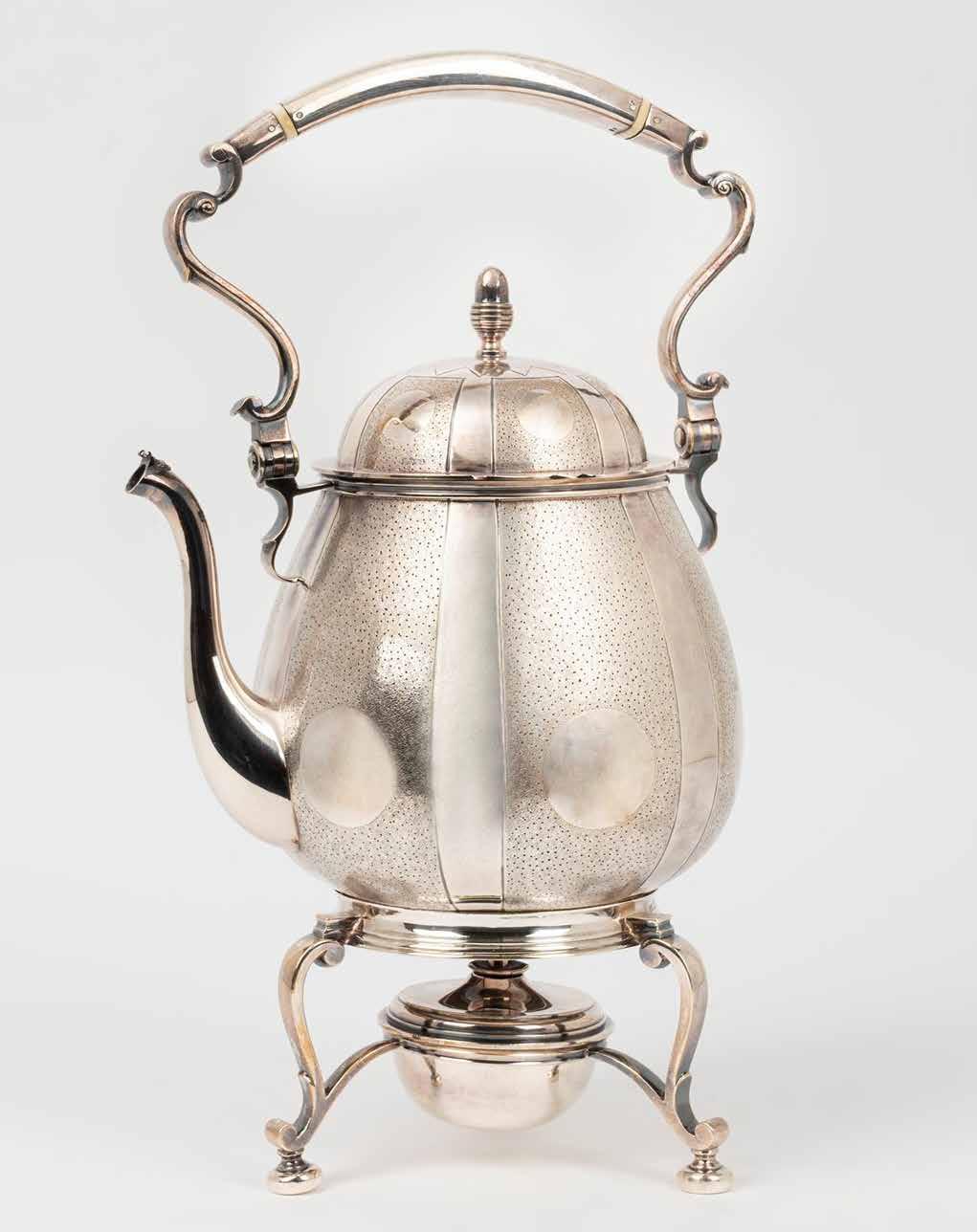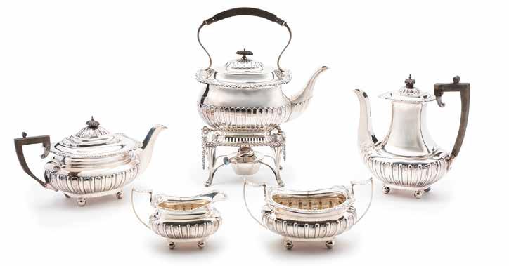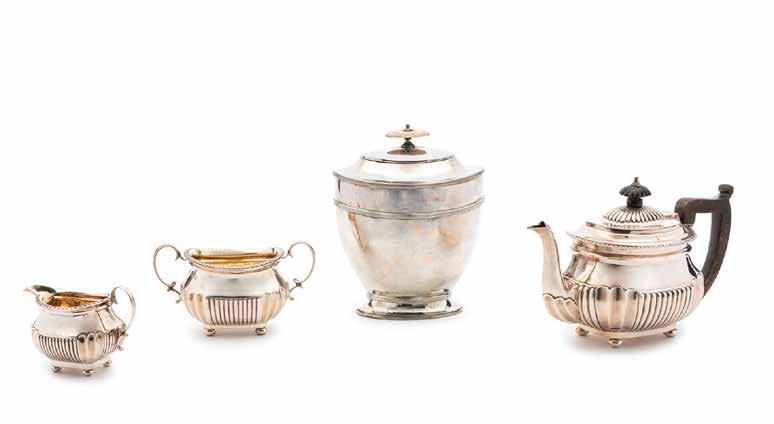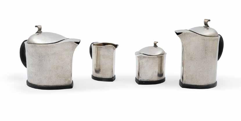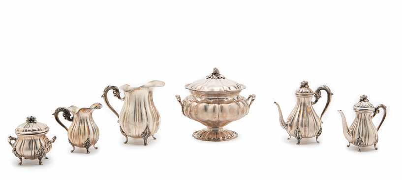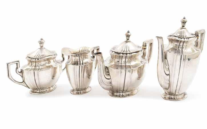 SILVER TEA AND COFFEE SERVICE, ITALY, ALESSANDRIA, 20TH CENTURY, consisting of coffee pot, teapot, sugar bowl and milk jug with ribbed decoration, lid with acorn grips.