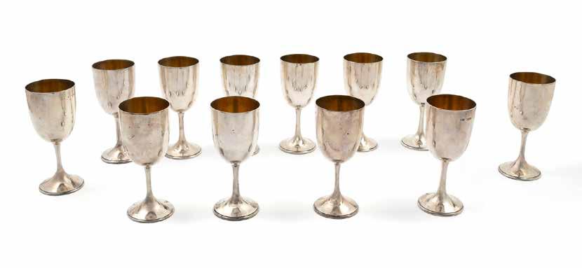 SEI BICCHIERI, ITALIA, XX SECOLO, in argento e vermeil, a decoro martellato con al centro treccia ad alto rilievo, difetti (ammaccature sul bordo inferiore di tre bicchieri). Peso g 767,00 cm 8,00x9,00