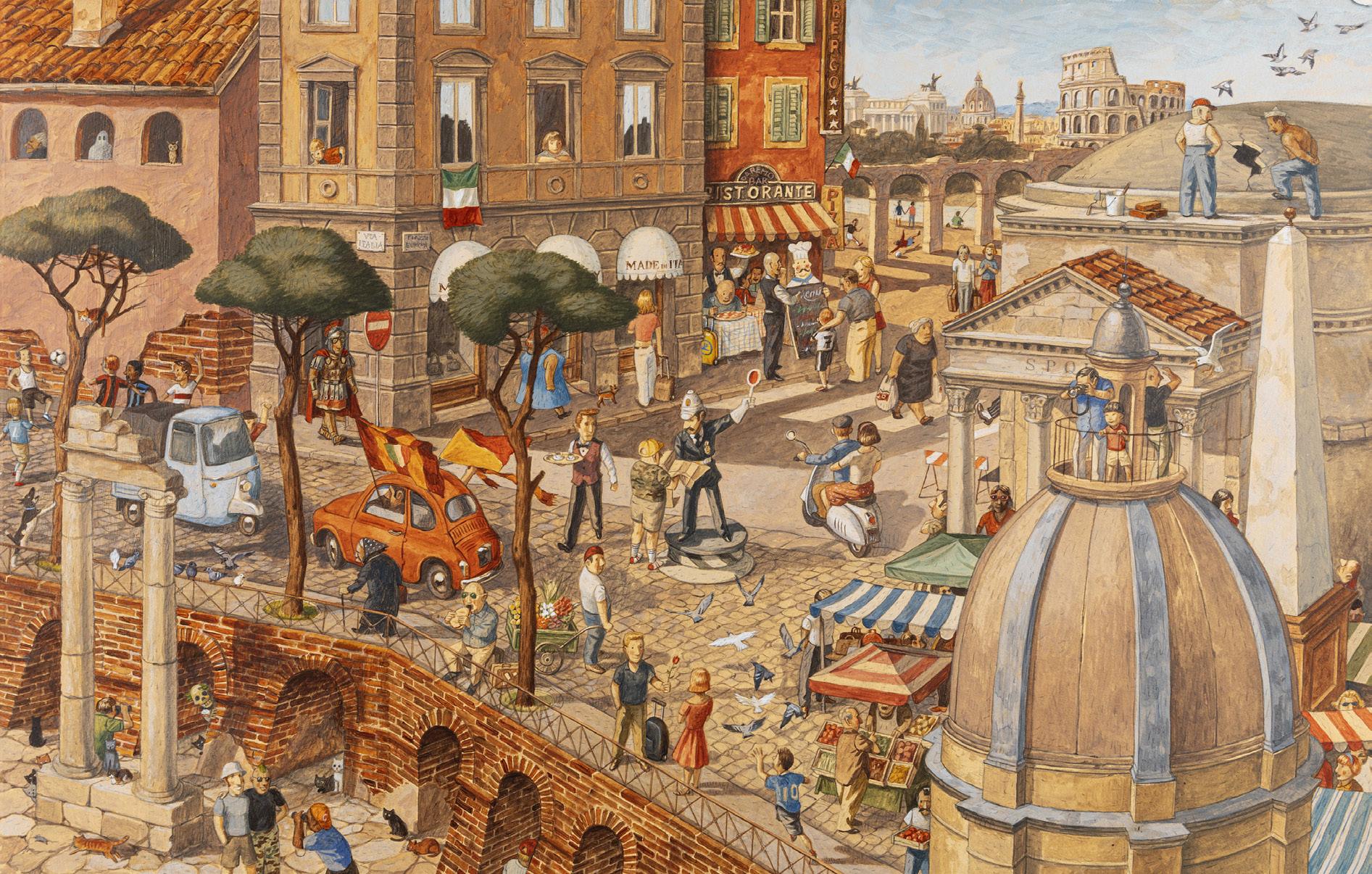 Illustrazione originale realizzata da Costantini per il volume “Le città del ferro”, edito dalla Italsider nel 1967. Pittore e illustratore di fama internazionale, Costantini ha un percorso completamente personale e autonomo: autodidatta, l’artista non hai mai nascosto la sua insofferenza per il mondo dell’arte e l’impossibilità di riconoscersi in un movimento artistico definito. Fin dall’inizio, la stessa adesione alla figurazione è smentita dalle prospettive sempre spiazzanti e dalle proporzioni irregolari. Il tratto nero che delinea persone e architetture - a volte spesso, a volte solo un sottile reticolo che delinea le ombre - accompagna tutta la sua produzione ed è diventato una delle caratteristiche inconfondibili delle sue opere.
