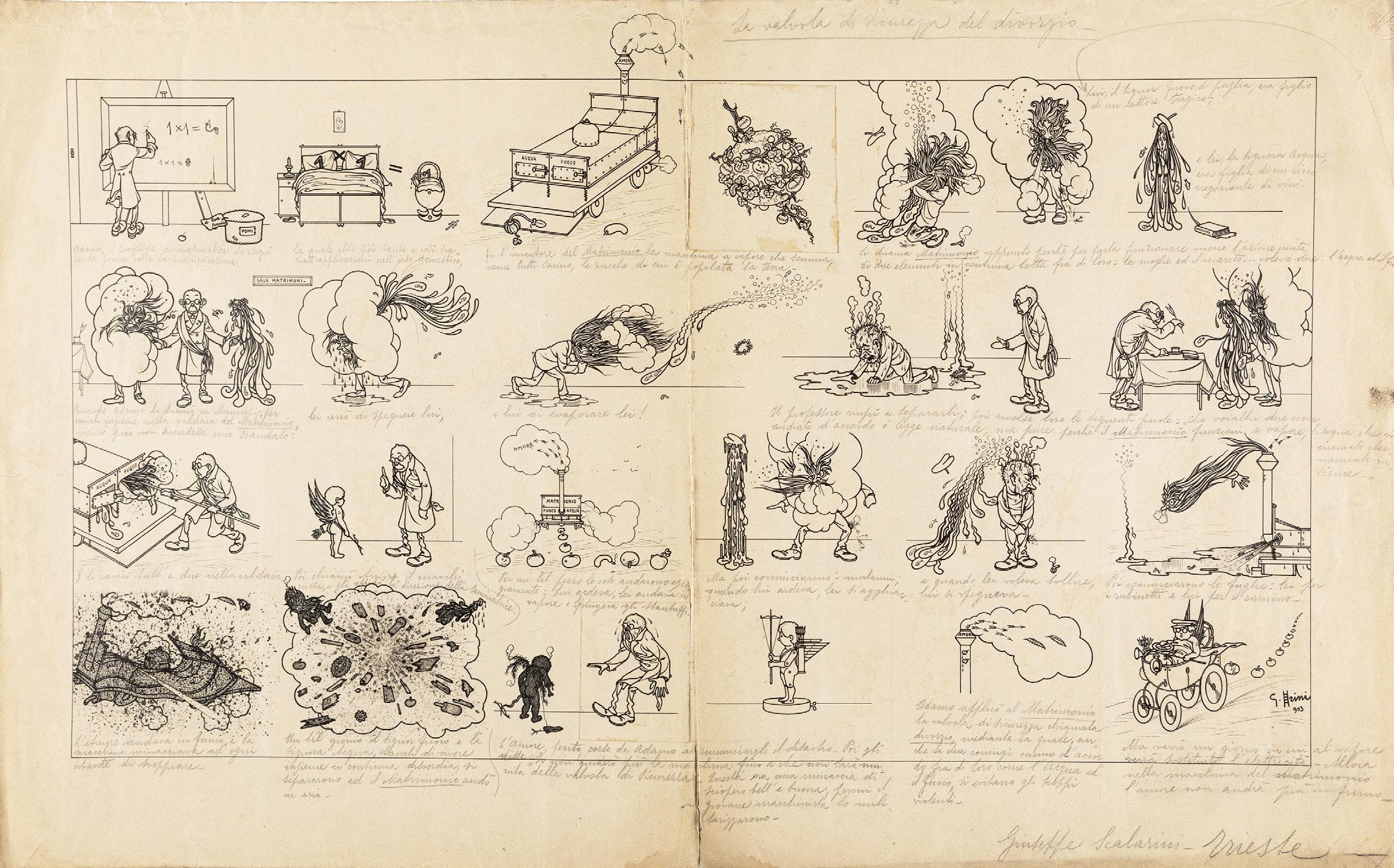 Tempera on cardboard. Original illustration created by Albertarelli for the “Decamerone”, a choral work which saw Boccasile, De Gaspari, Molino and Albertarelli alternate in the various tables, published by La Chance du Bibliophile in 1955.