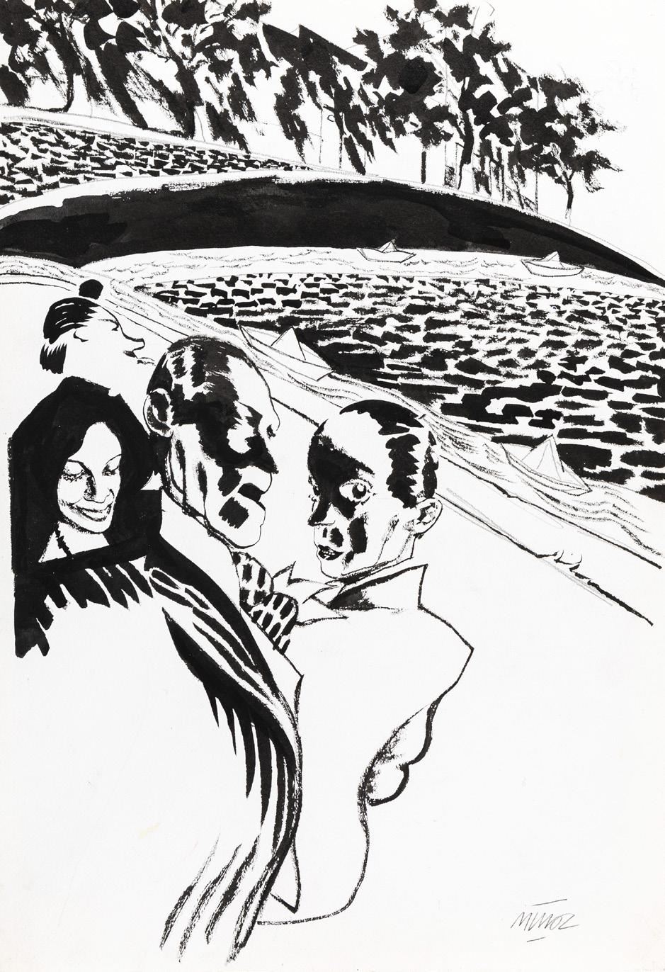 Illustrazione originale realizzata da Albertarelli per il “Decamerone”, opera corale che vide alternarsi nella varie tavole Boccasile, De Gaspari, Molino e Albertarelli, edita da La Chance du Bibliophile nel 1955.