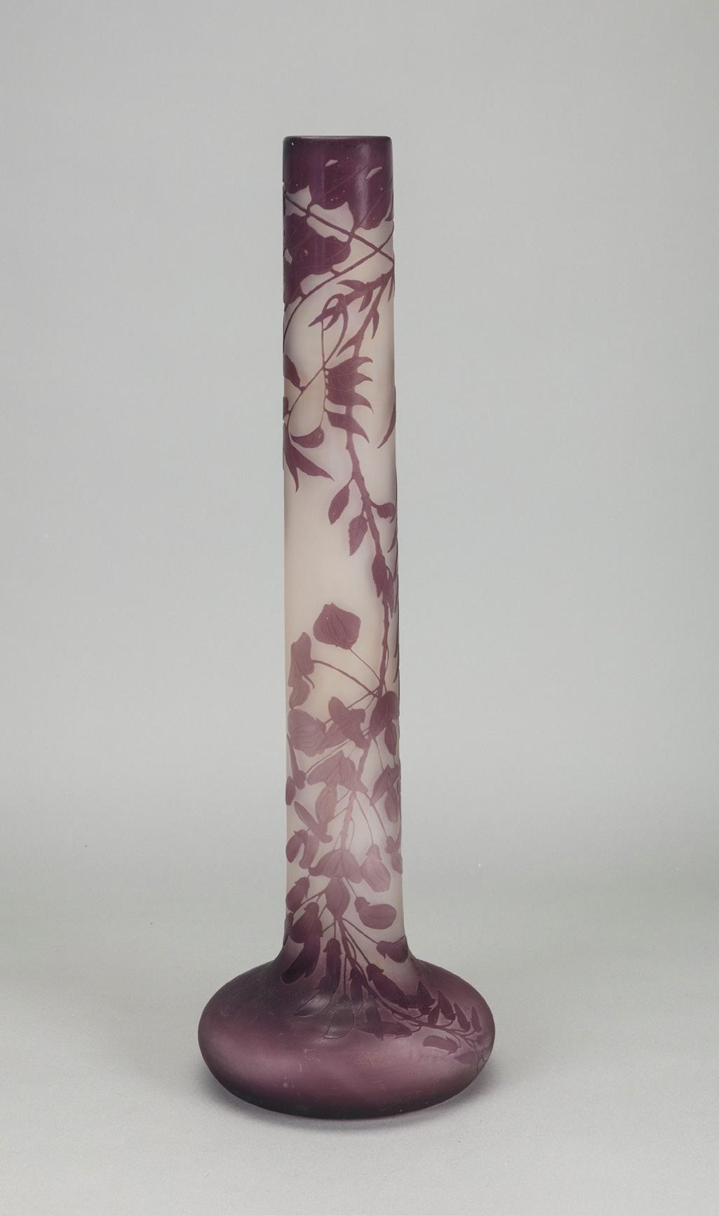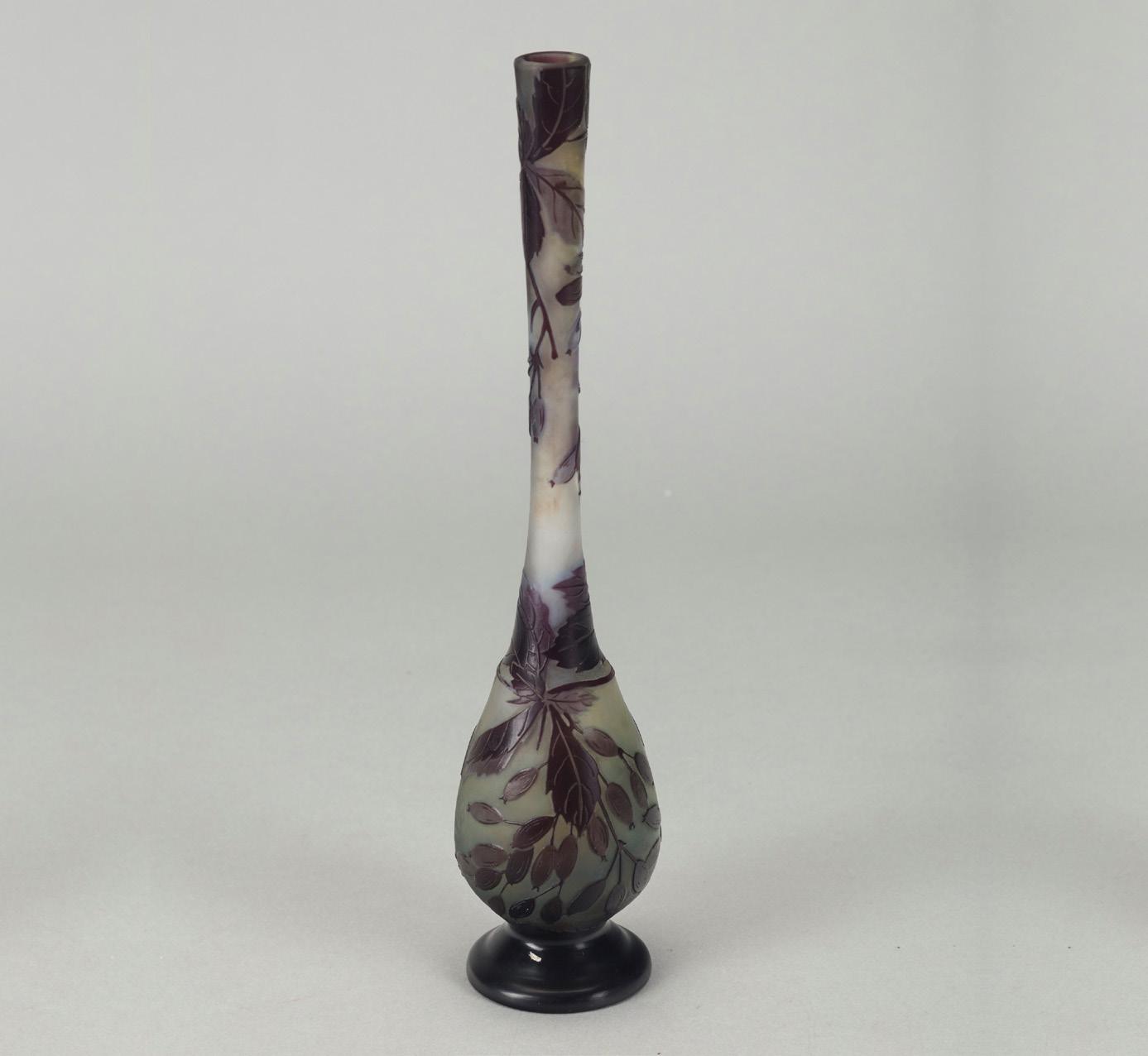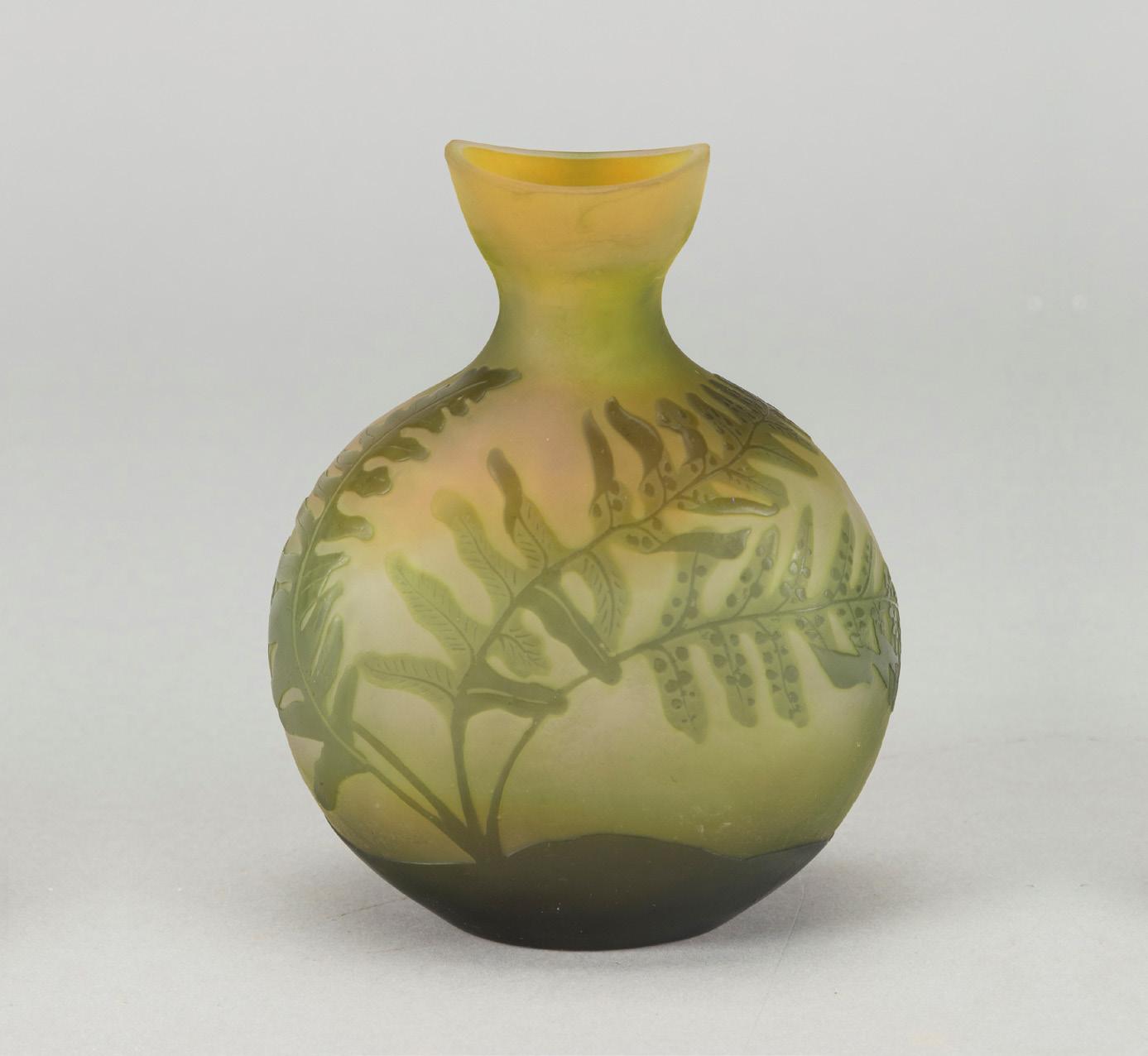 Vaso a fiasco 1900 ca. in vetro a strati di colore, lavorazione a cammeo, decorazione con felce. Produzione vetrerie Gallé.