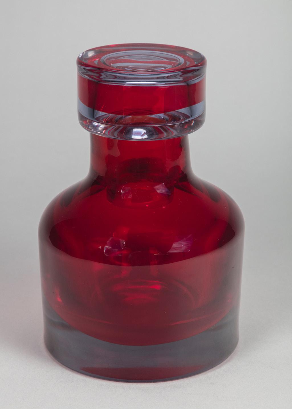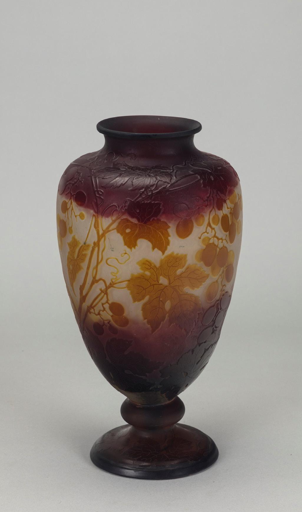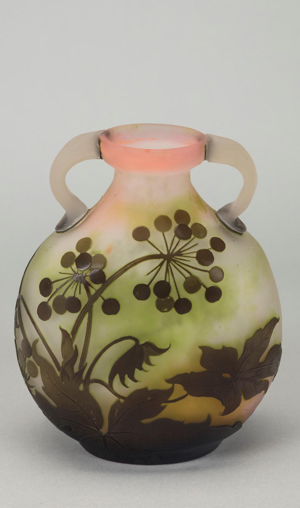Piccola anfora 1900 ca. in vetro a strati di colore, lavorazione a cammeo, decorazione con foglie e bacche. Produzione vetrerie Gallé.