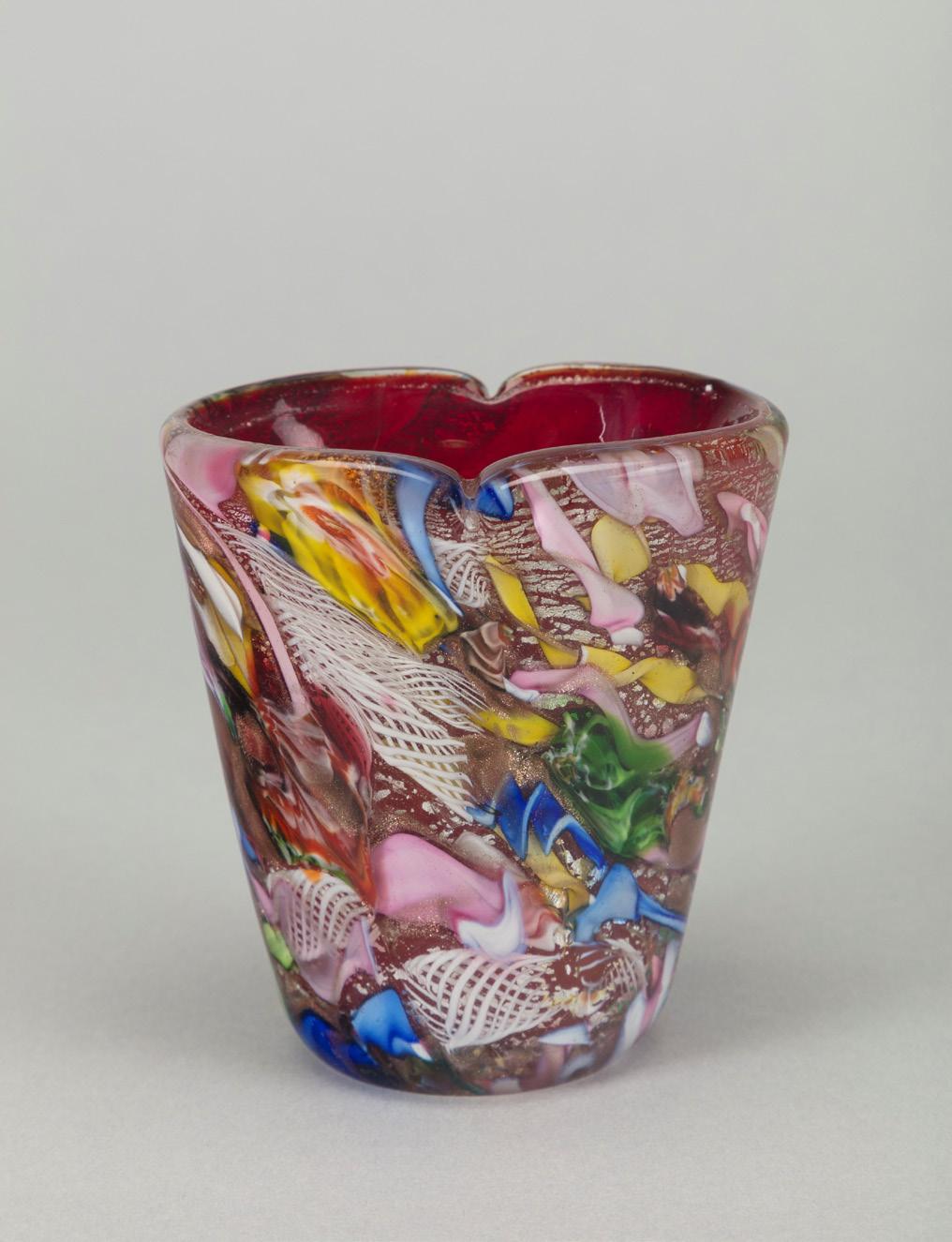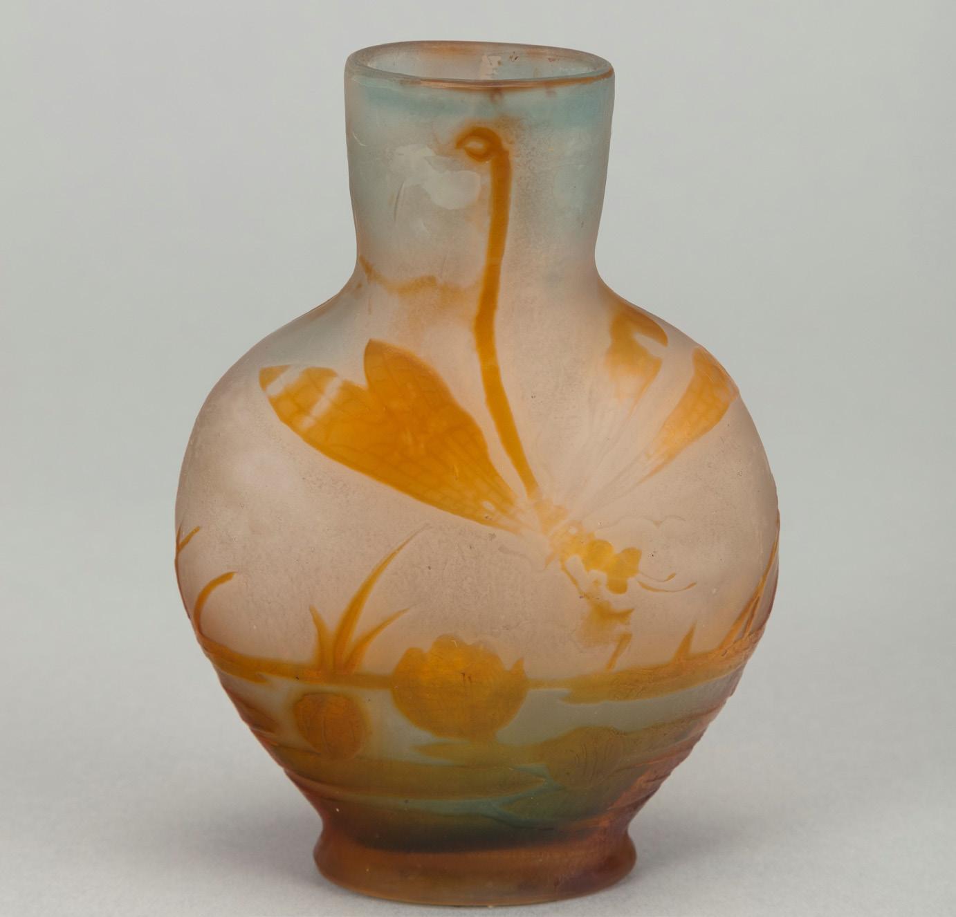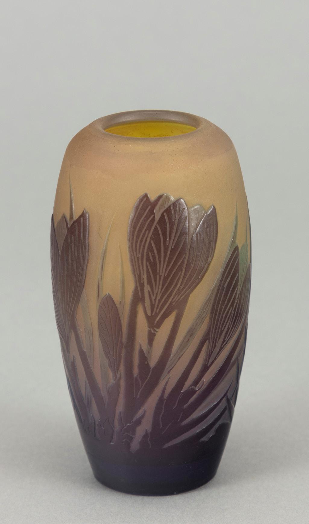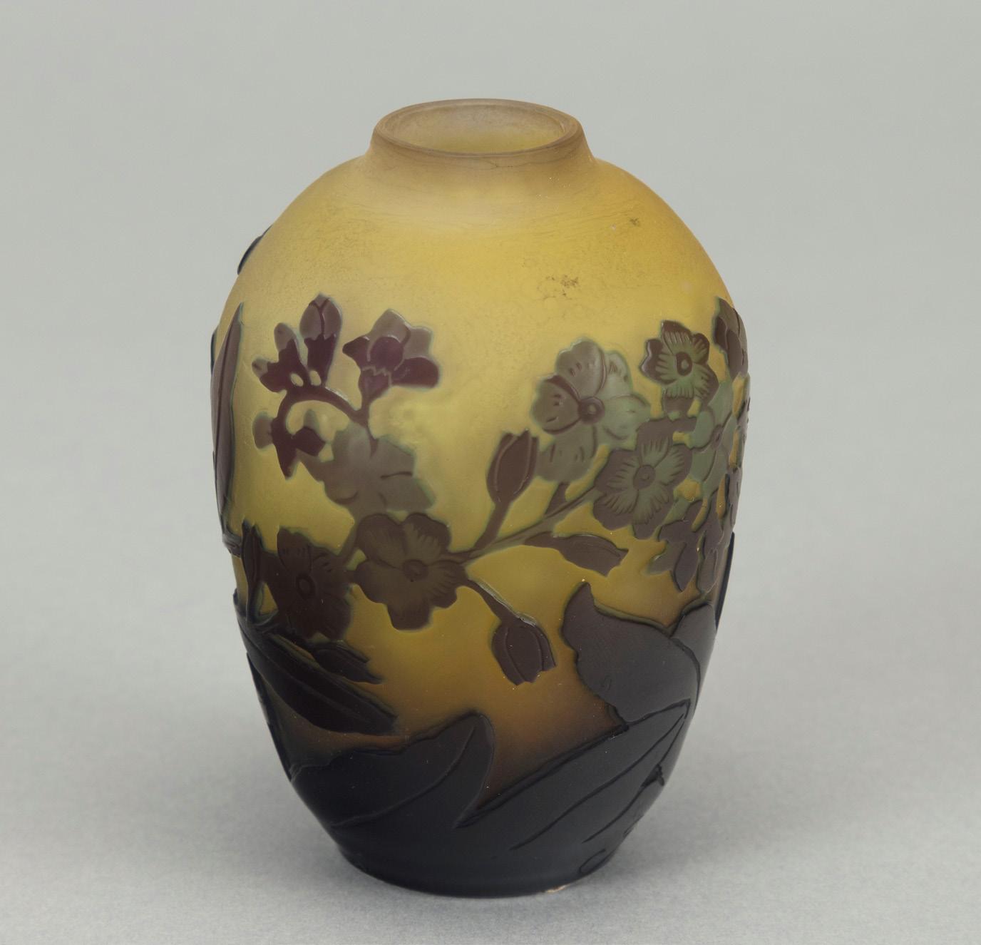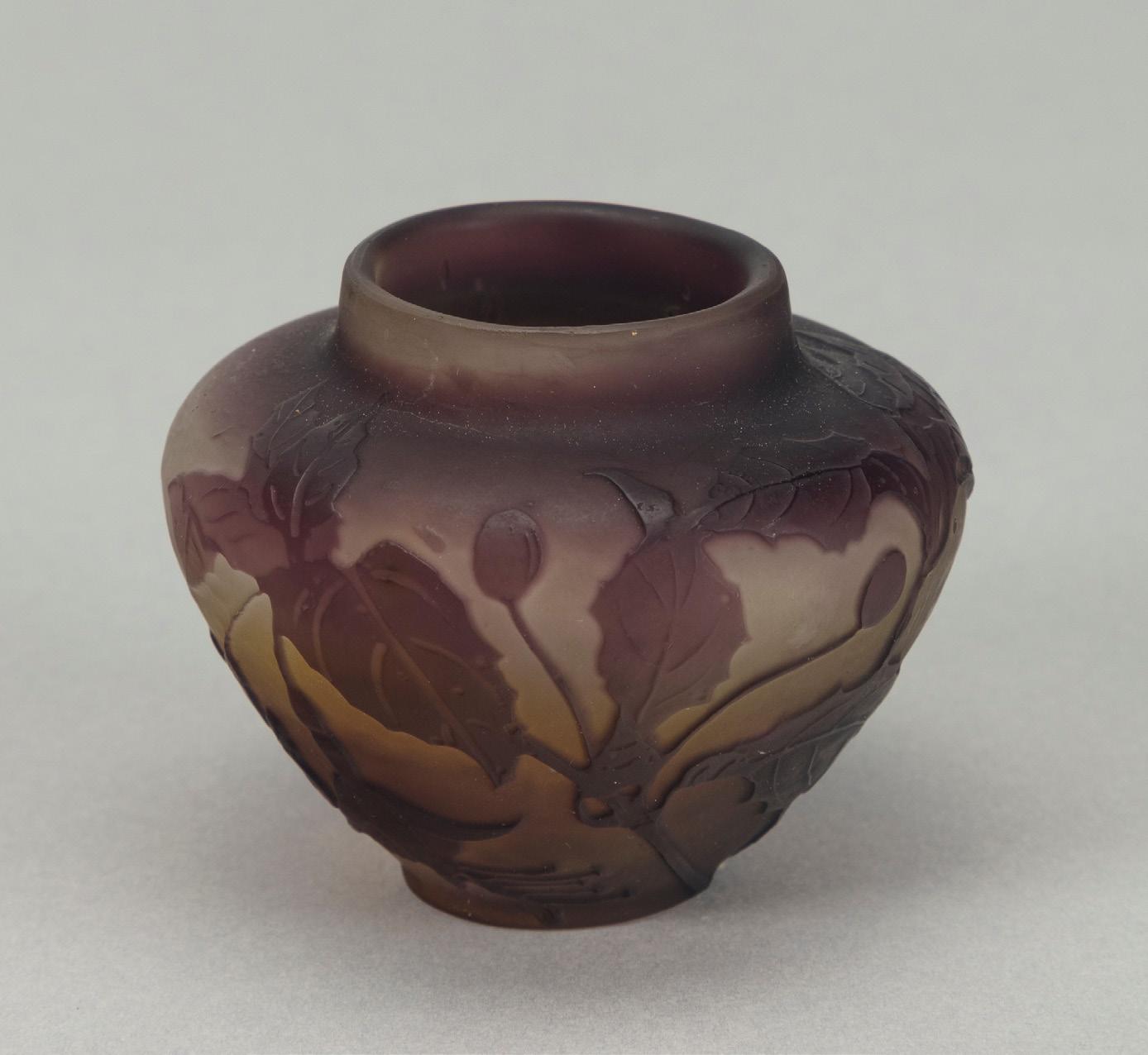 Piccolo vaso 1900 ca. in vetro a strati di colore, lavorazione a cammeo, con decorazione fitomorfa. Produzione vetrerie Gallé.