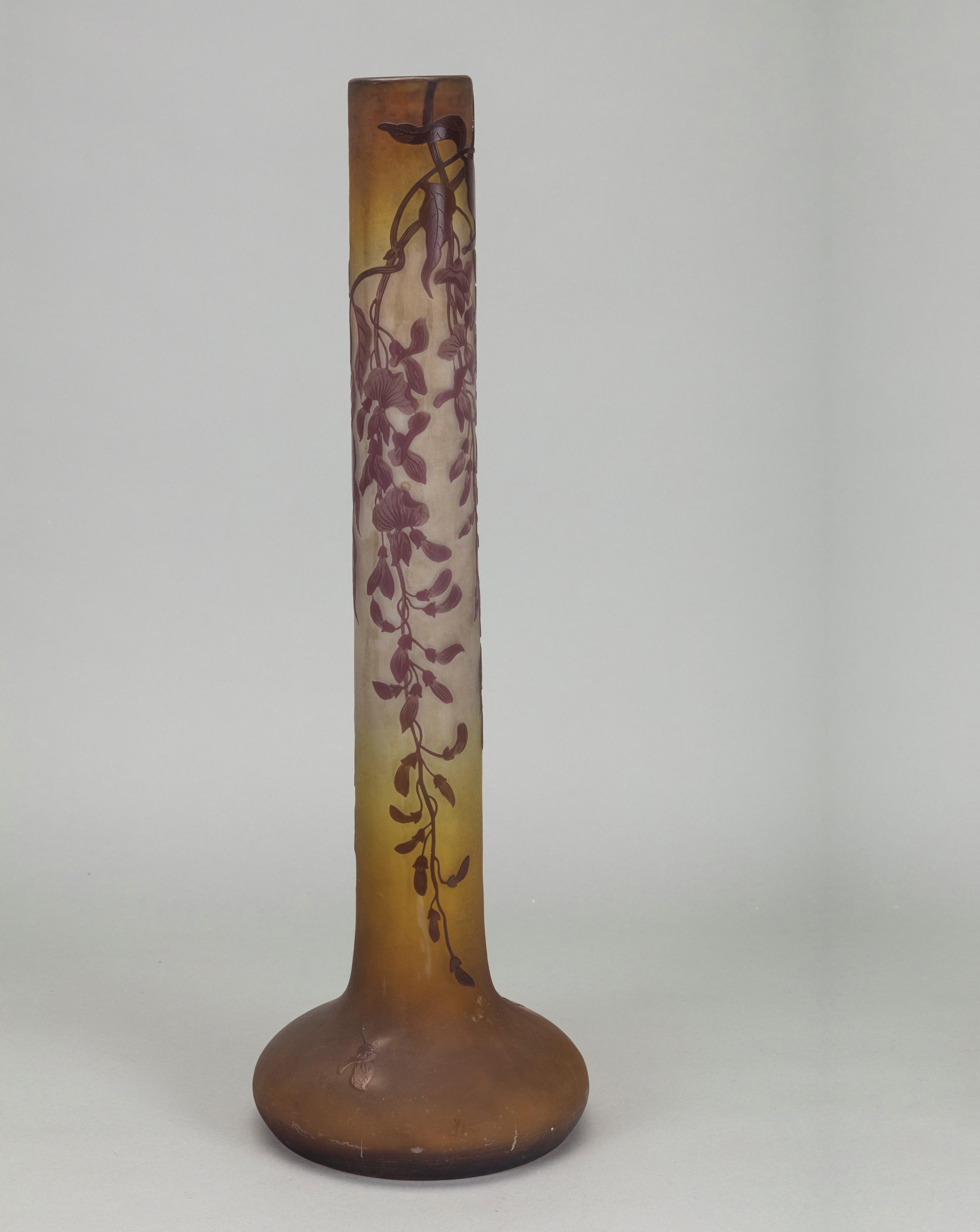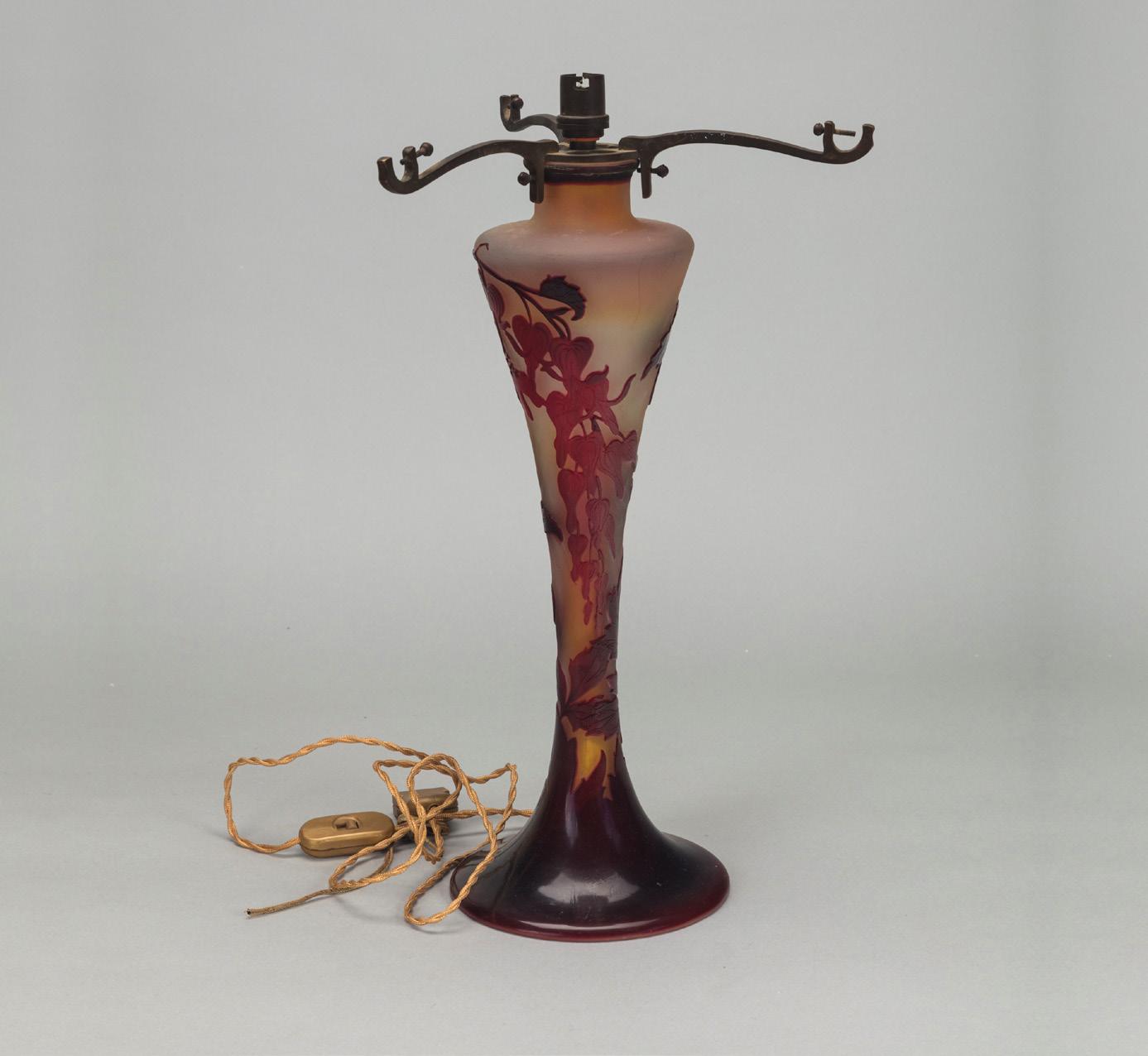 Base di lampada 1900 ca. in vetro a strati di colore, lavorazione a cammeo, decorazione con glicini.