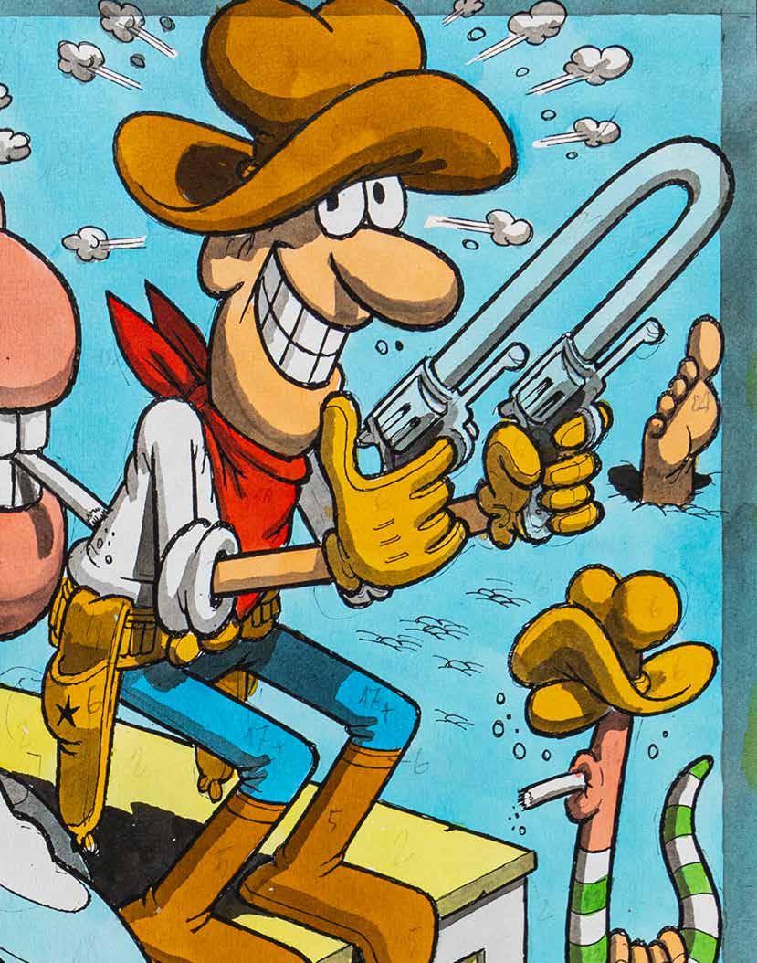 Tempera on thin cardboard. Original illustration made by Albertarelli in the late 40s for Vittorioso. A high-impact image by the Italian father of western comics. Signed.