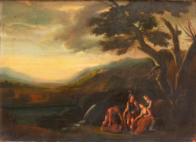 Paesaggio con cacciatori olio su rame - cm 10,2 x 16,5