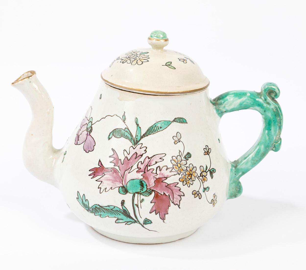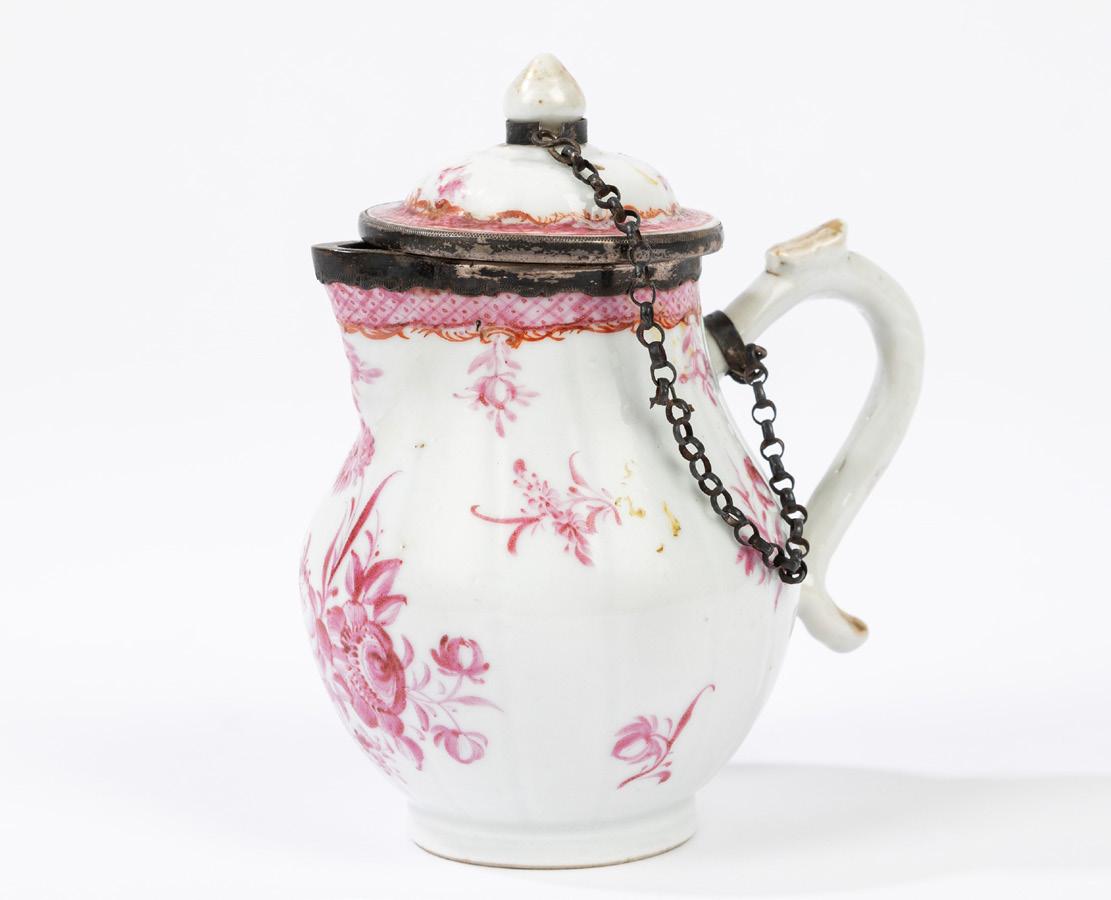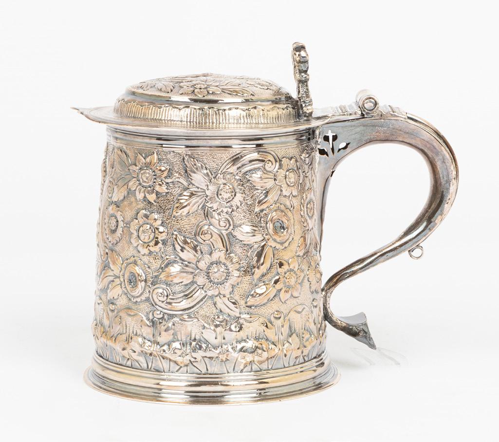 Peso: g 612; h cm 15,5 Argentiere John Cruttal. Riccamente ricesellato a motivi floreali e volute in epoca successiva, ansa mossa