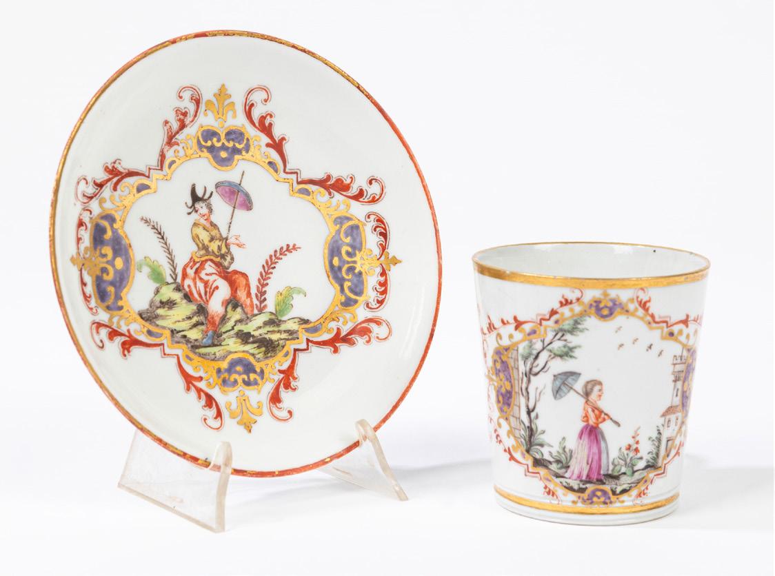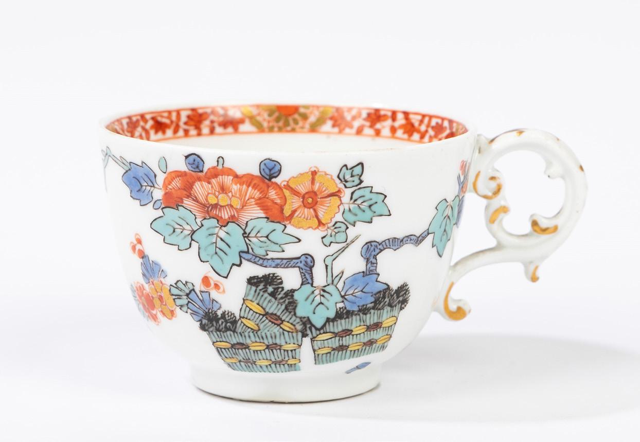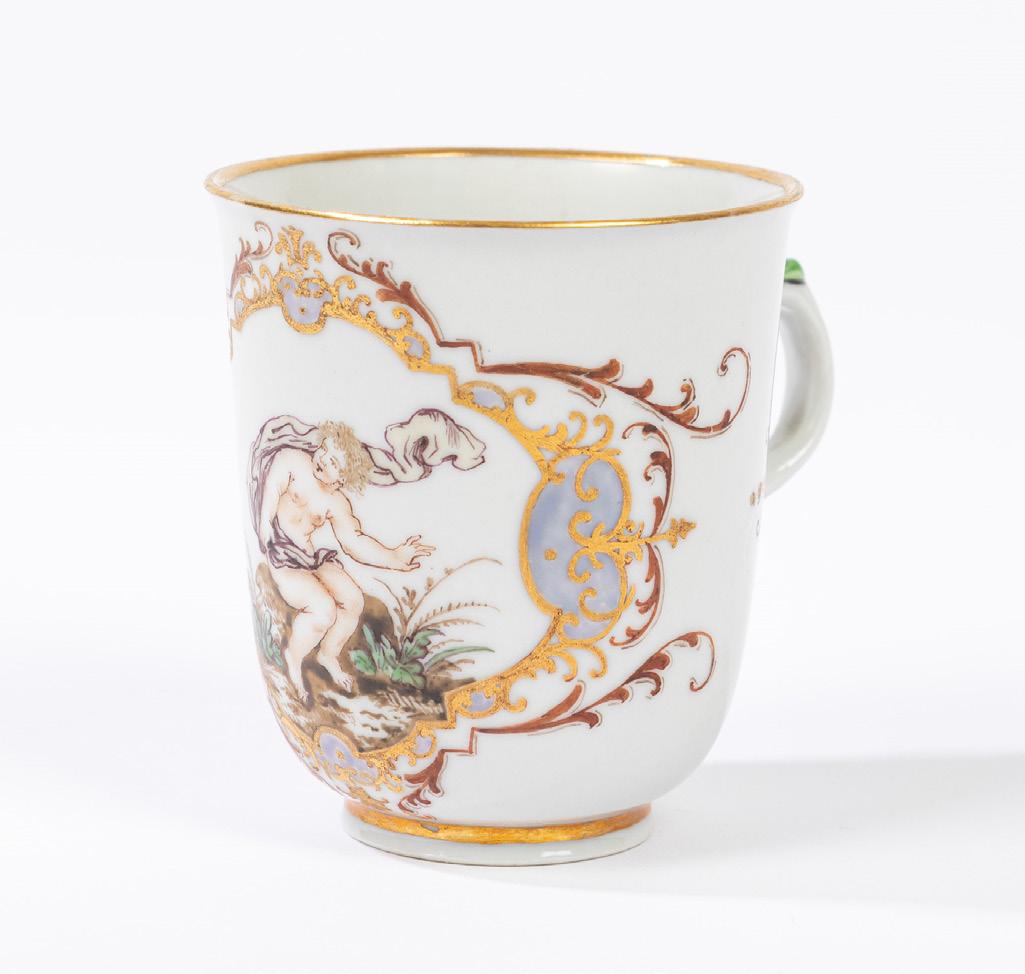 Tazza in porcellana policroma, Manifattura Ginori a Doccia, circa 1770 h cm 7,3 troncoconica, profilata in oro, decorata alla Sassone con nudo femminile entro riserva a volute fogliate oro e rosso ferro, ansa mossa
