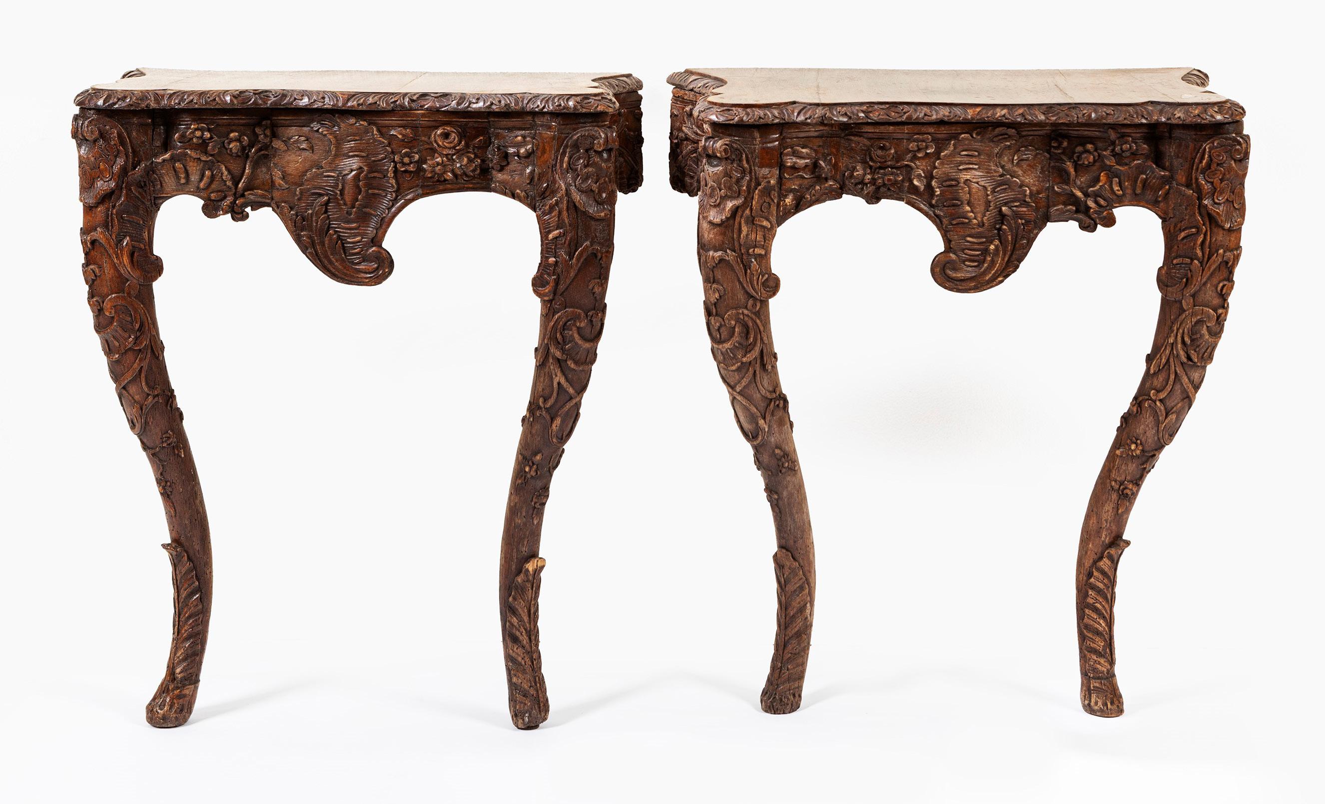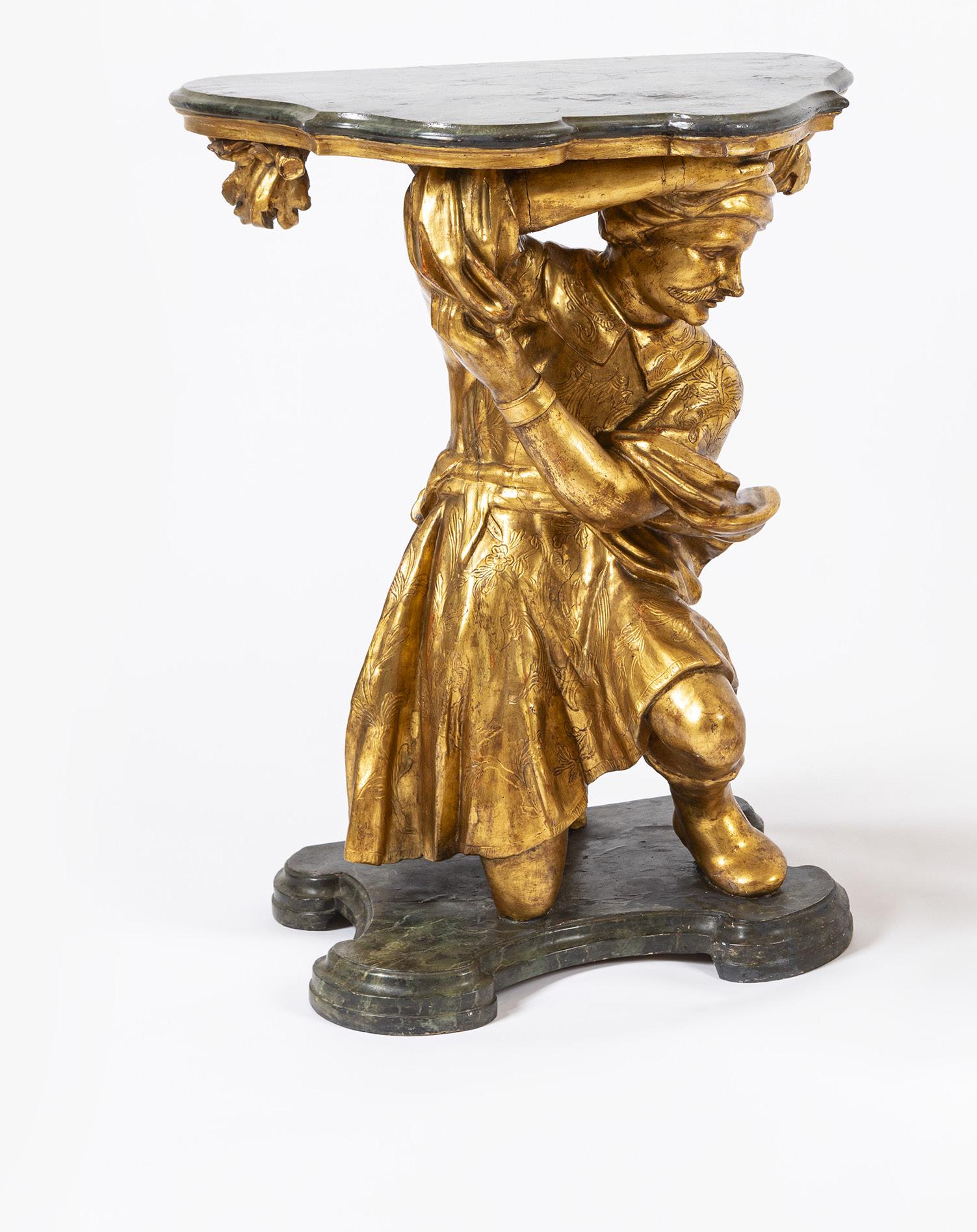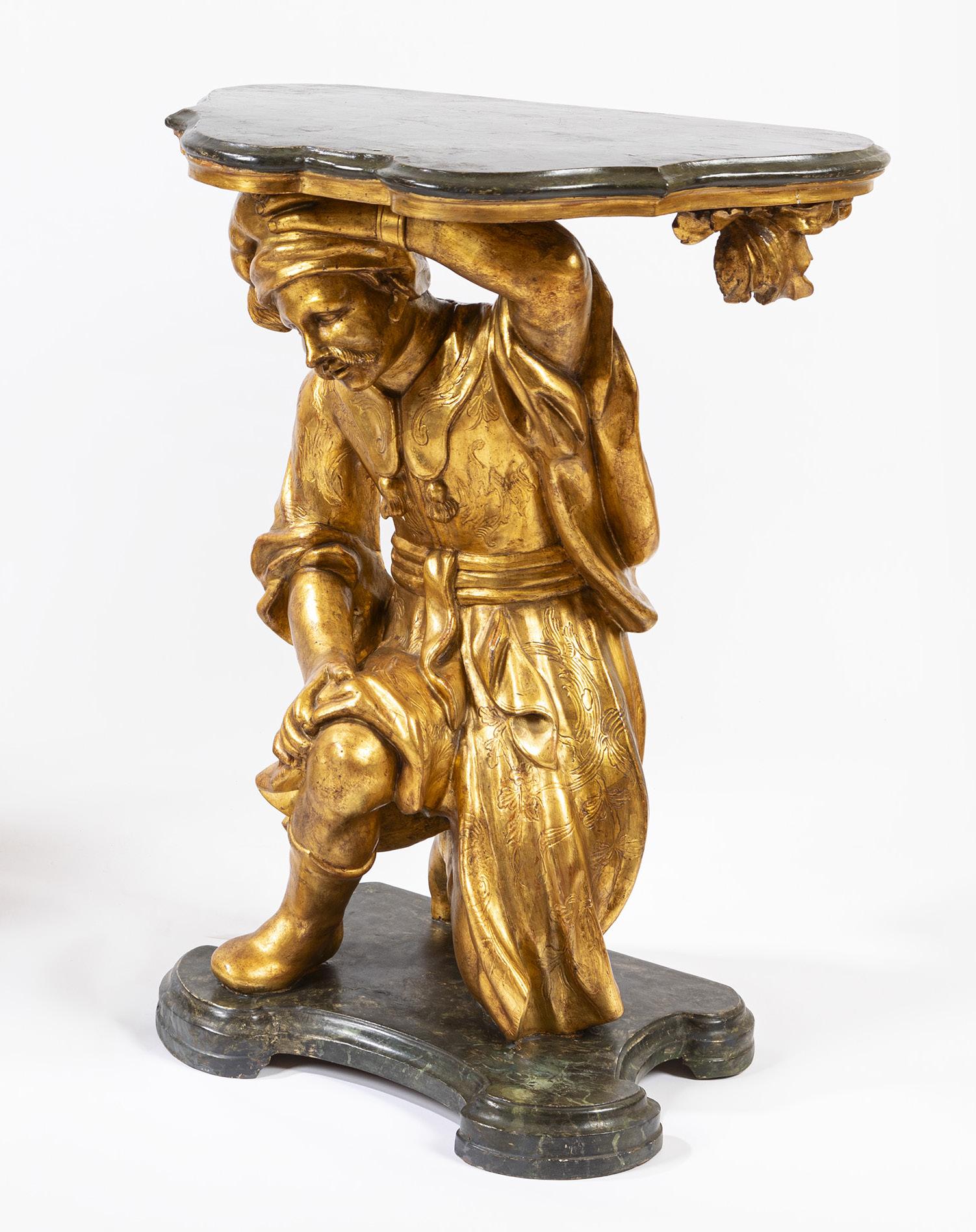 Coppia di consoles in legno scolpito e dorato, Venezia, secolo XVIII h cm 92x68x48 con due figure virili inginocchiate e dal manto finemente decorato, reggenti un piano centinato dipinto a finto marmo, basamento sagomato