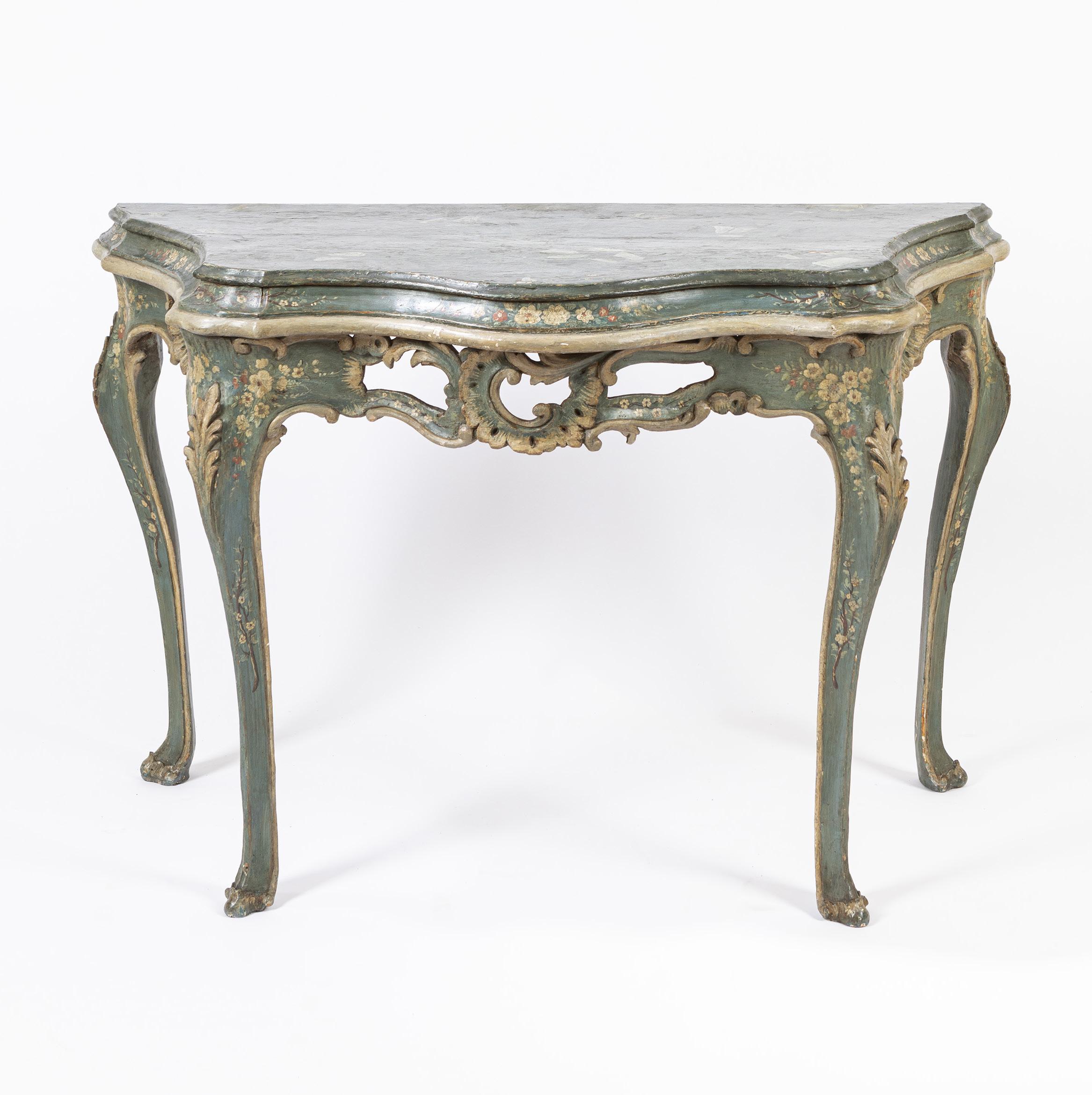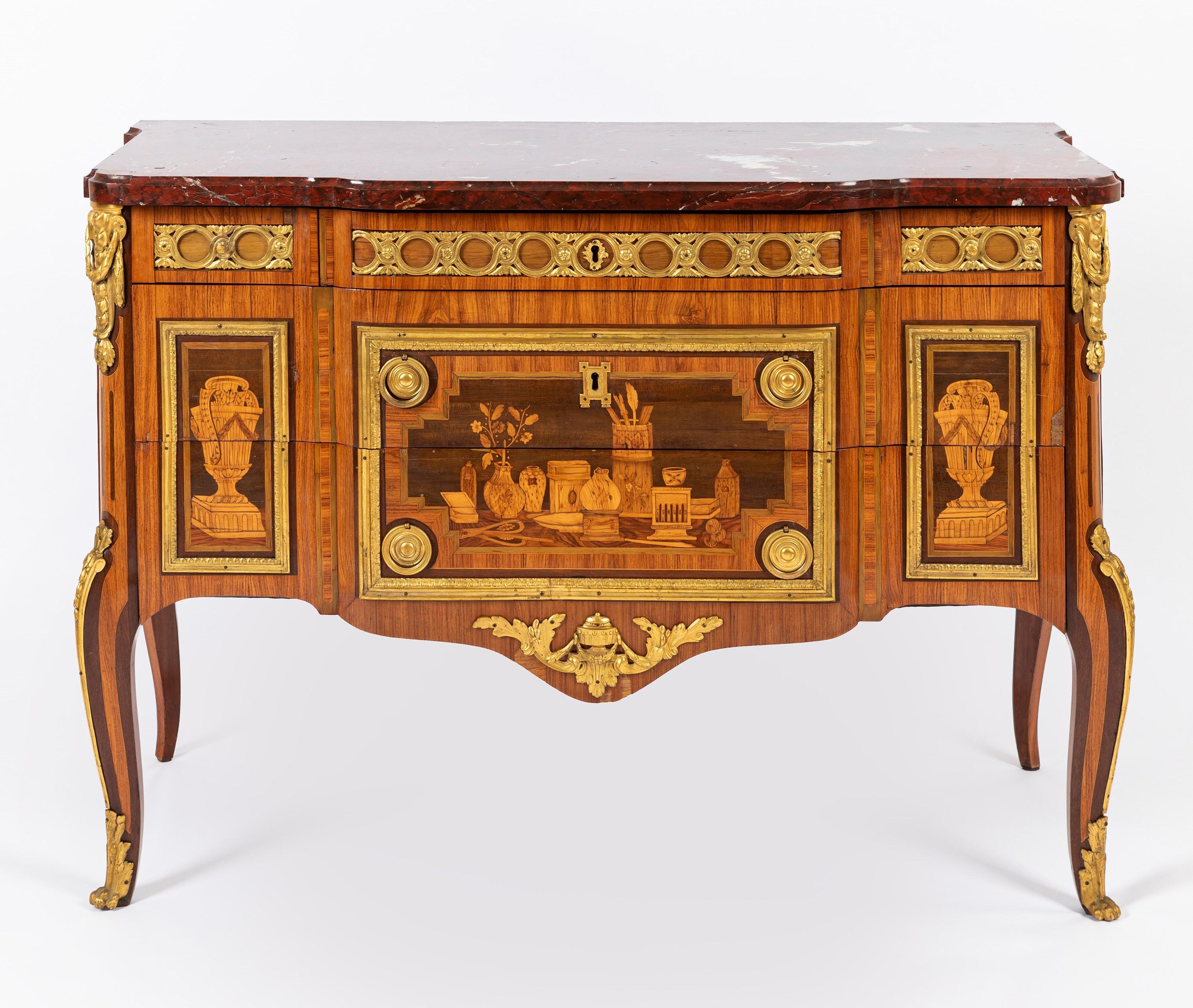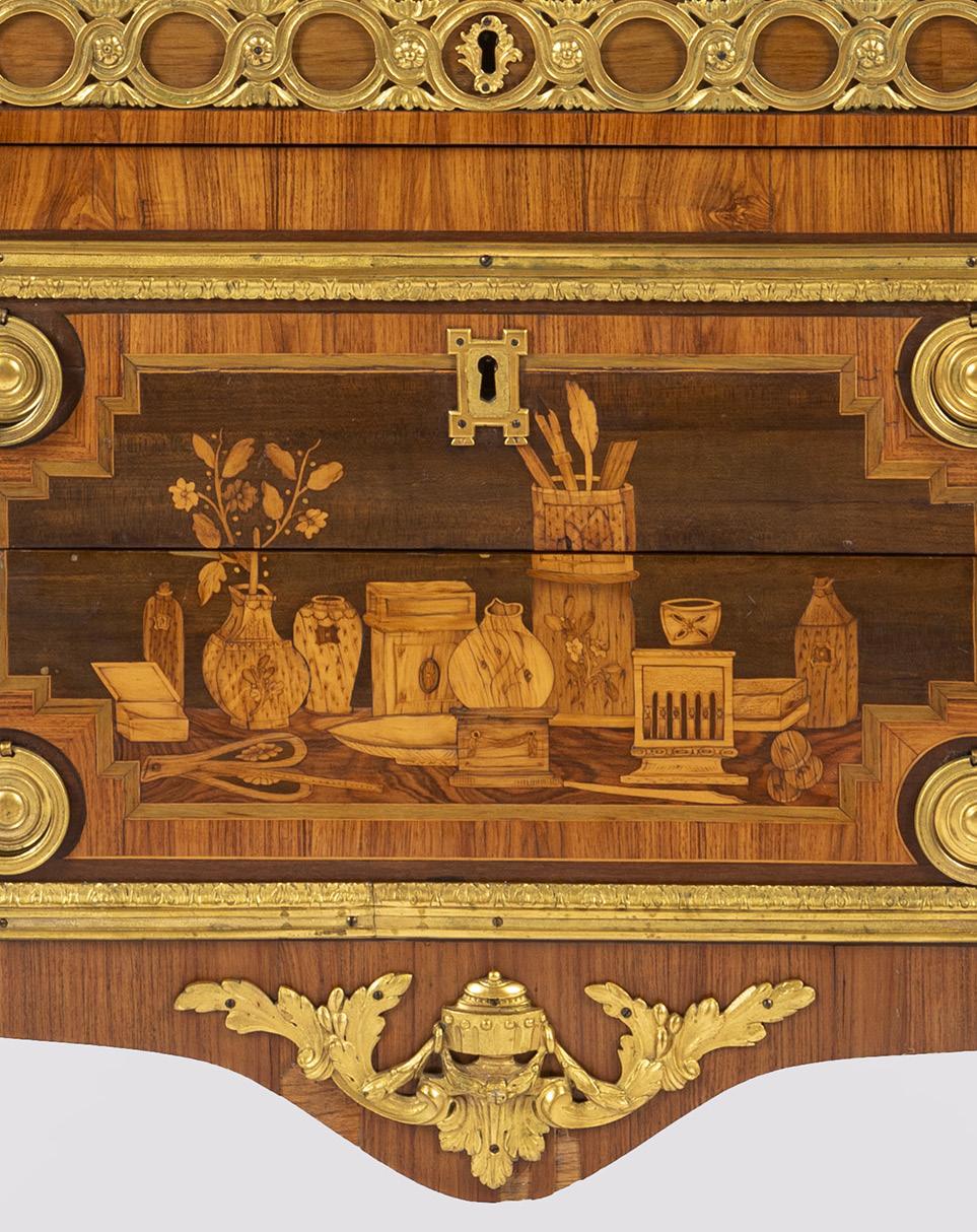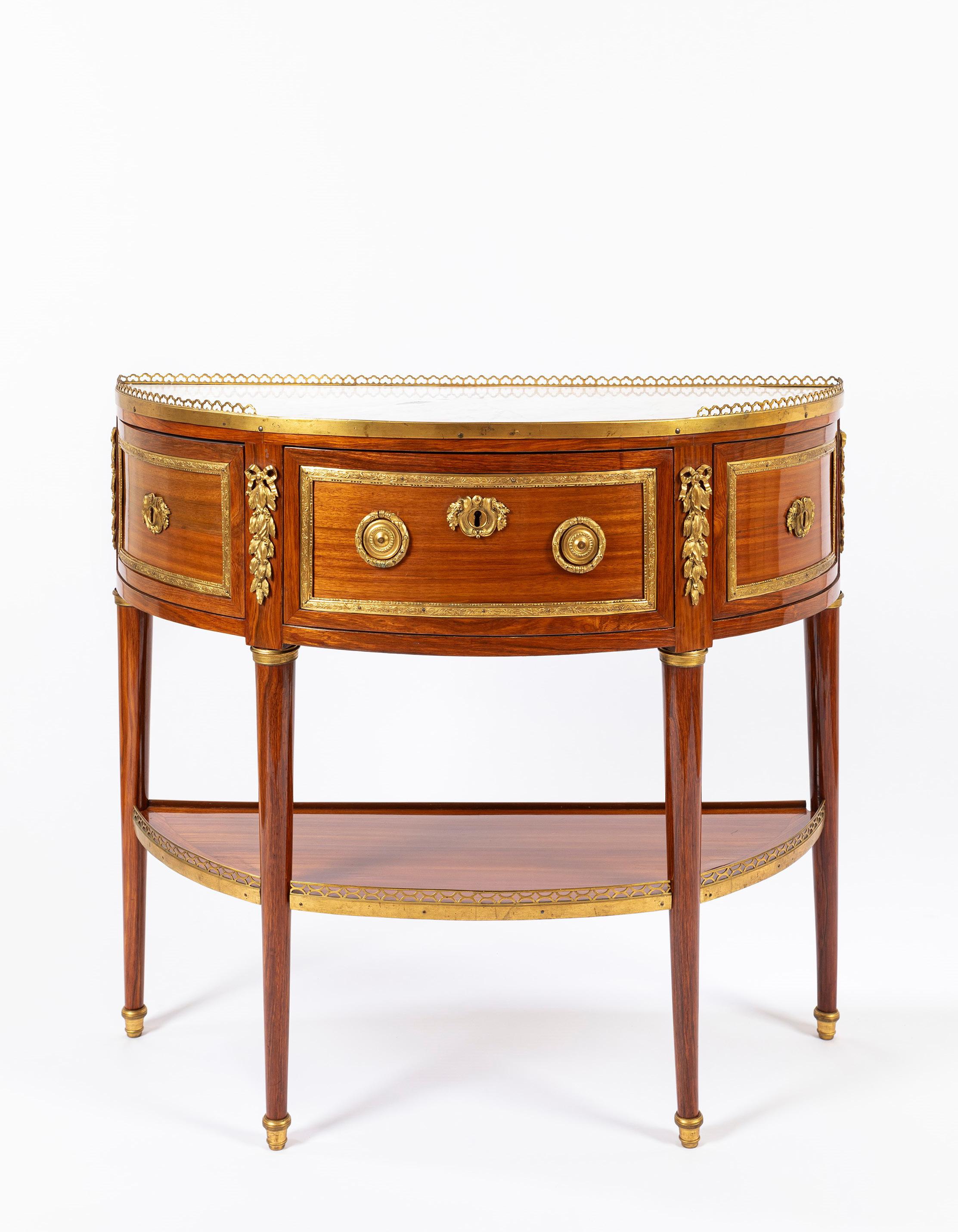 la forma a mezzaluna, piano in marmo screziato pesca, un cassetto alla fascia decorato da applicazioni in bronzo dorato a motivi concentrici e a volute fogliate, due cassetti pannellati, gambe piramidali con scarpette in bronzo dorato poggianti su sfera, Il grembiale ornato da fregio con mascherone leonino sormontato da vaso tra volute probabilmente aggiunto (restauri)