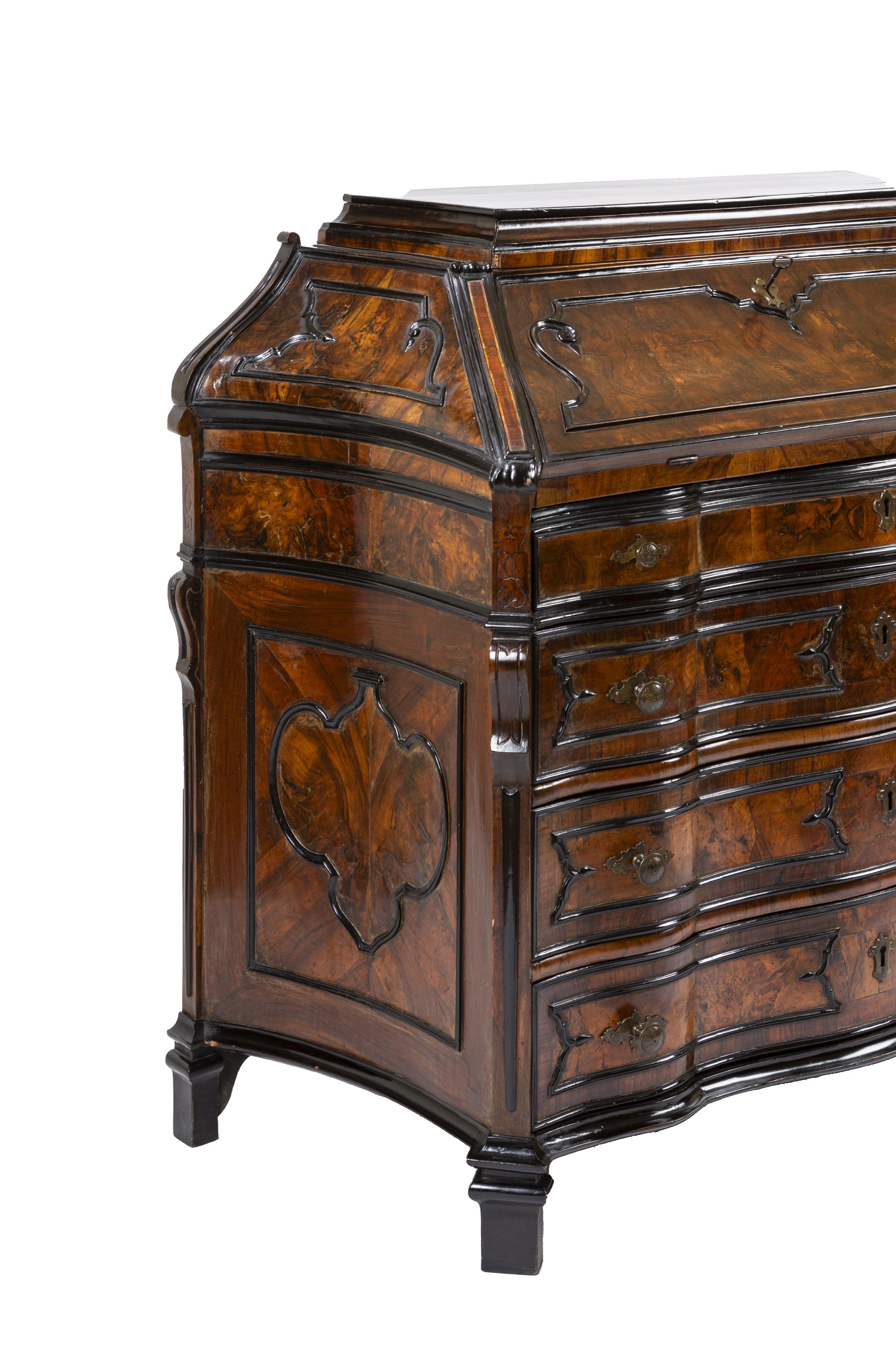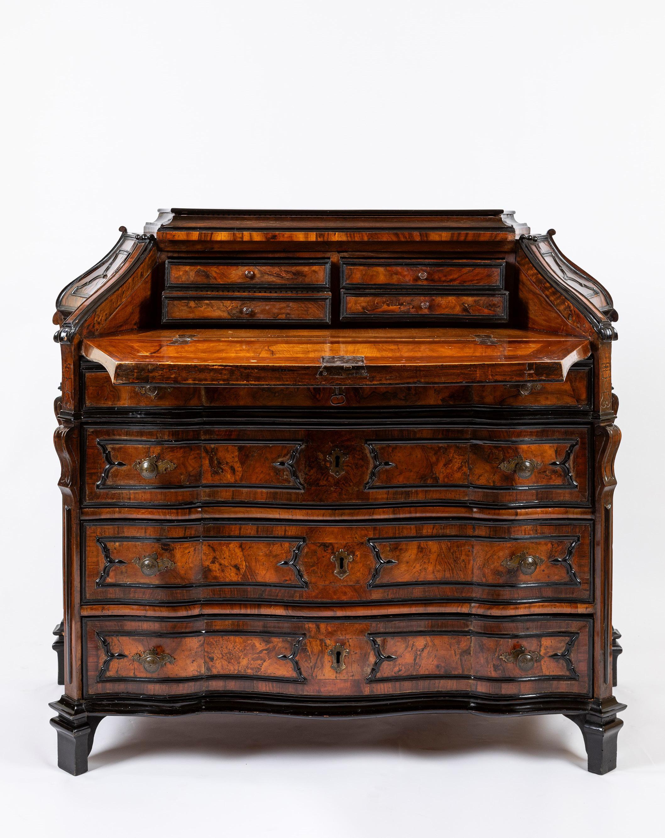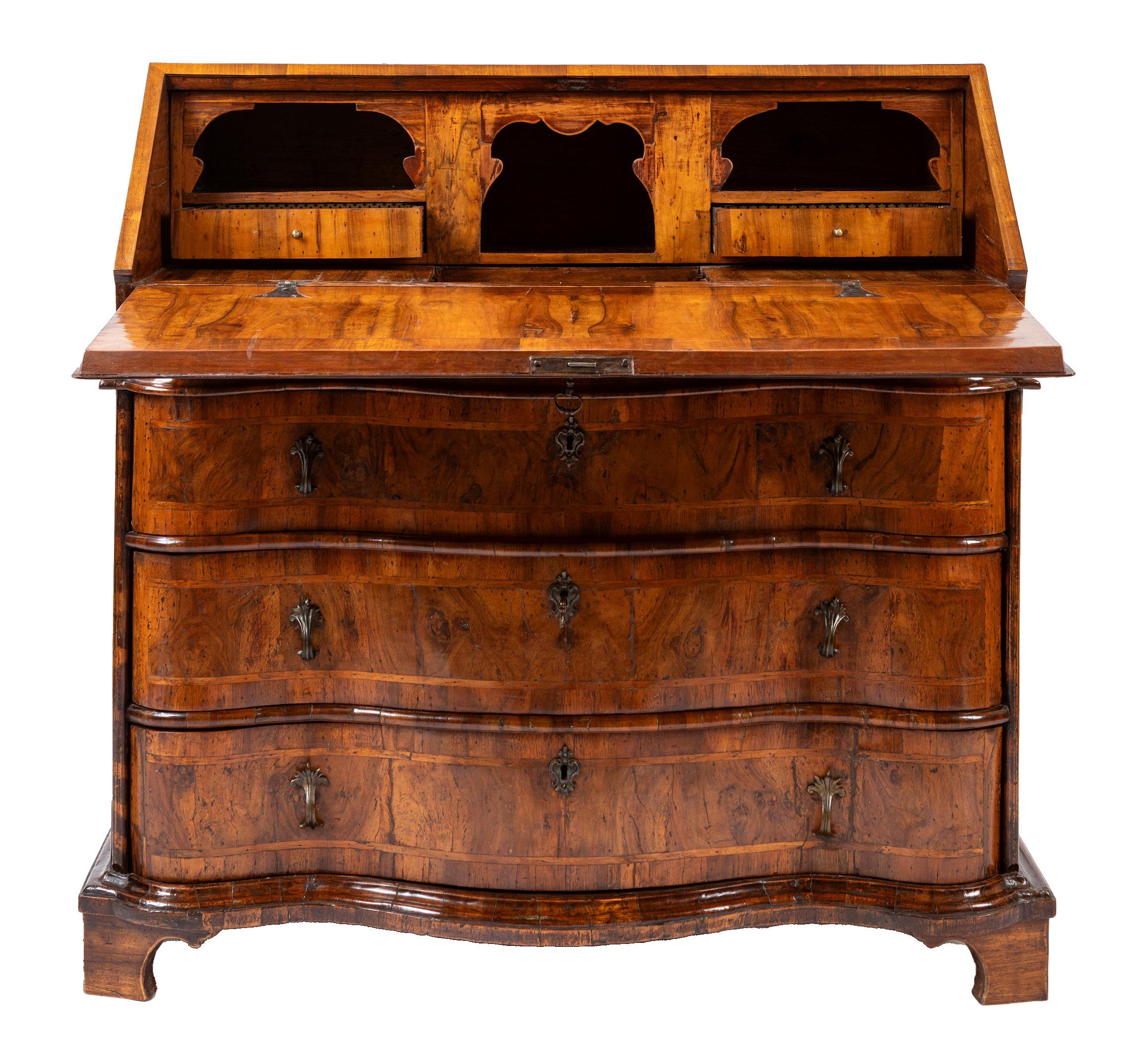 la forma a mezzaluna, piano in marmo screziato pesca, un cassetto alla fascia decorato da applicazioni in bronzo dorato a motivi concentrici e a volute fogliate, due cassetti pannellati, gambe piramidali con scarpette in bronzo dorato poggianti su sfera, Il grembiale ornato da fregio con mascherone leonino sormontato da vaso tra volute probabilmente aggiunto (restauri)
