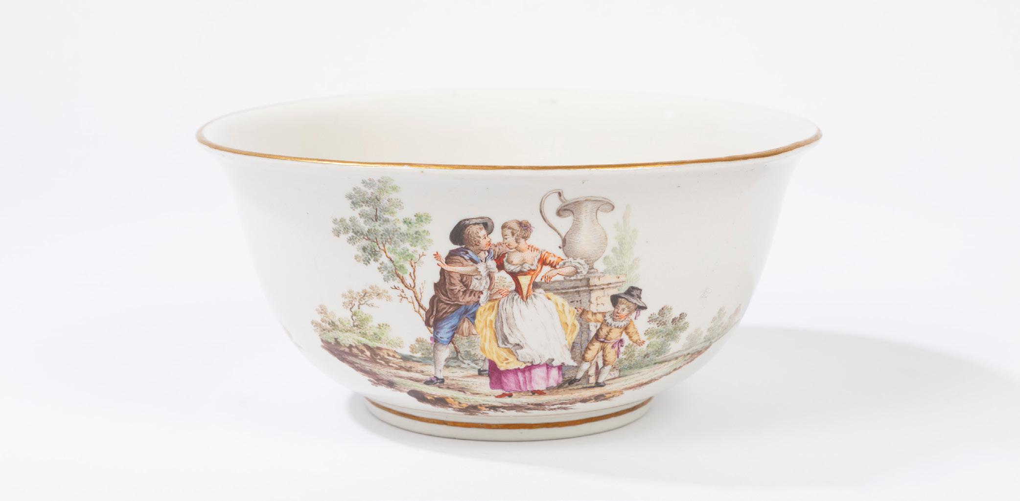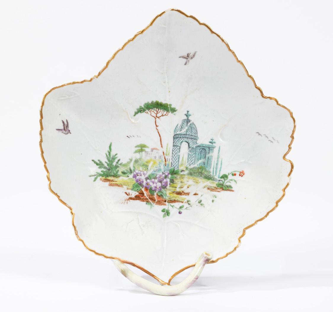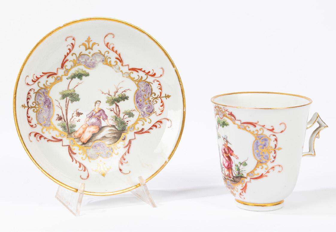 Il decoro alla Sassone è tipico della manifattura di Doccia tra il 1755 e il 1770. Questa decorazione viene in particolare collegata alla produzione del pittore Angelo Fiaschi attivo a Doccia dal 1738 al 1775 come pure al pittore Simone Villoresi, attivo nella manifattura tra il 1759 ed il 1778. Nel corso degli anni il decoro rimane simile nella formula a cartiglio di volute e racemi ma le figure di dignitari asiatici, derivate dalle iconografie di Meissen, vengono abbandonate per lasciare spazio nell’ultimo quarto del Settecento a scene di vita pastorale tratte dal mondo dell’Arcadia e della mitologia. Per confronto si veda: G. Morazzoni, Le porcellane italiane, Milano, 1960, tav. 207 a.