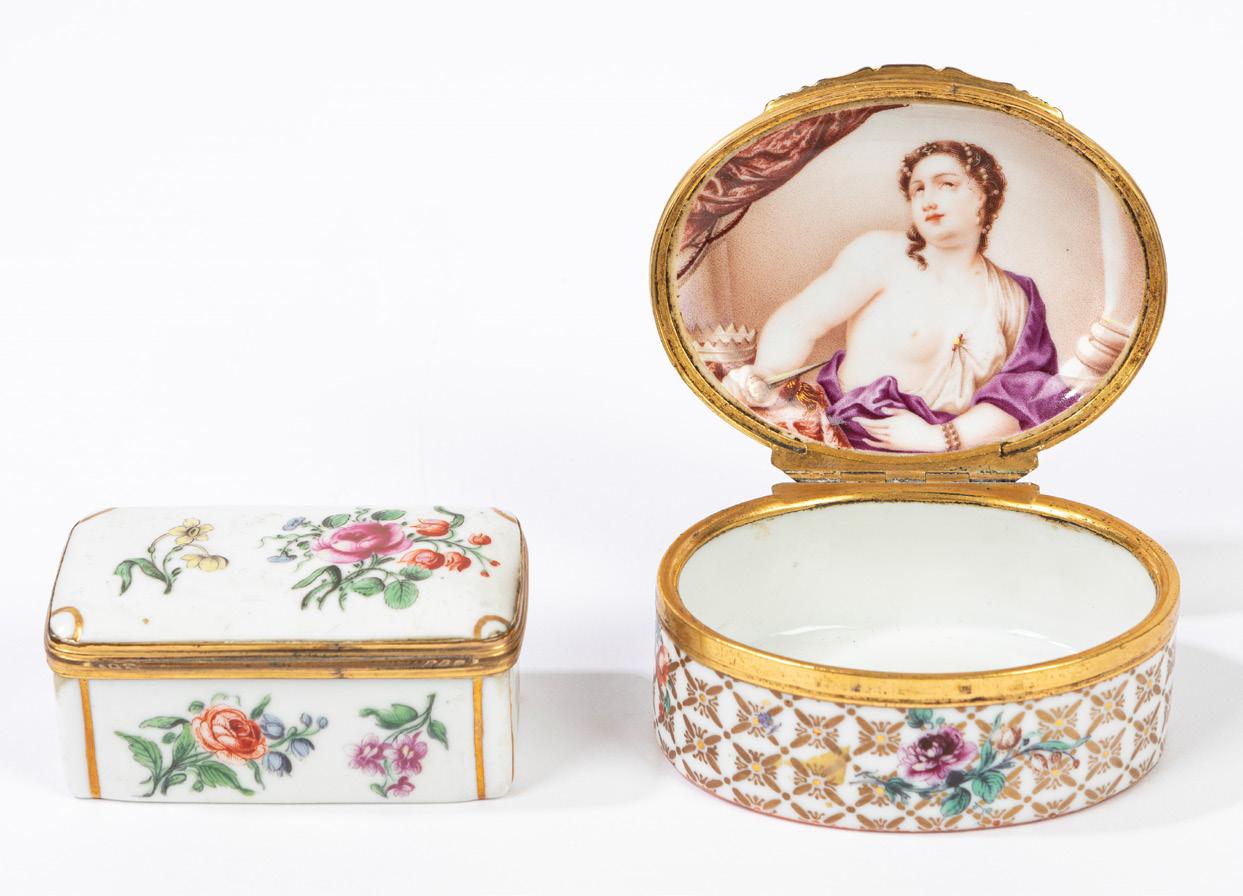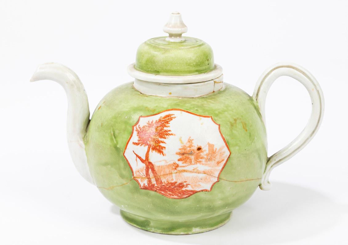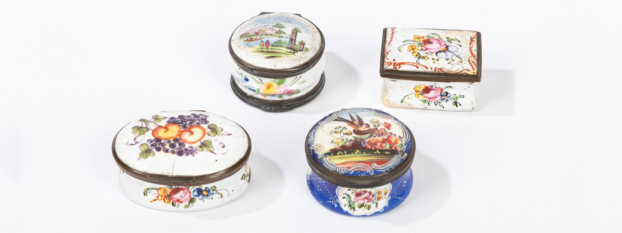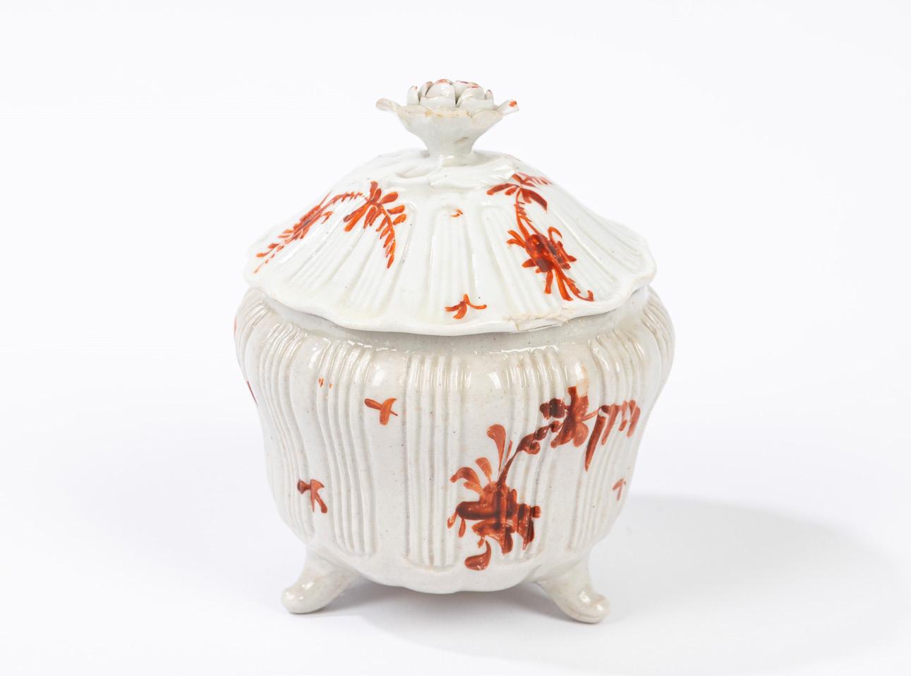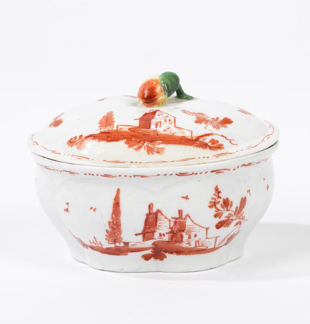 Zuccheriera con coperchio in porcellana a monocromo porpora, Manifattura Antonibon, Nove, circa 1780 h cm 7; l cm 10 di forma lobata e decorata con paesaggi e ornati rocaille, presa a bocciolo (difetti e restauri)