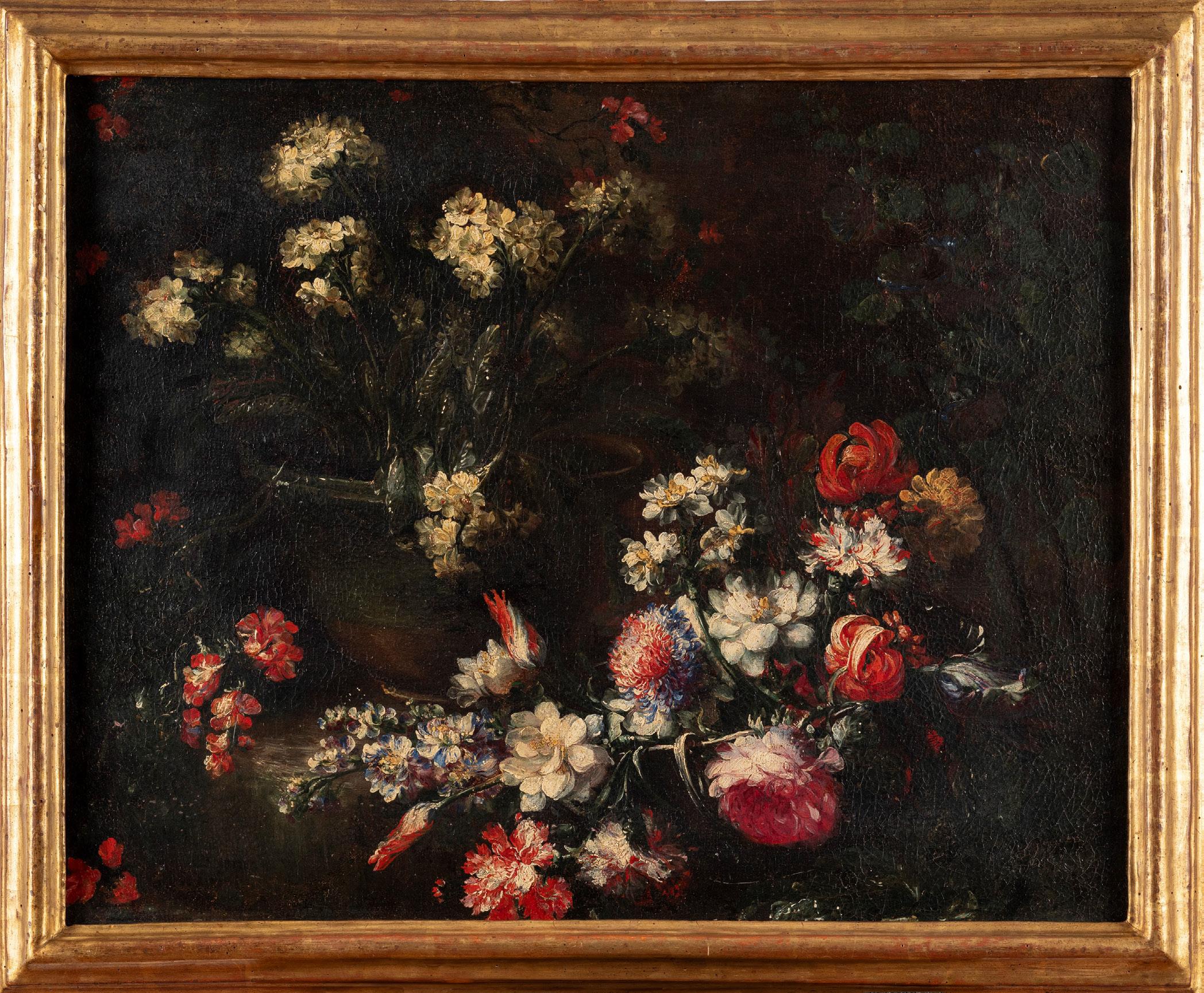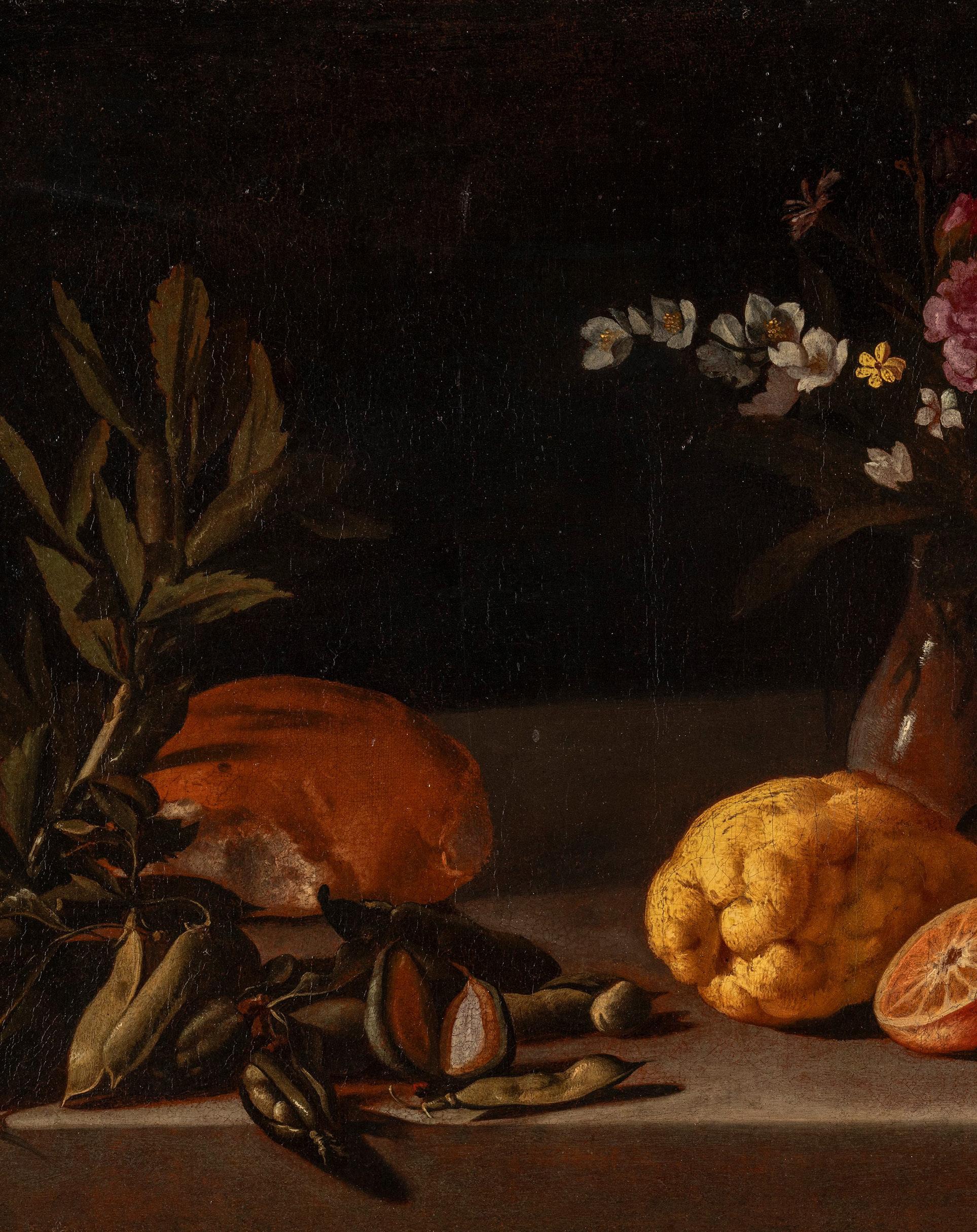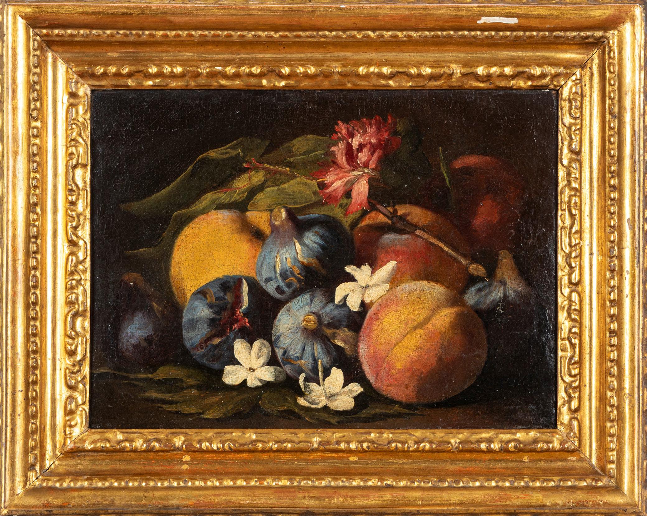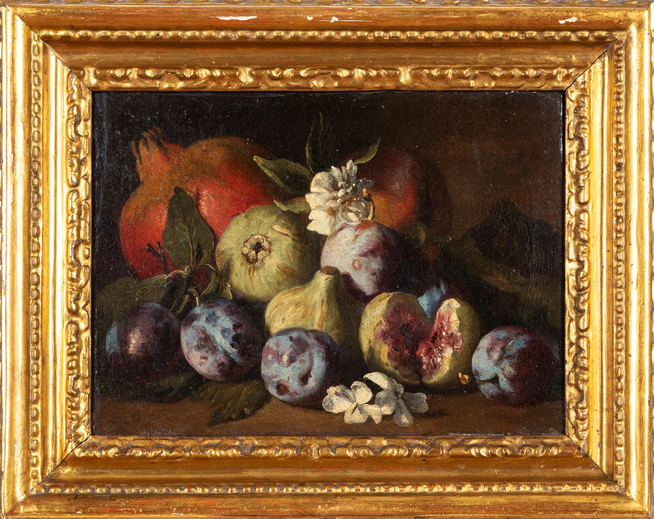 Fichi, prugne, melograno e fiori; Fichi, pesche e fiori coppia, olio su tela