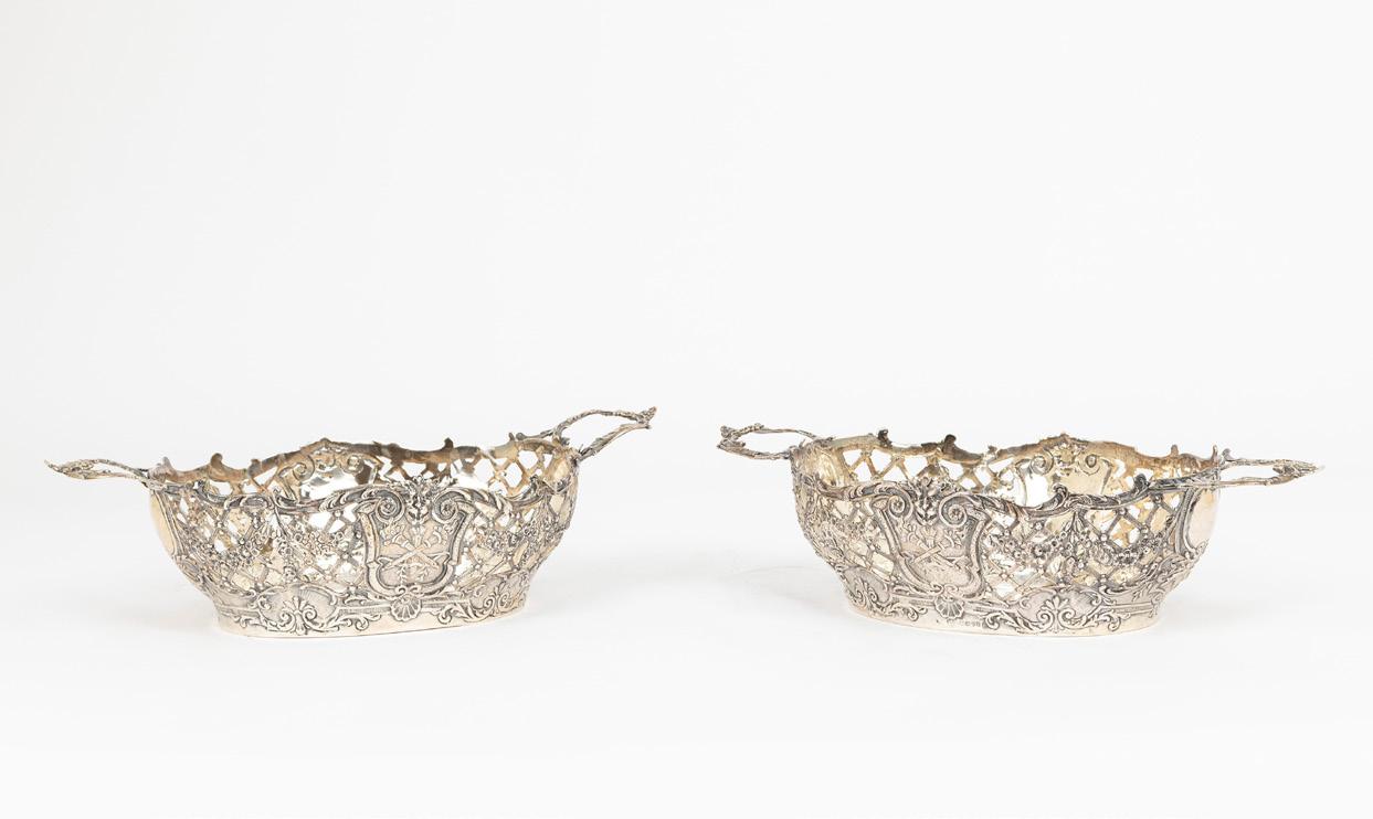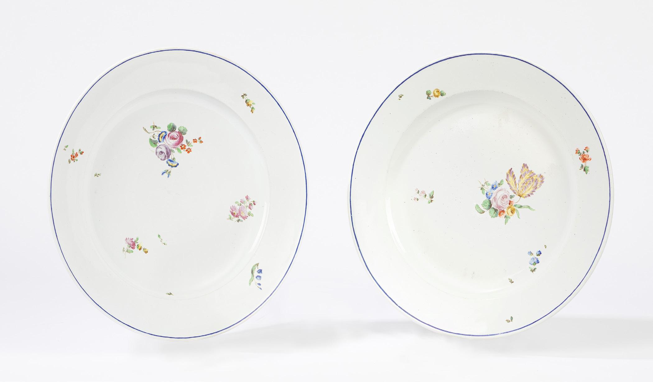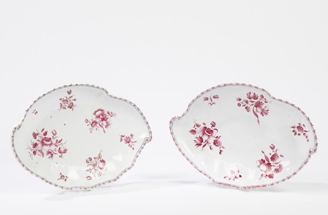 Coppia di marescialle in porcellana in monocromia porpora, Manifattura Ginori a Doccia, circa 1790 l cm 29,5 con bordo mosso filettato in blu di cobalto, decorate a mazzi di fiori sparsi (lievi difetti)