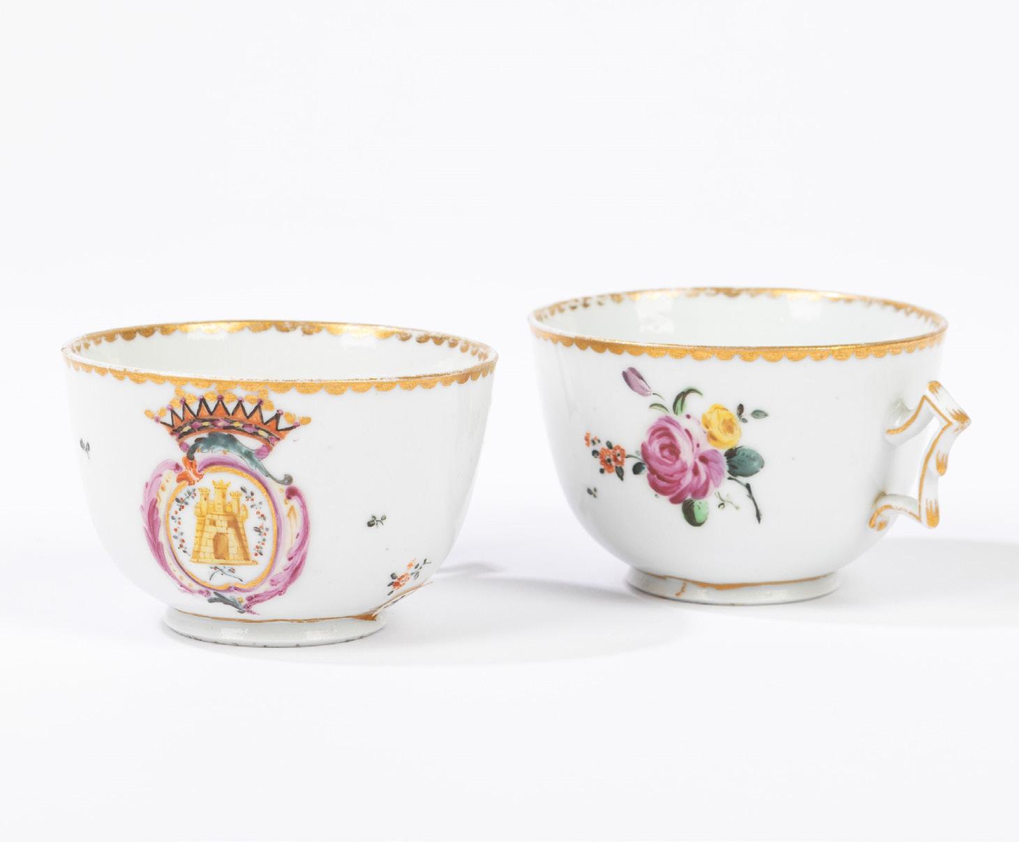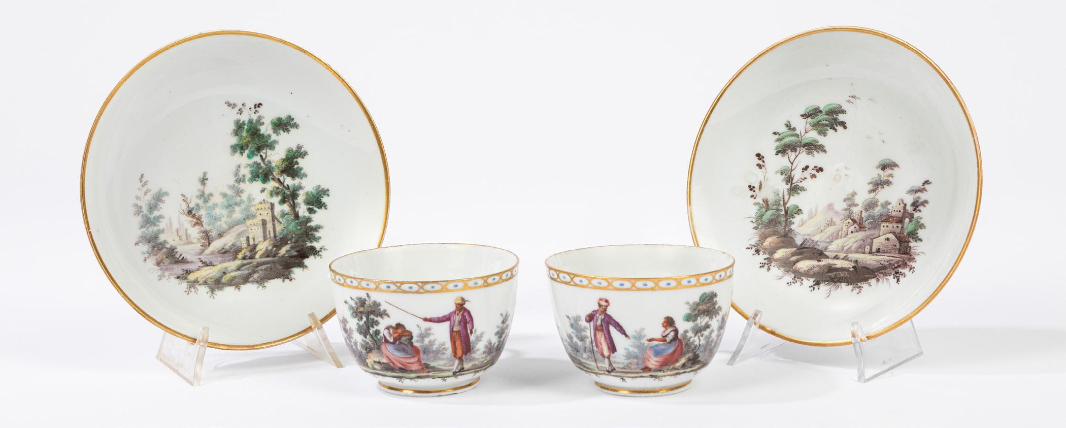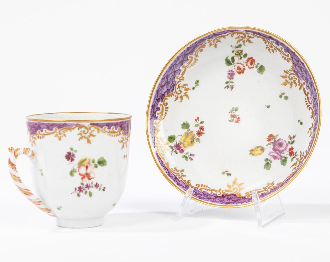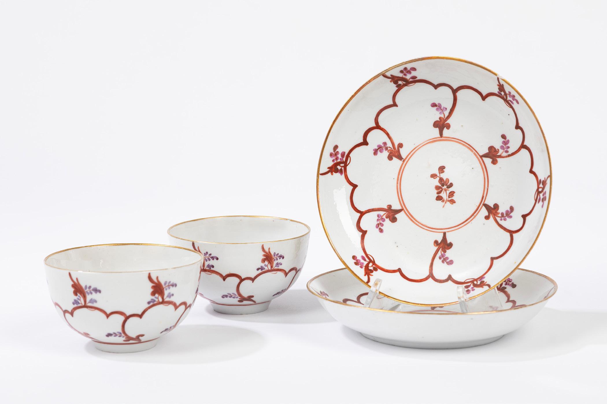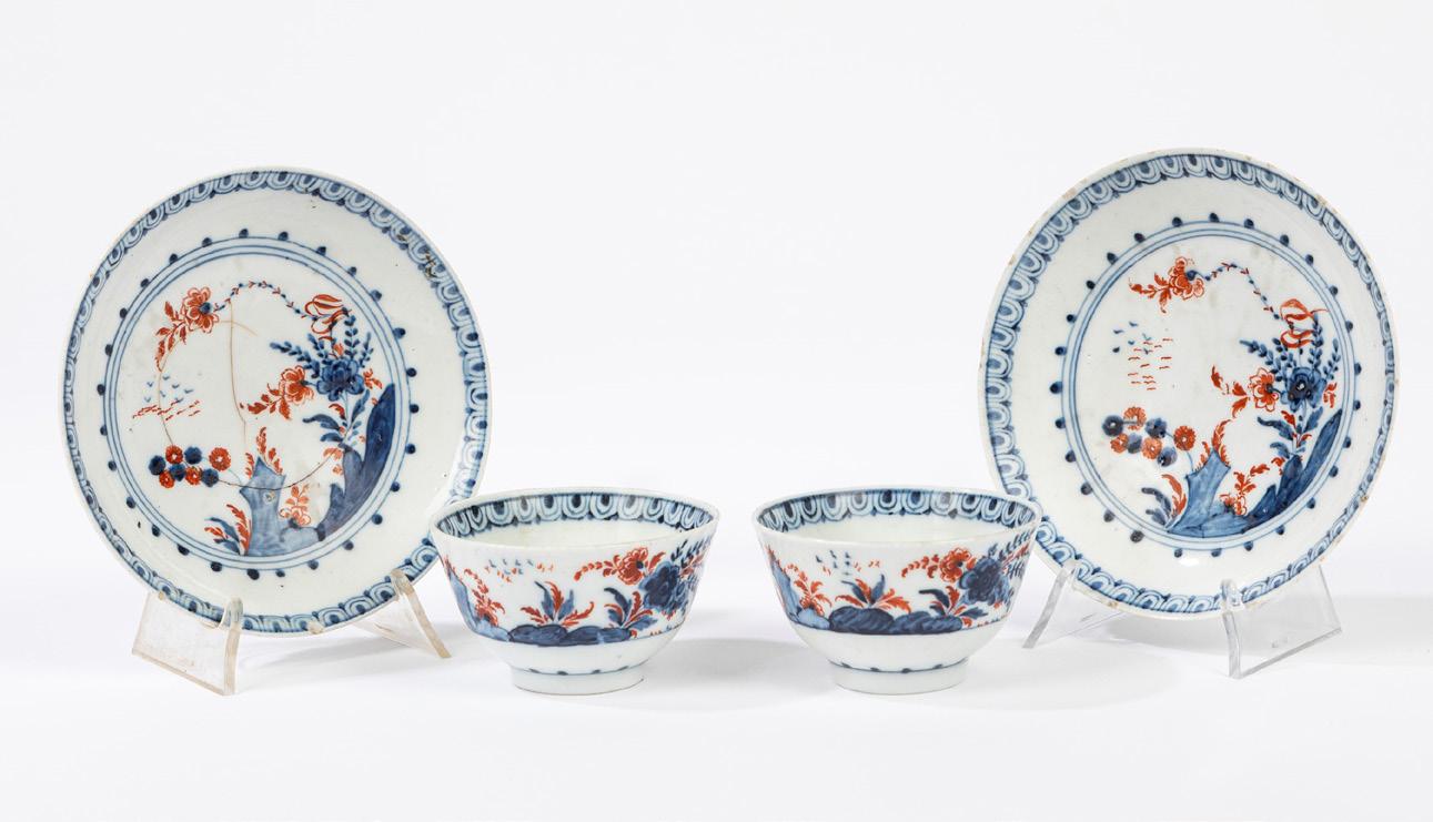 Coppia di tazze con piattino in porcellana policroma. Manifattura di Geminiano Cozzi, Venezia, circa 1770 h cm 4,3; d cm 12,5 profili dorati, decorate con motivo di origine orientale detto a “feston e cadena” in rosso-ferro con ramoscelli di glicine in porpora, marca di fabbrica sotto le basi (lieve sbeccatura al profilo di un piattino)