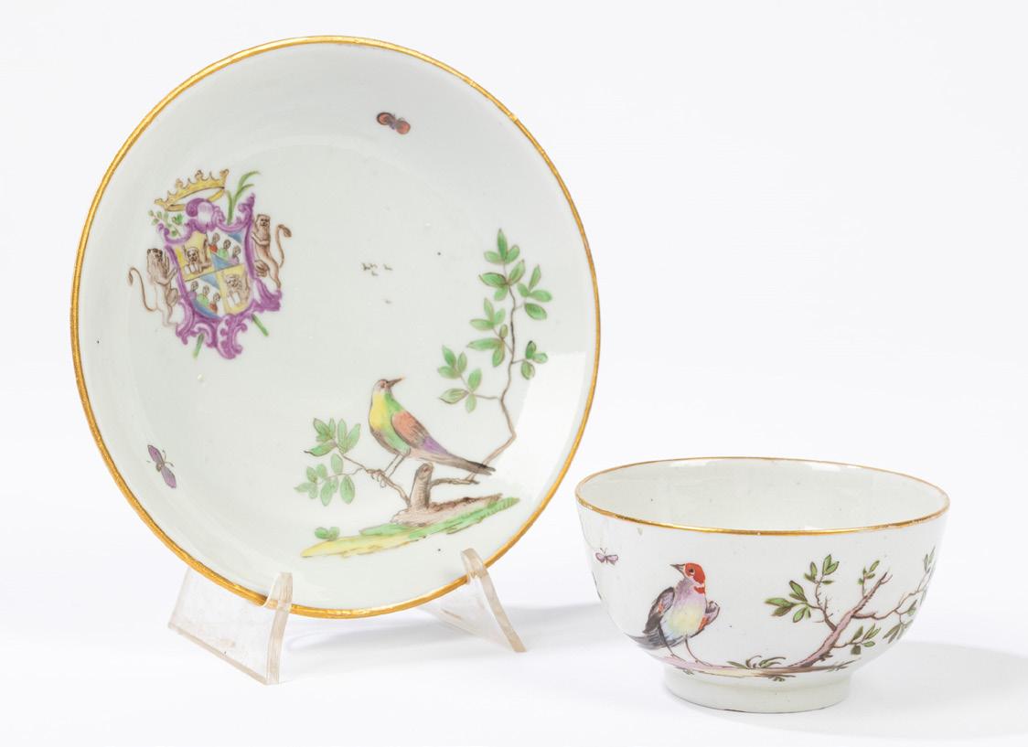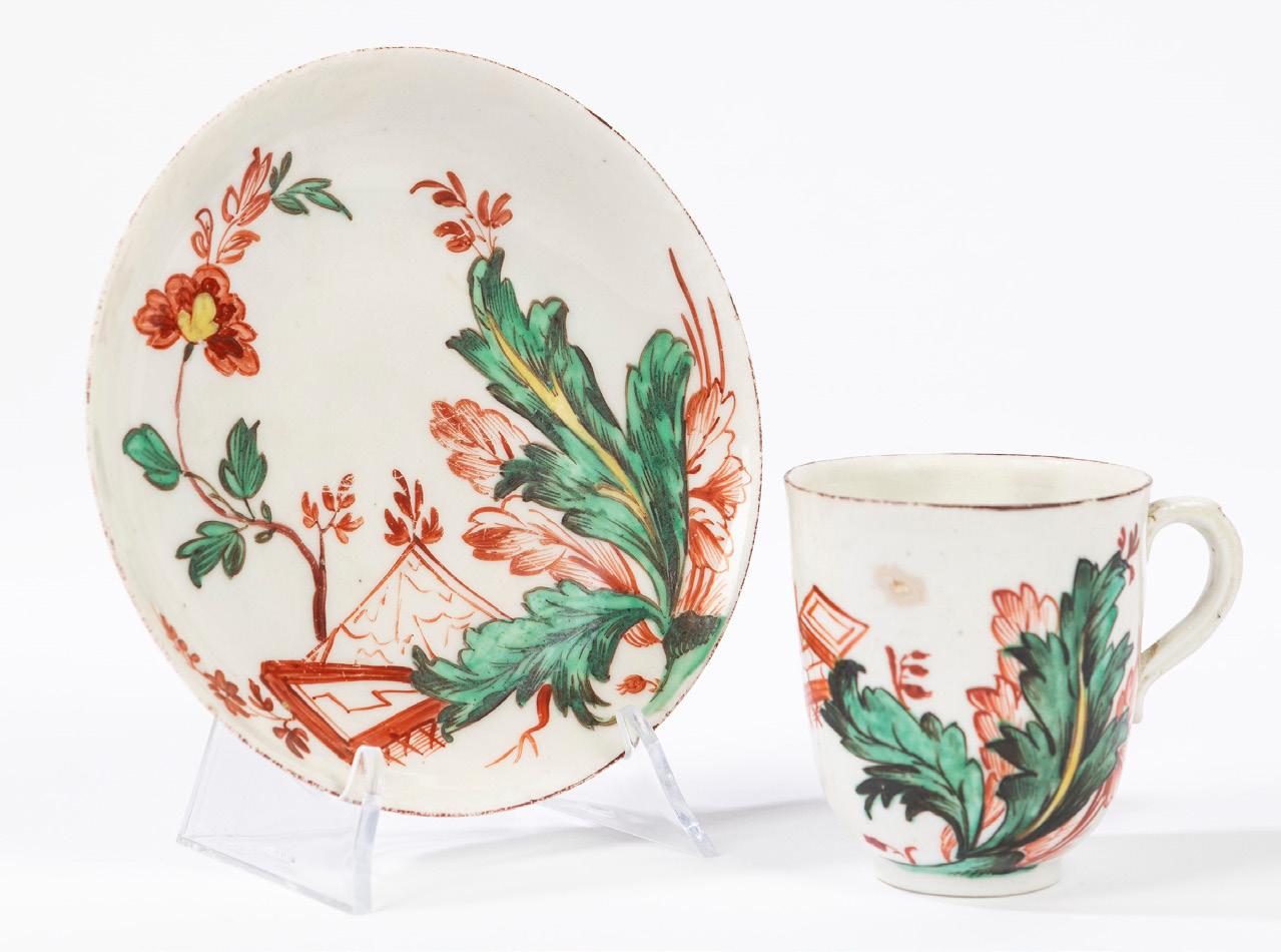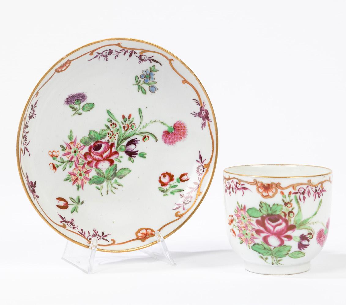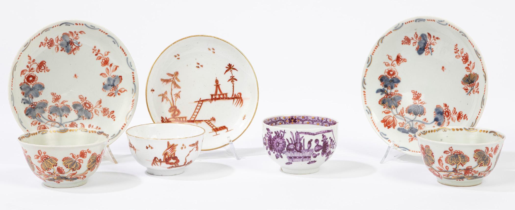 Coppia di tazze con piattino in porcellana policroma. Manifattura di Geminiano Cozzi, Venezia, circa 1770 h cm 4,3; d cm 12,5 profili dorati, decorate con motivo di origine orientale detto a “feston e cadena” in rosso-ferro con ramoscelli di glicine in porpora, marca di fabbrica sotto le basi (lieve sbeccatura al profilo di un piattino)