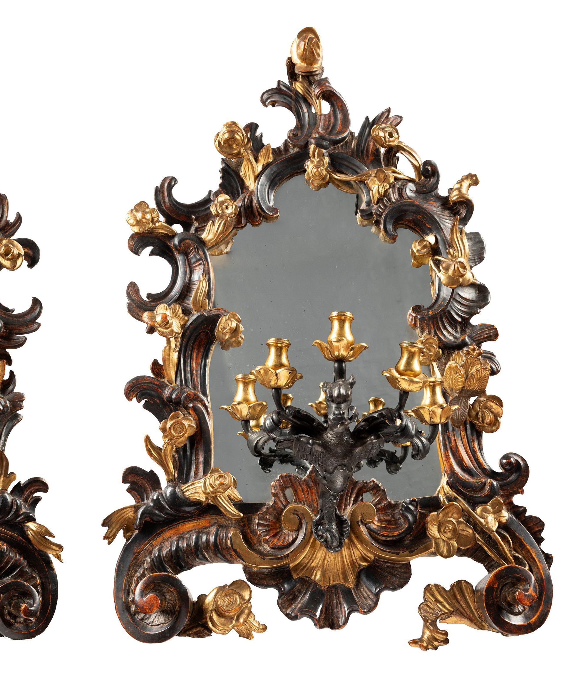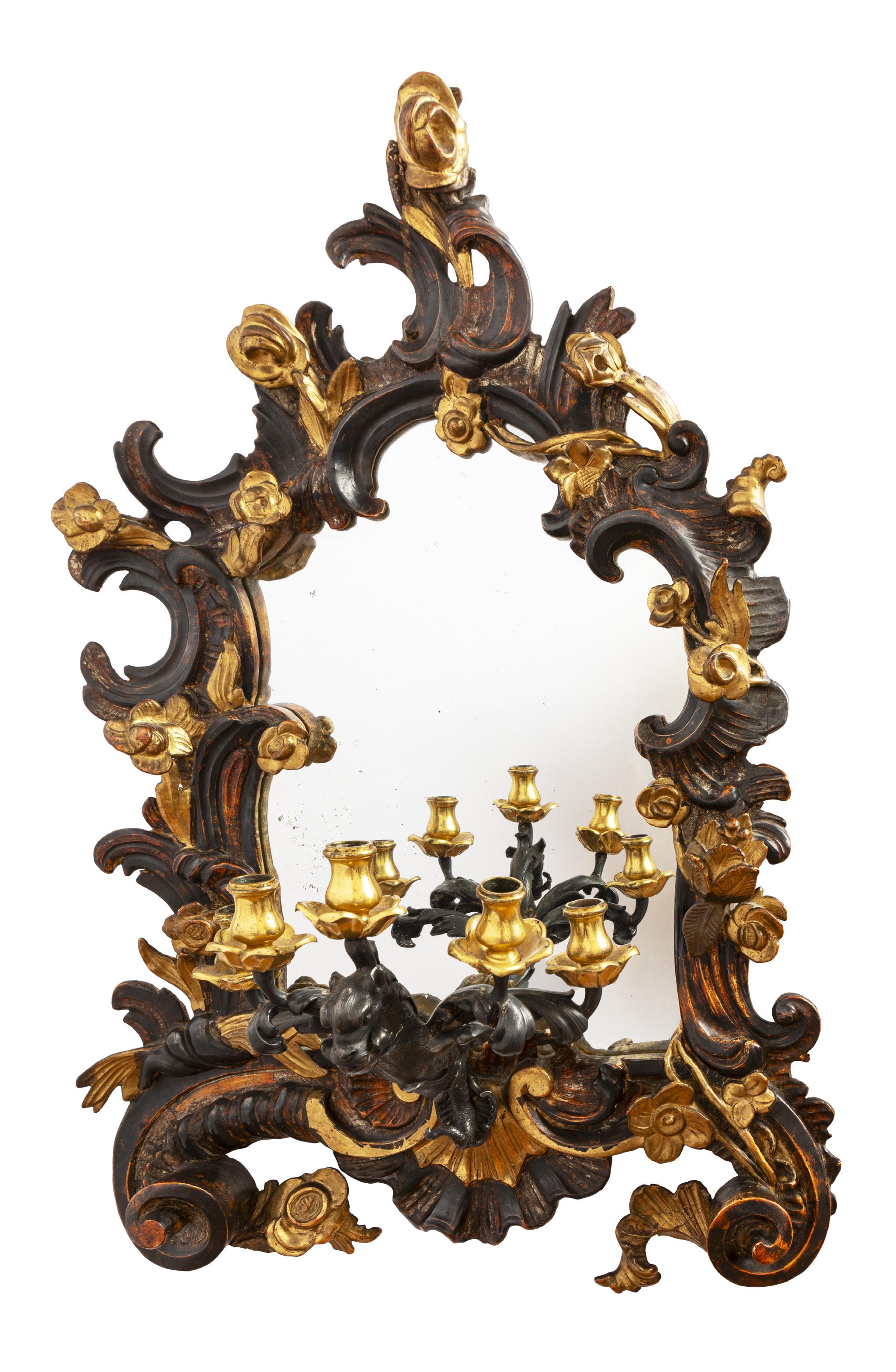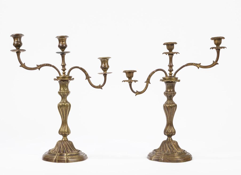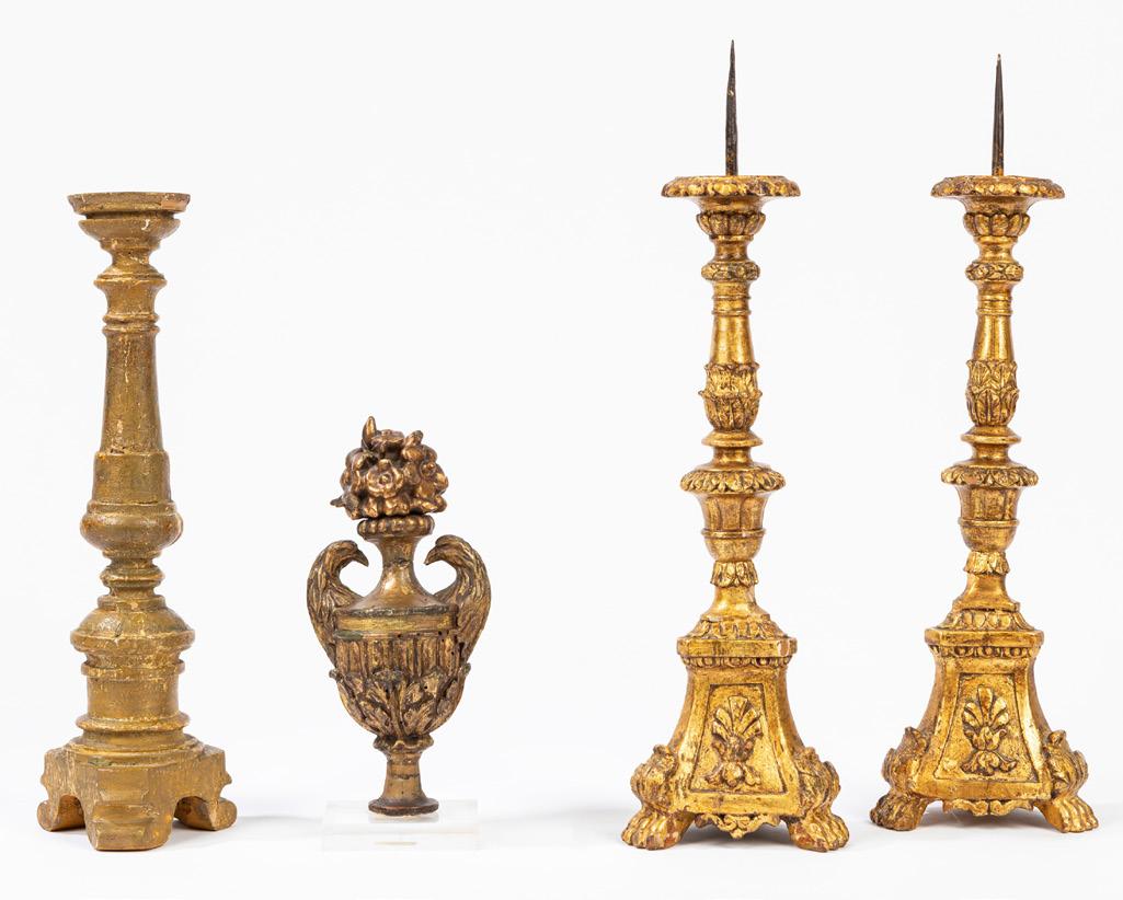 Lotto composto da una coppia di torciere da tavolo, un candeliere ed un finale in legno intagliato e dorato, secolo XVIII