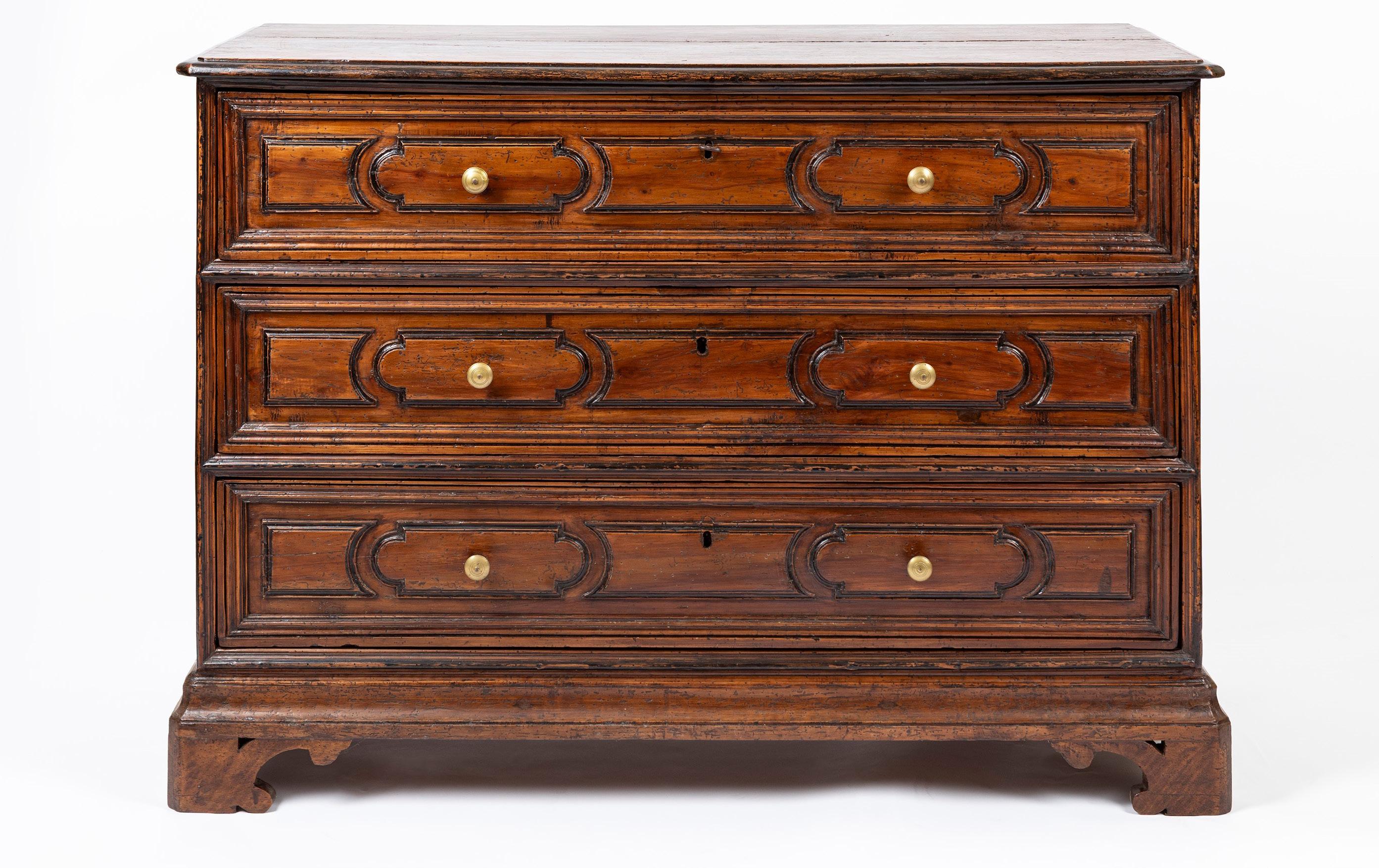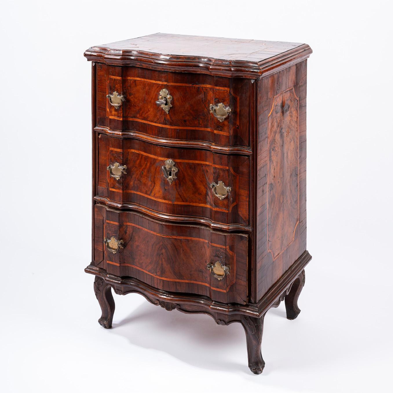 Piccola commode lastronata e filettata in legni di frutto, amaranto e sicomoro, stampigliata F. Reizell, Francia, fine secolo XVIII