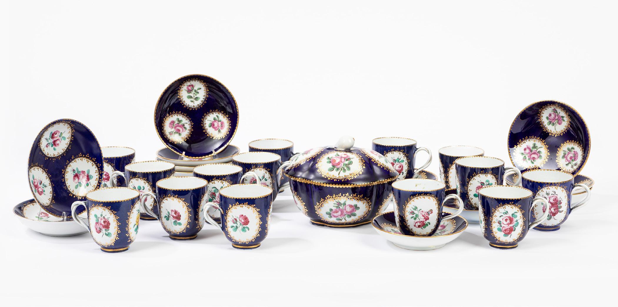 Lotto di quattordici tazzine con piattino ed una zuccheriera, Ginori a Doccia, fine XVIII secolo decoro di impronta francese alle “roselline” entro riserve a racemi dorati su fondo blu, la zuccheriera di forma mossa con presa a frutto, le anse delle tazzine a cordoli intrecciati, marca di fabbrica alla base della zuccheriera e di dieci piattini (i piattini più tardi, una tazza ricomposta)