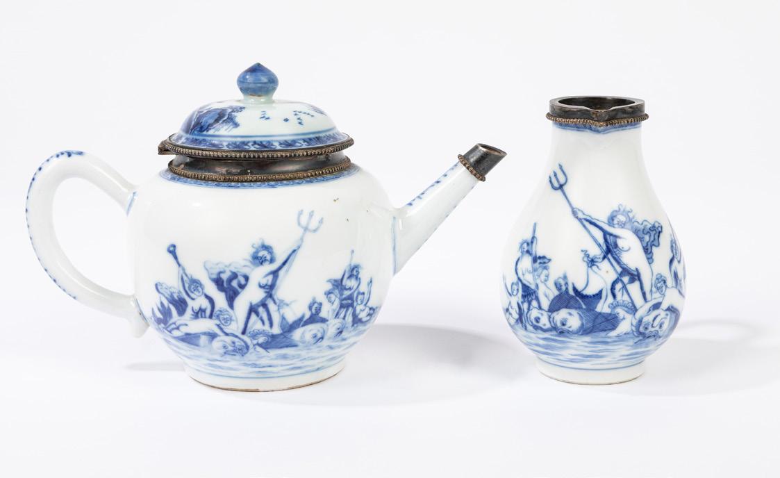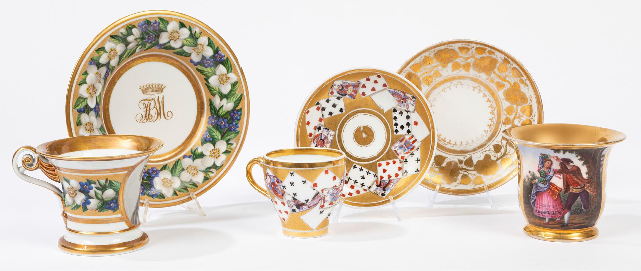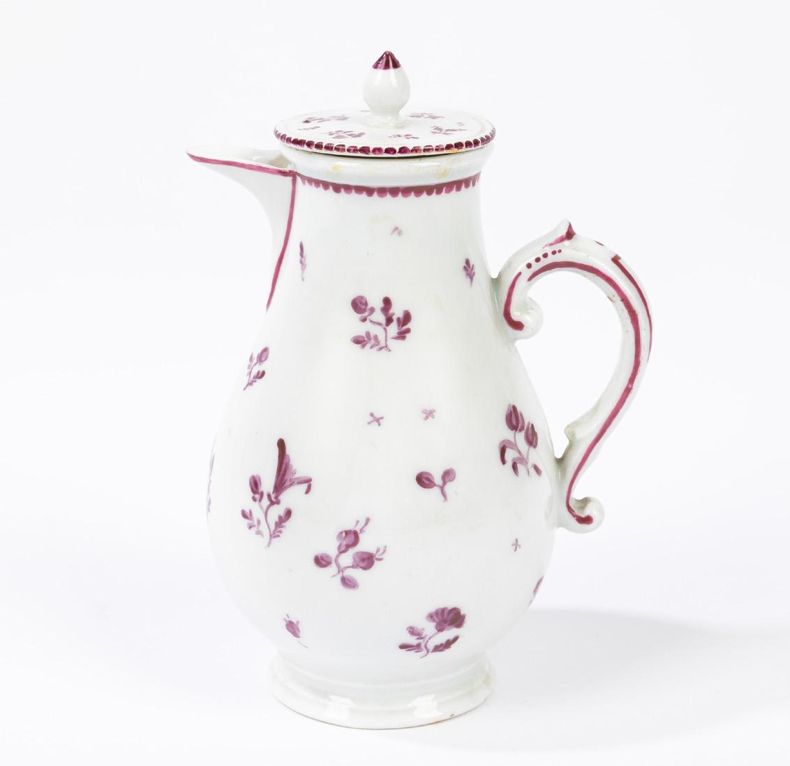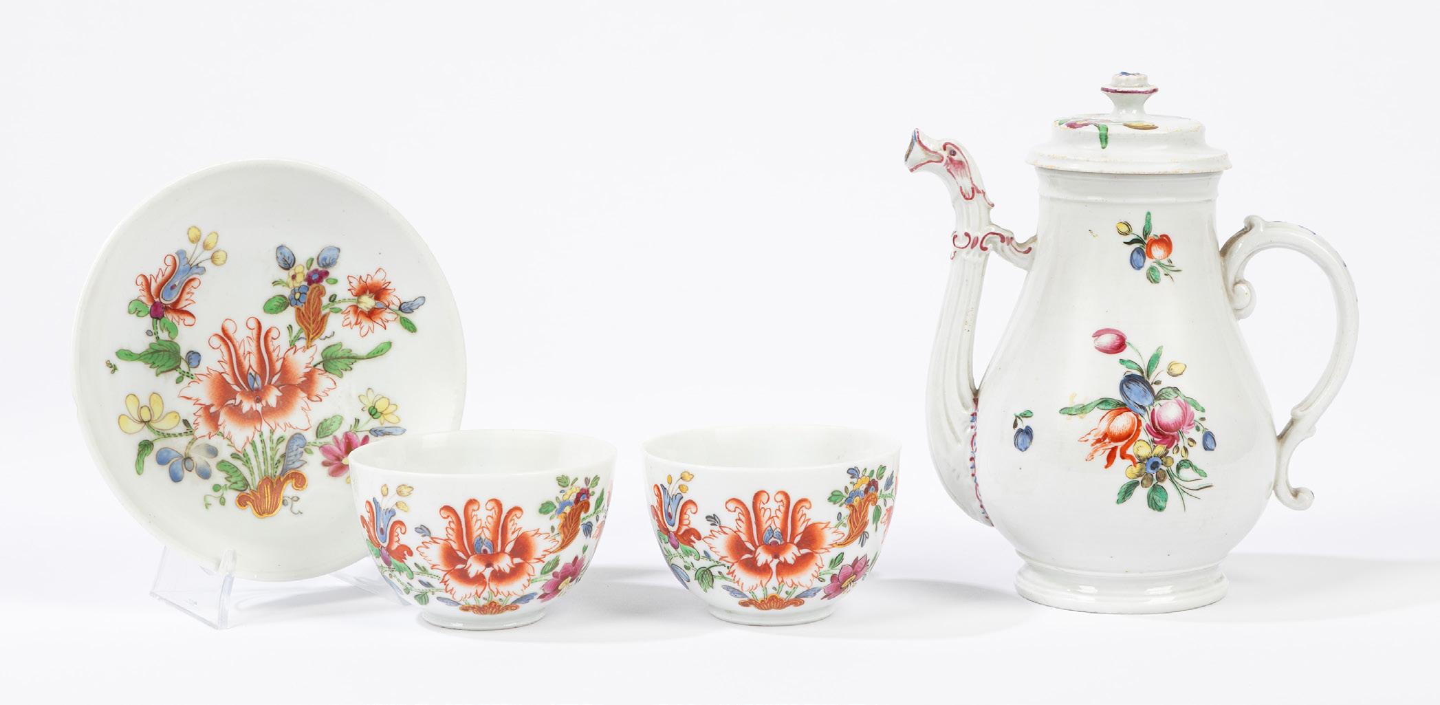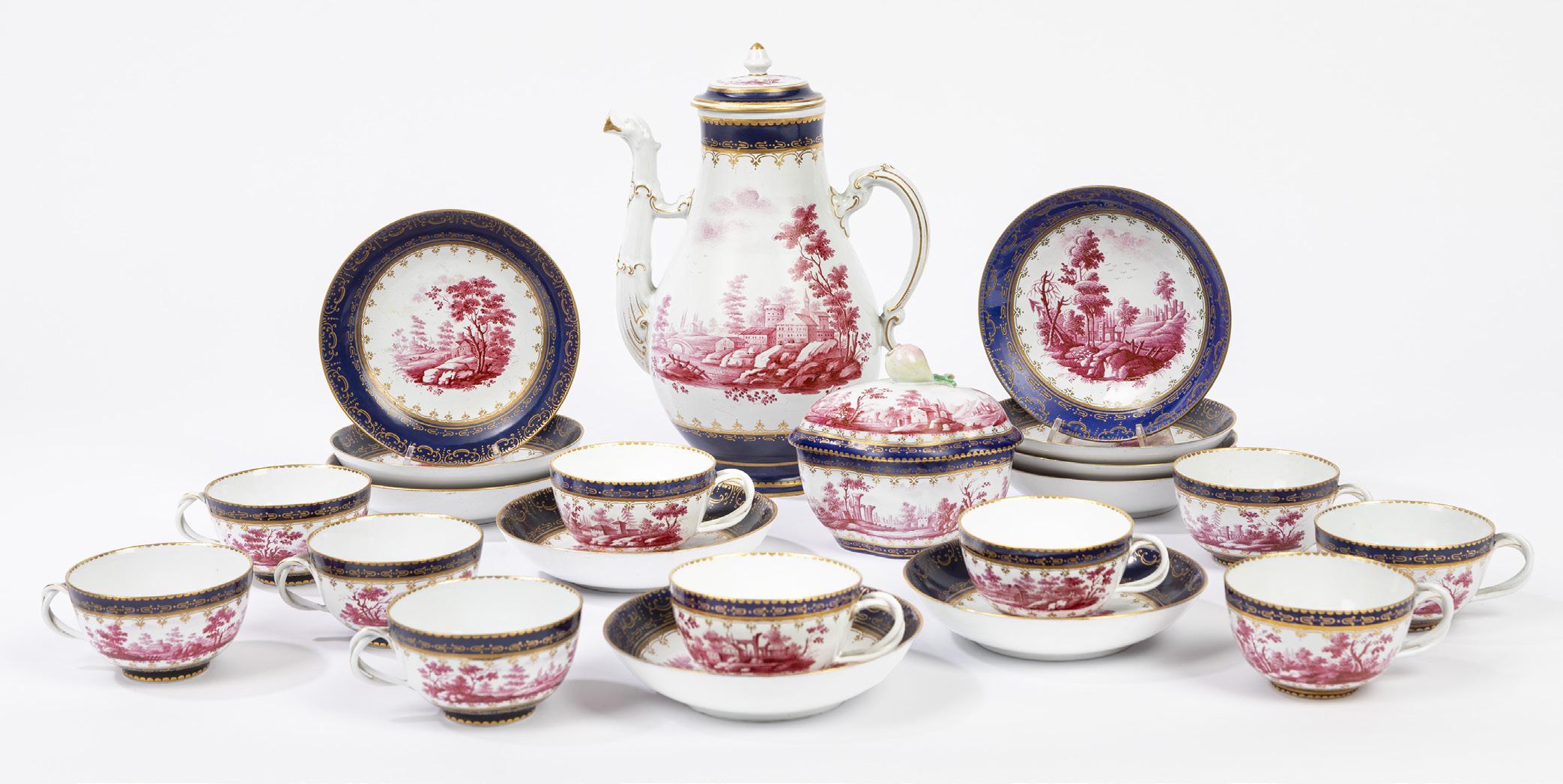 Parte di servizio da caffè in porcellana policroma, Manifattura Ginori a Doccia, circa 1790 composto da caffettiera, zuccheriera e dieci tazze con piattino. Decoro a “paesi in porpora rossa” entro bordi blu con motivi dorati a rilievo, la caffettiera con versatoio zoomorfo ed ansa a doppia voluta, la zuccheriera di forma mossa e bombata con presa del coperchio a frutto, le anse delle tazze a racemi intrecciati (lievi difetti)