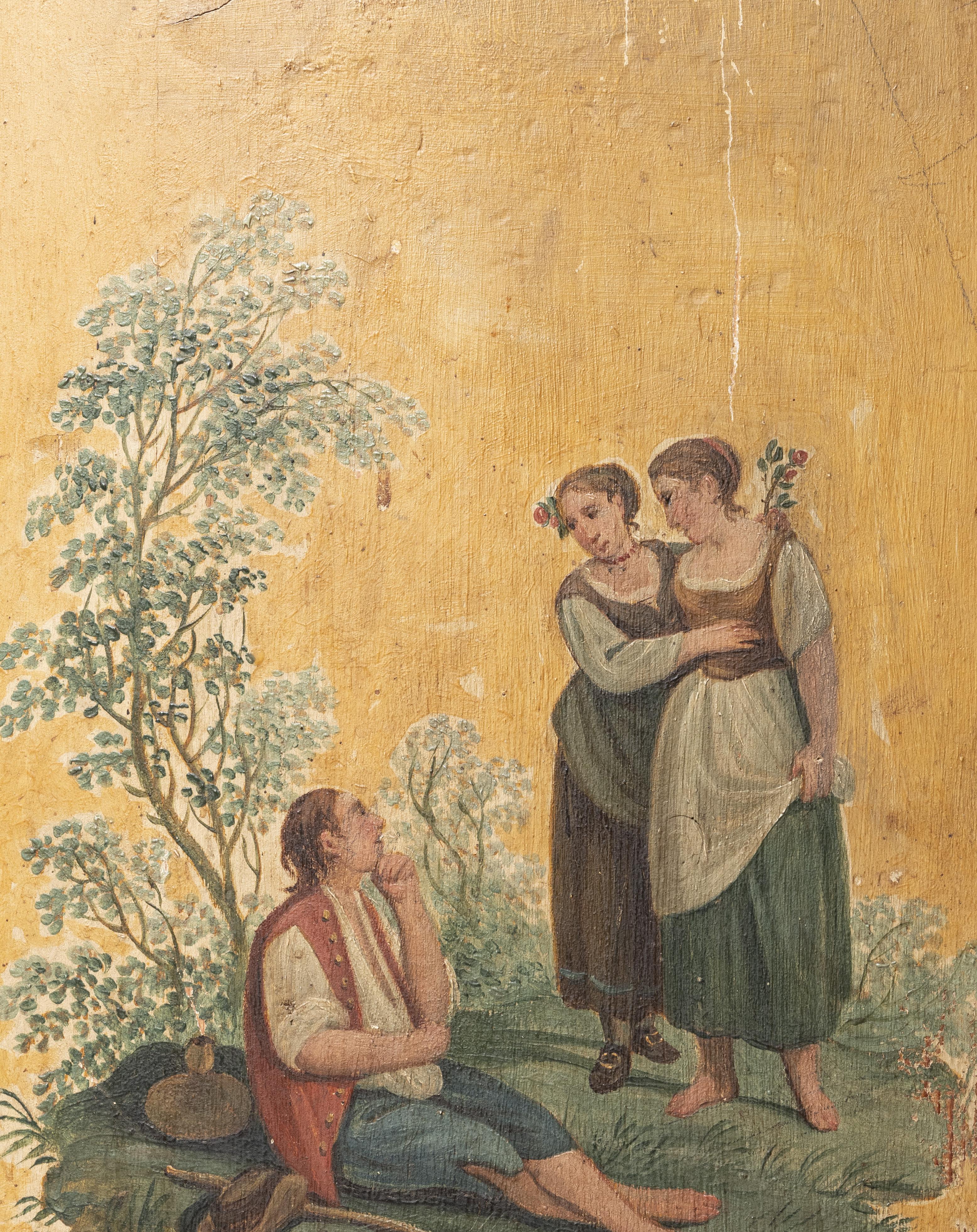 Contadino con cesta di vimini e Pastore con bastone coppia, olio su tavola tonda diametro cm 36 ciascuno