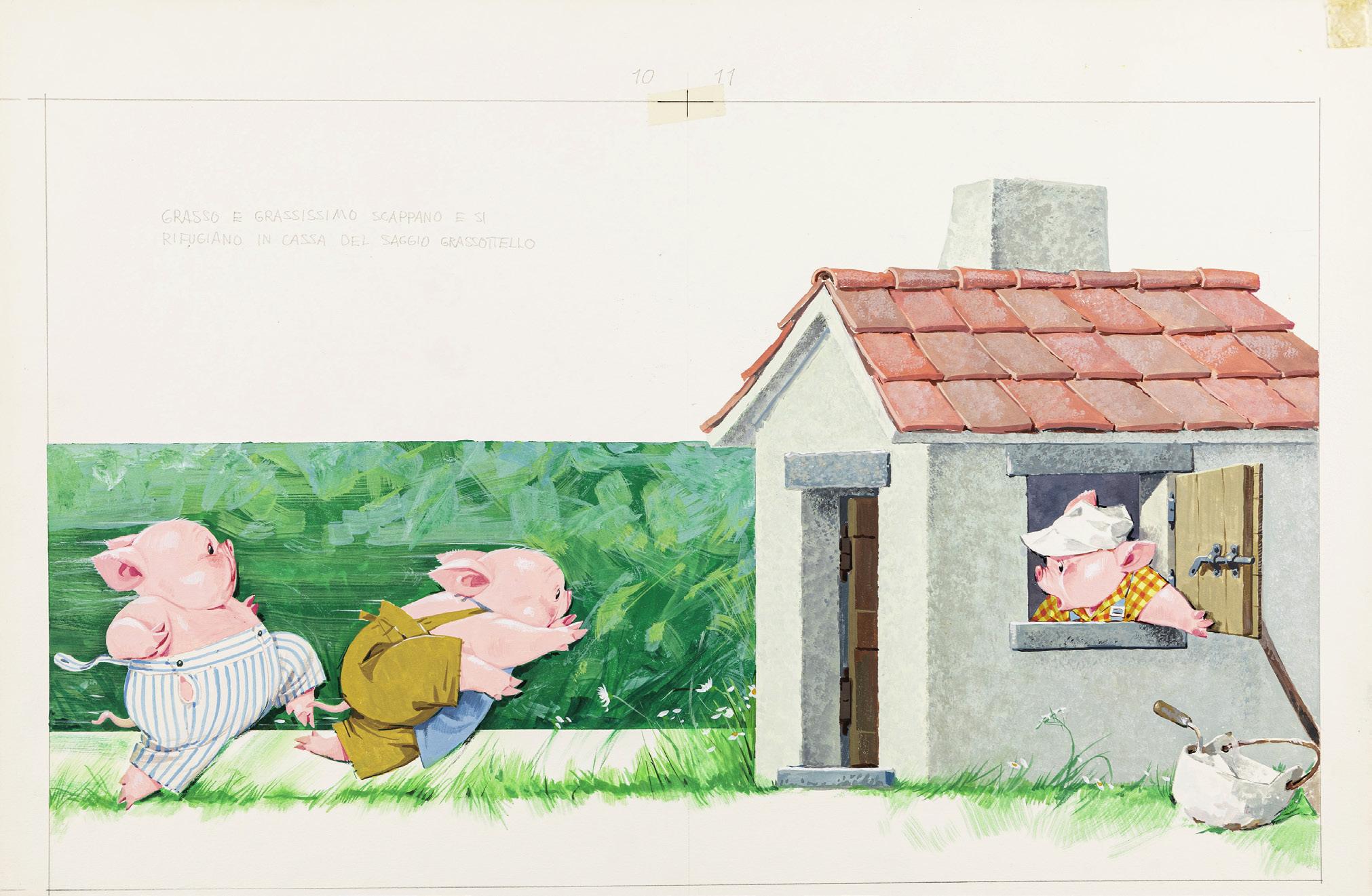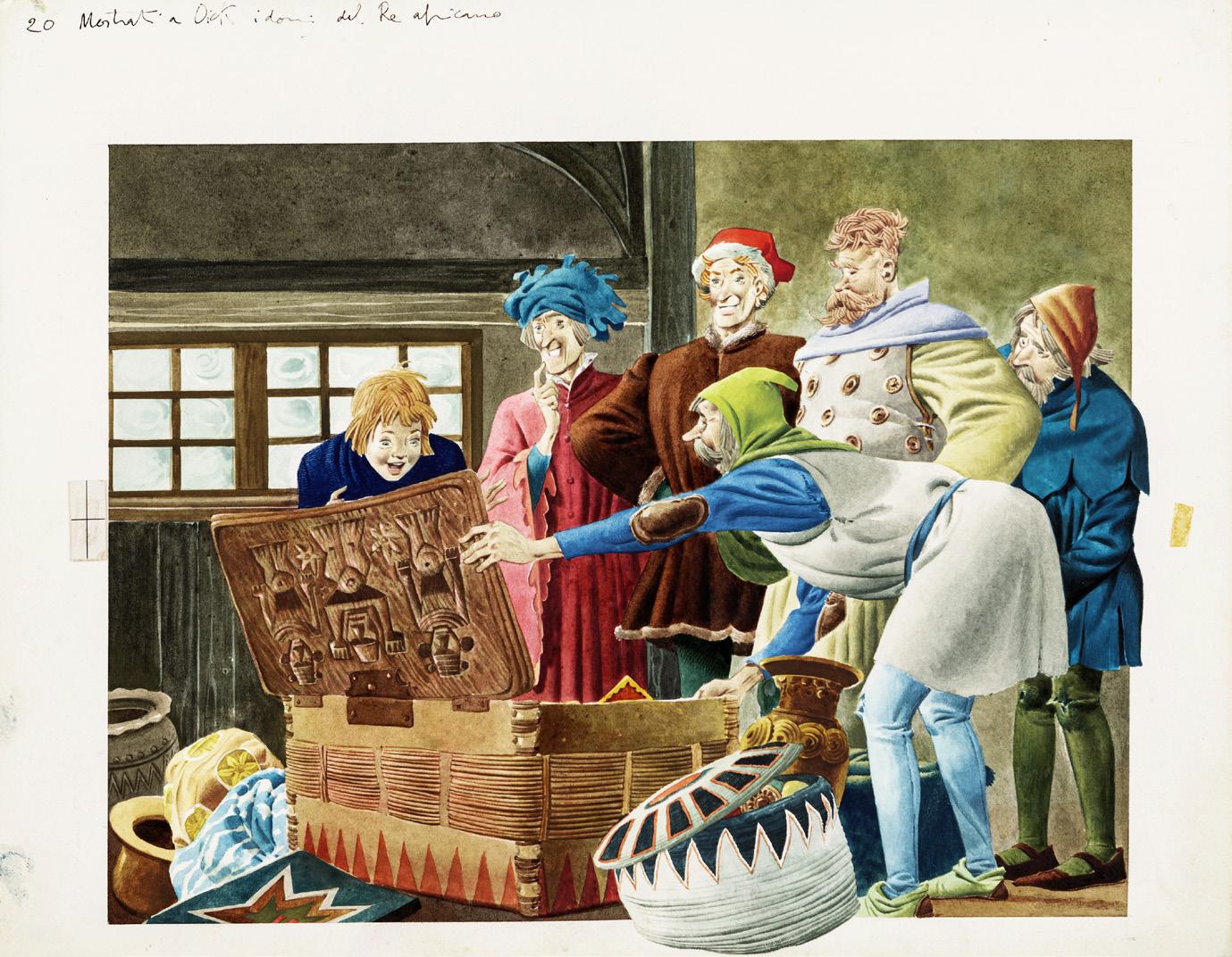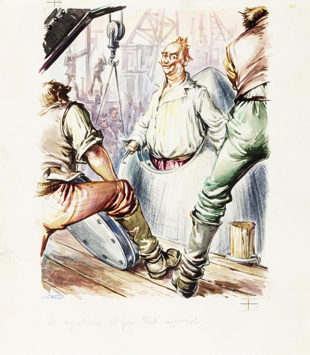 Tempera on cardboard. Original illustration done by Sergio for his famous interpretation of “The Adventures of Pinocchio” by Carlo Collodi, published between 1961 and 1965. Signed and dated.
