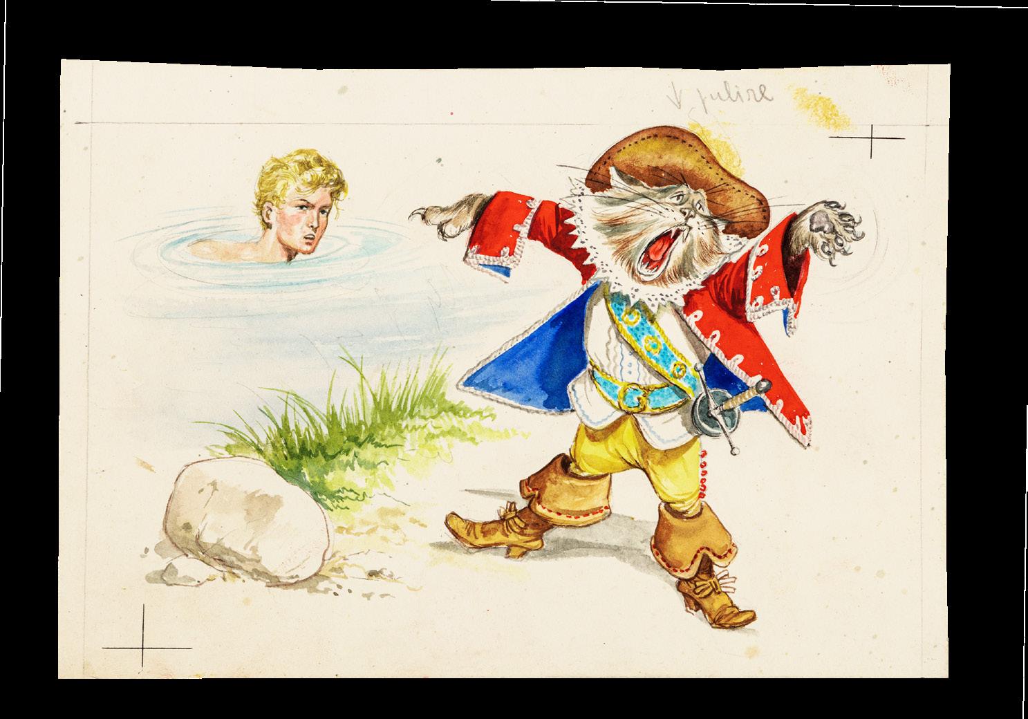 Tempera on thin cardboard. Original illustration done by Sergio for his famous interpretation of “The Adventures of Pinocchio” by Carlo Collodi, published between 1961 and 1965. Small tear on the lower margin.