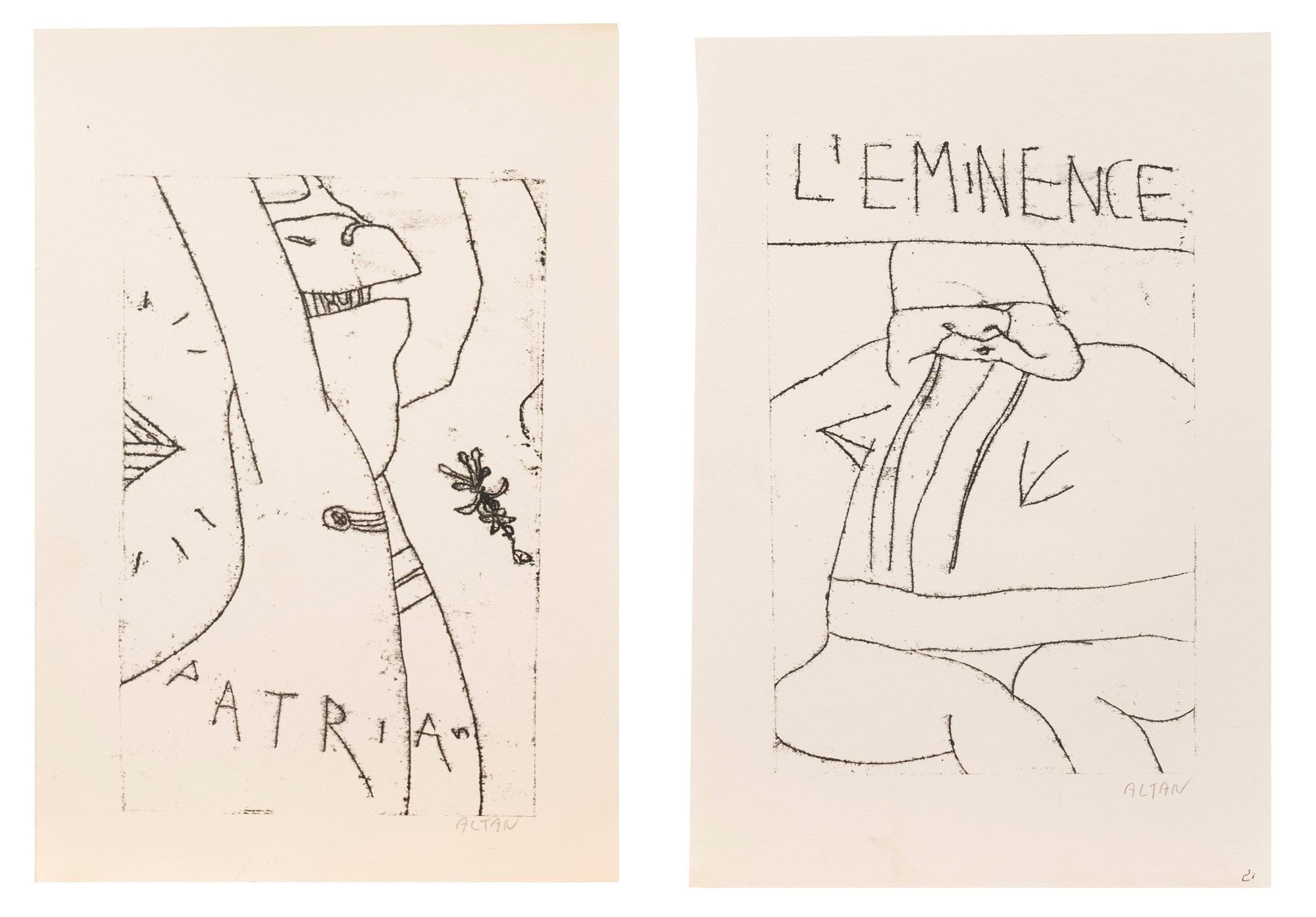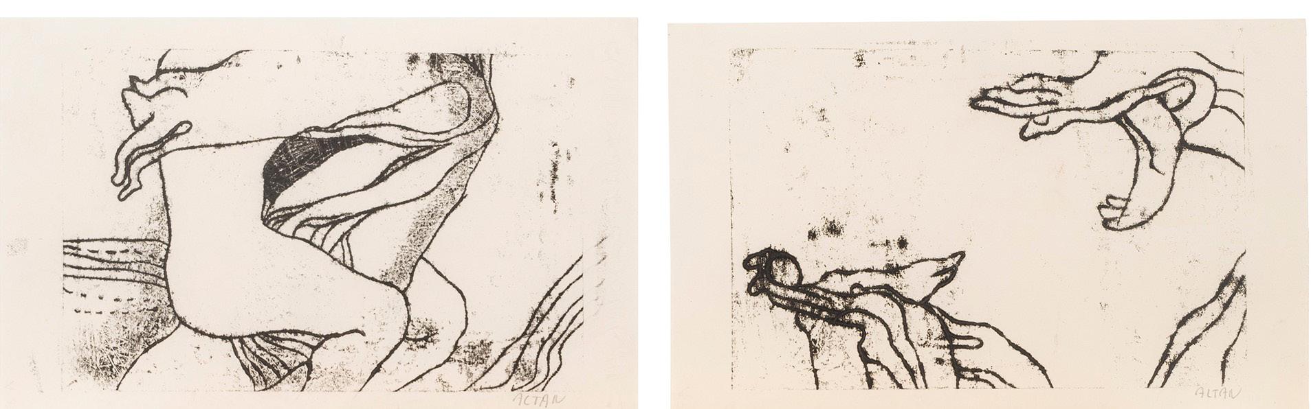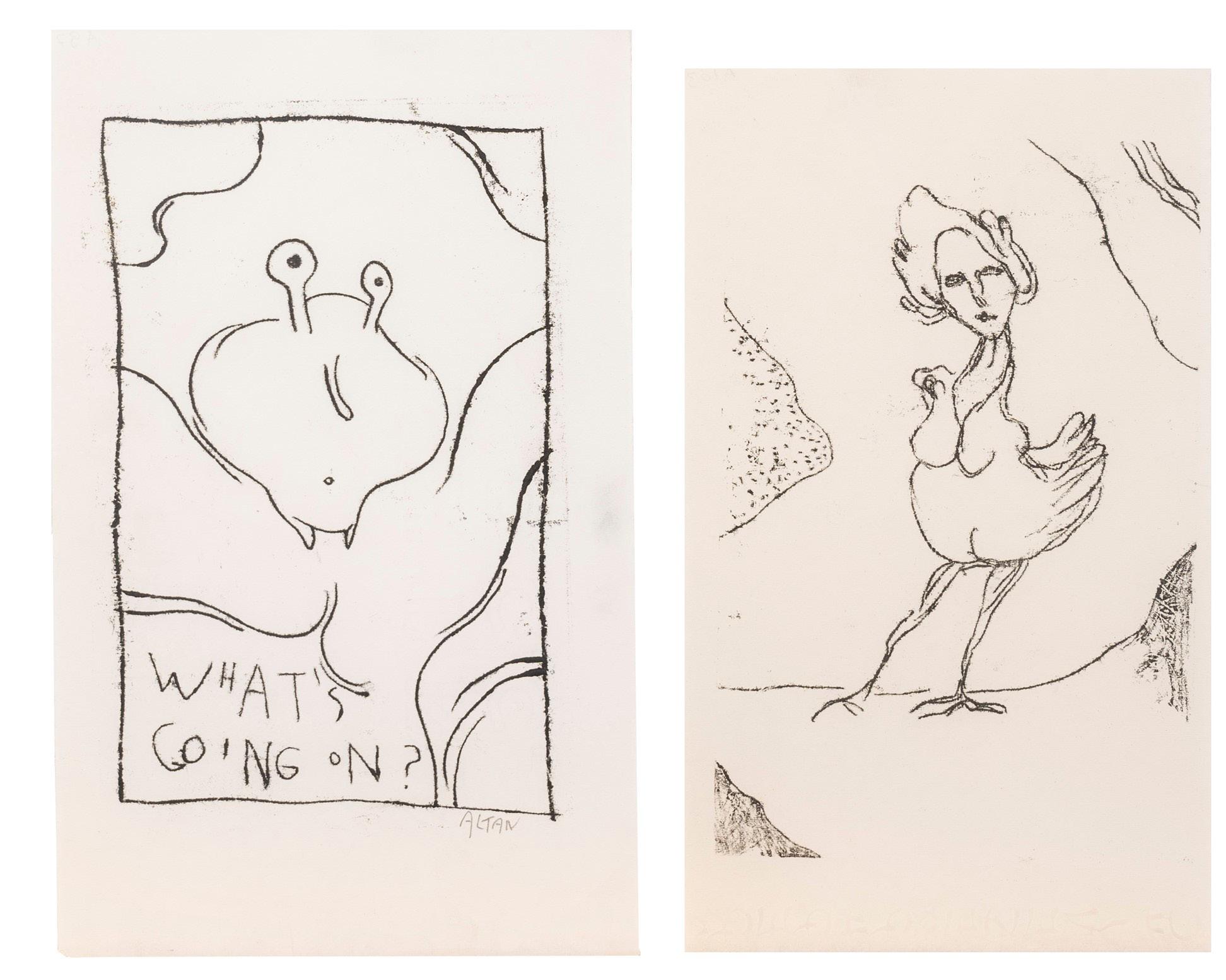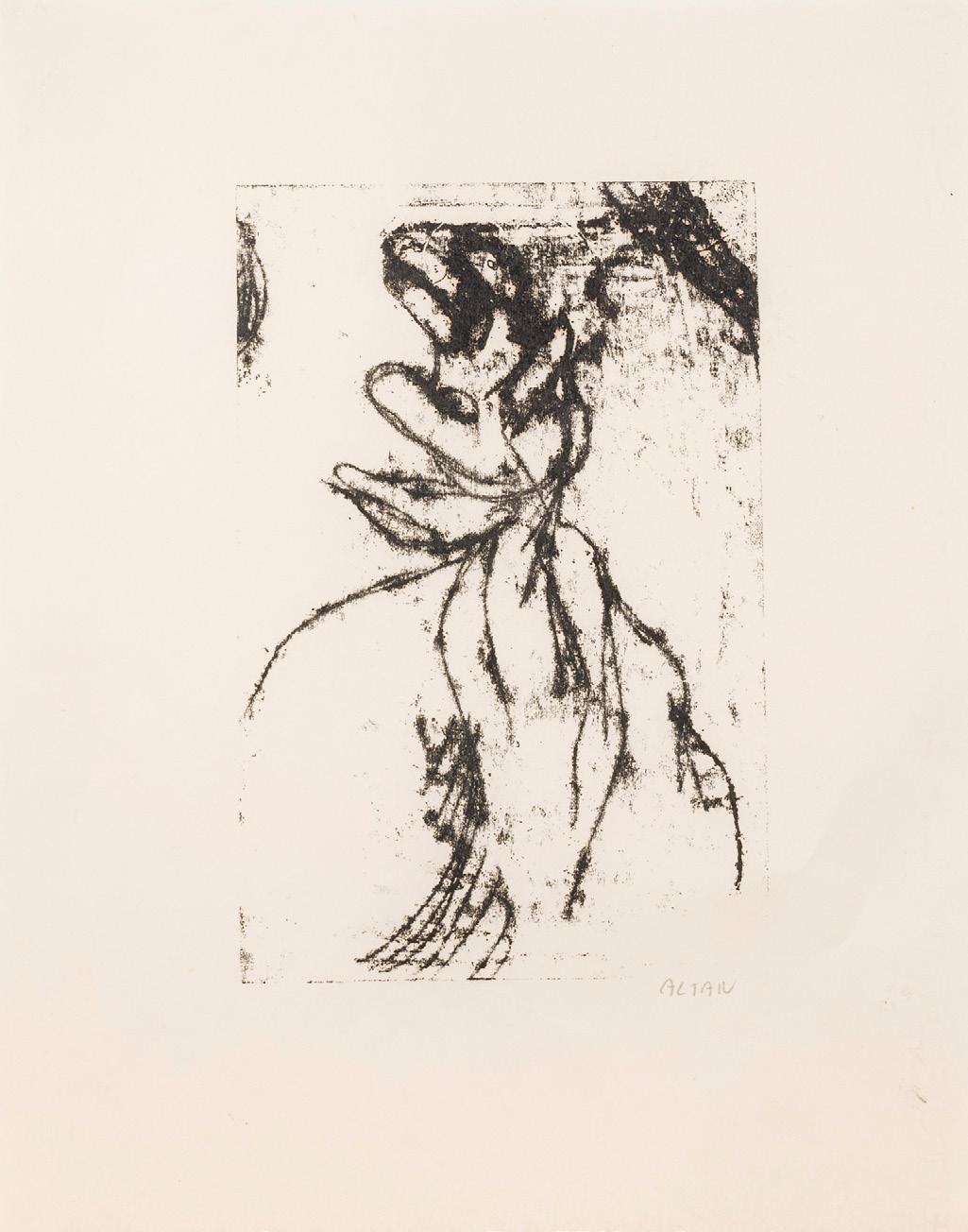 Un buon numero di disegni sono fatti con la tecnica del monotipo, segnando con una punta un foglio di carta leggera posata su un vetro coperto con inchiostro da stampa, che produce un segno simile a un’incisione.