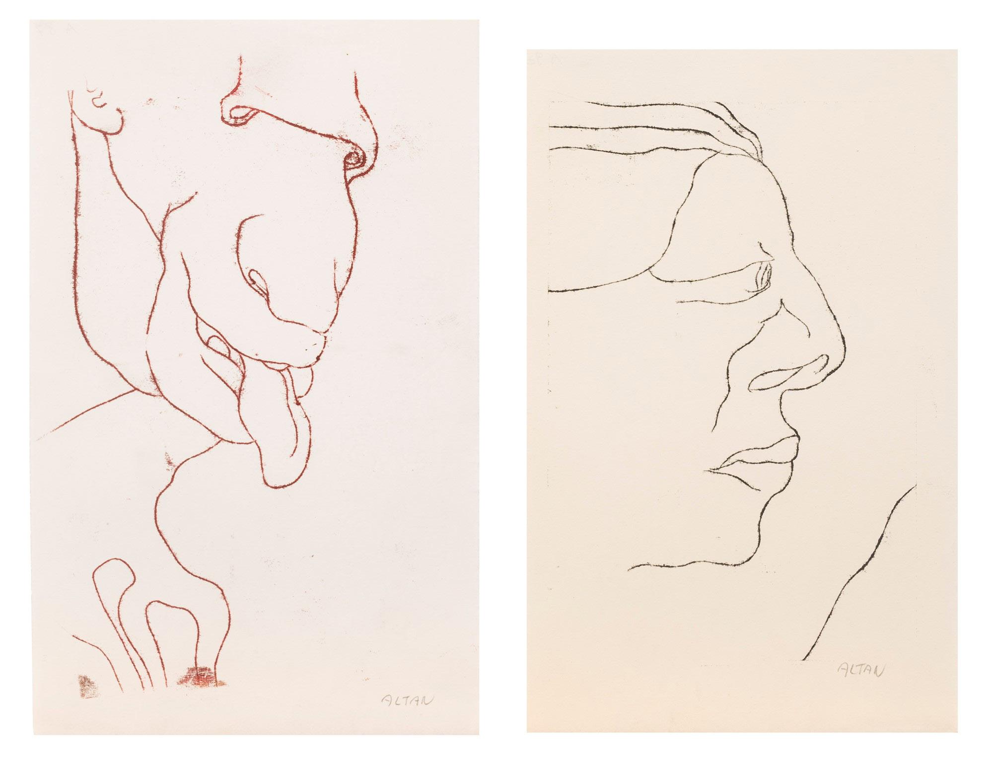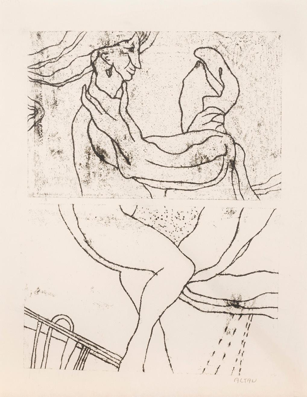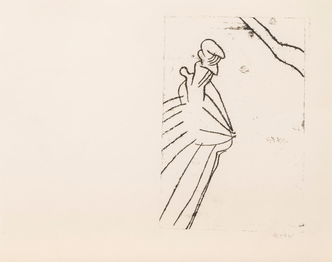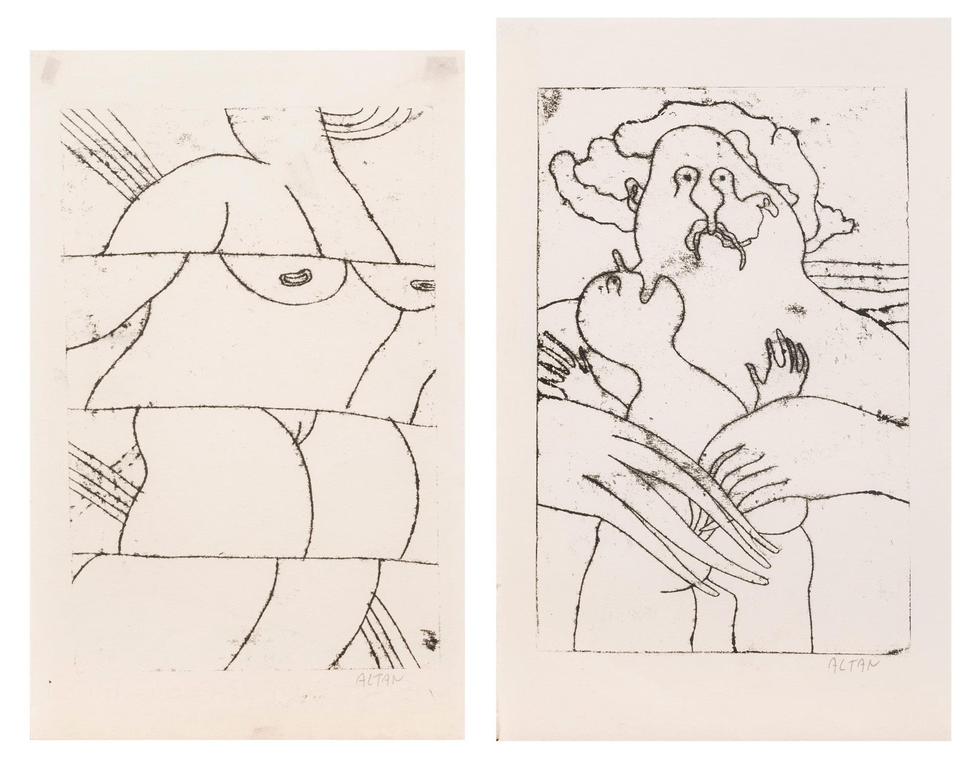 Un buon numero di disegni sono fatti con la tecnica del monotipo, segnando con una punta un foglio di carta leggera posata su un vetro coperto con inchiostro da stampa, che produce un segno simile a un’incisione.