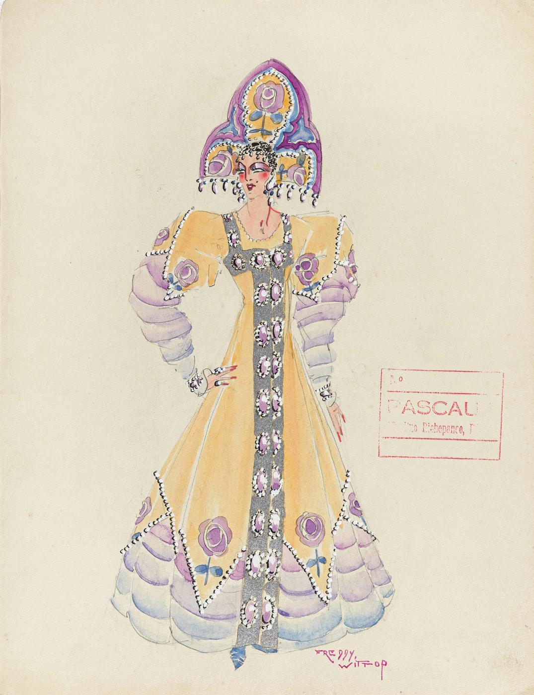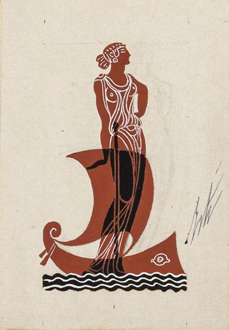 Tempera on thin cardboard. Original drawing made by Erté in the 1940s for the costumes of a theatrical performance. Bearing the title and archive number 7963 on the back. Slight crease and small tears on the lower margin. Signed.