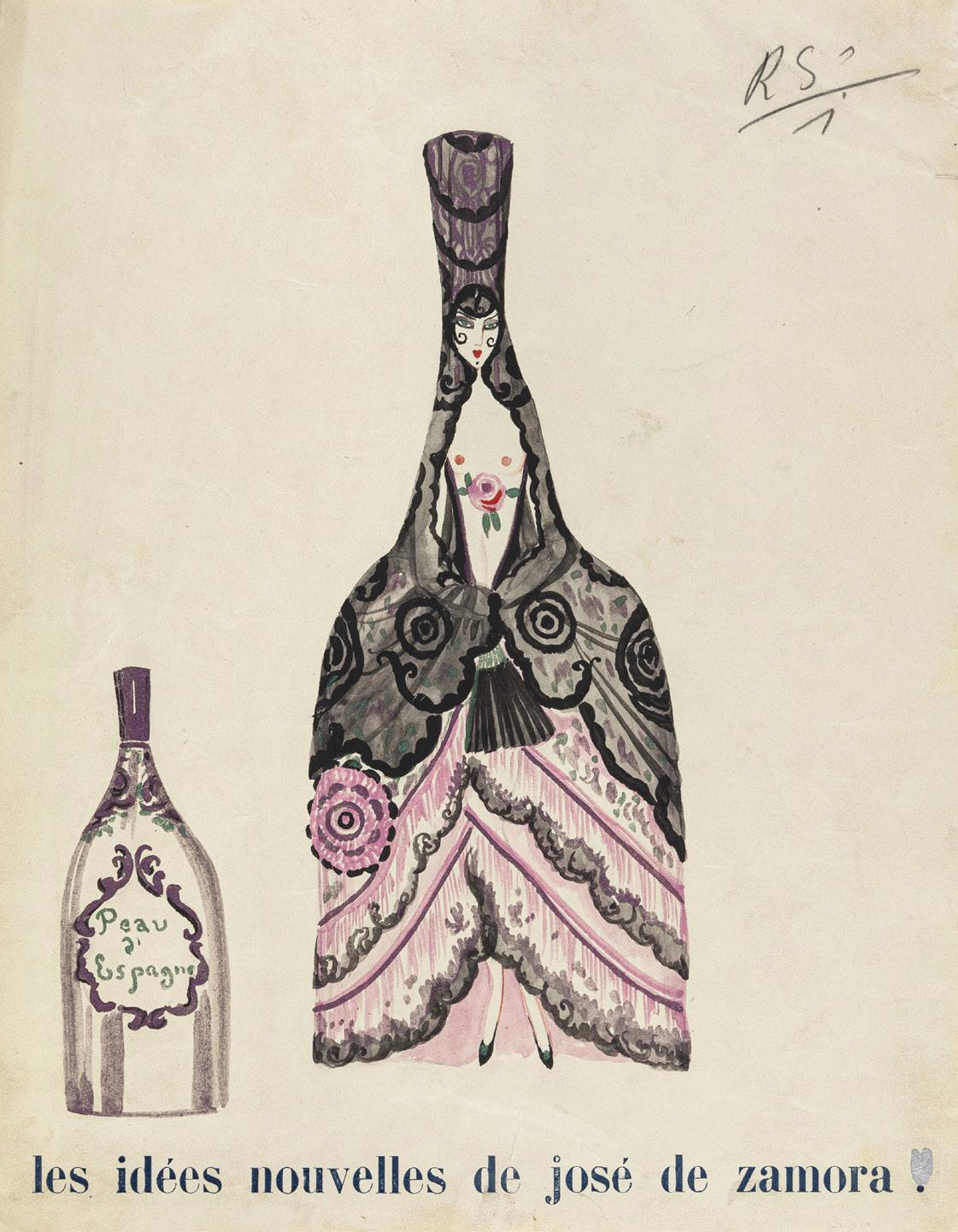 ink and Tempera on cardboard. Original drawing made by Erté in 1916 for the costumes of the theatrical performance “Les Fleurs du Mal”, staged at the Ba-ta-Clan theater in Paris in the 1916-1917 season. Artwork published in the volume “ERTÉ” on texts by Barthes Roland published by Franco Maria Ricci in 1970. Labeled on the back by the Rosvenor Gallery in London. Two small tears on the right margin, traces of glue on the margins. Signed.