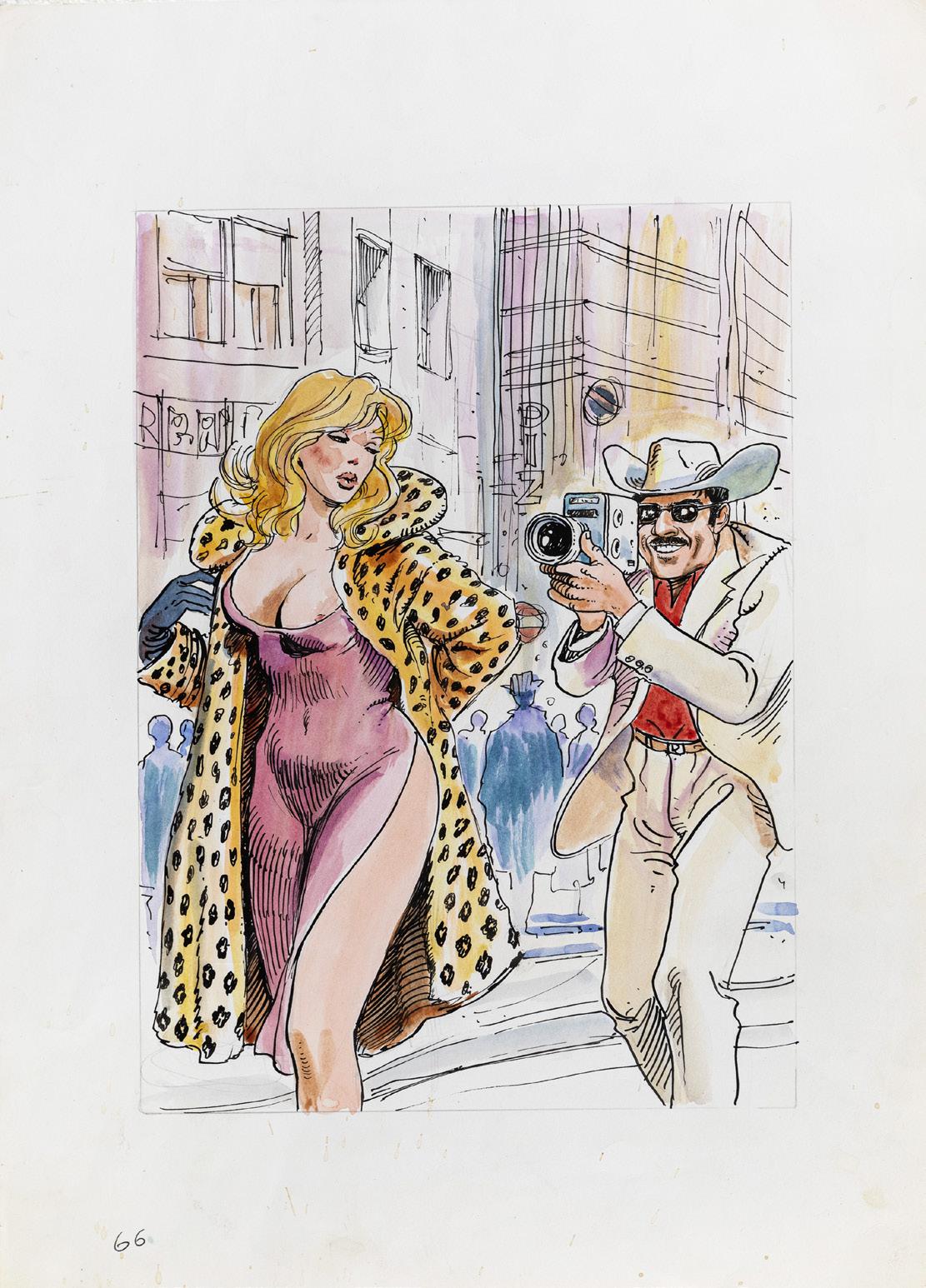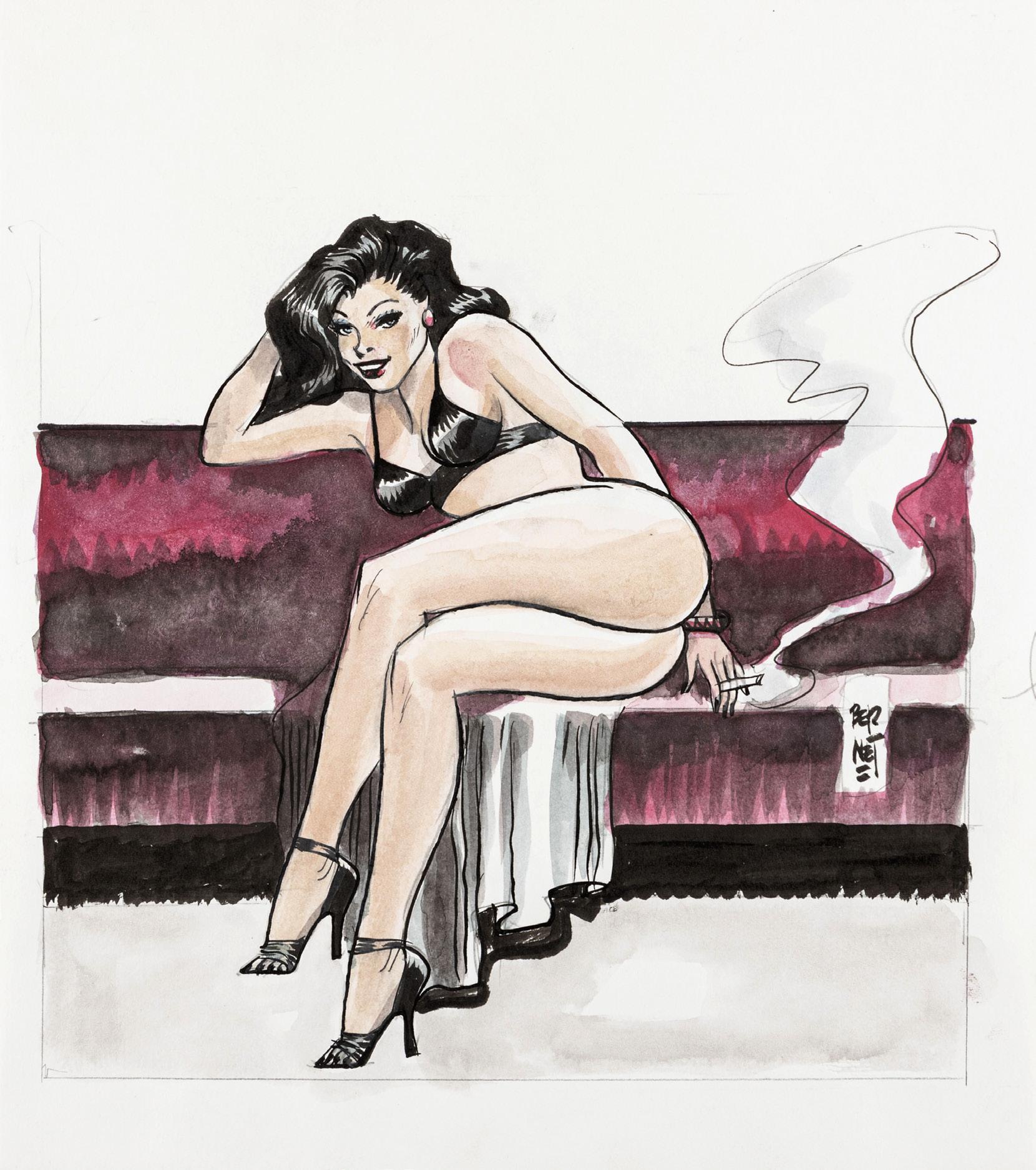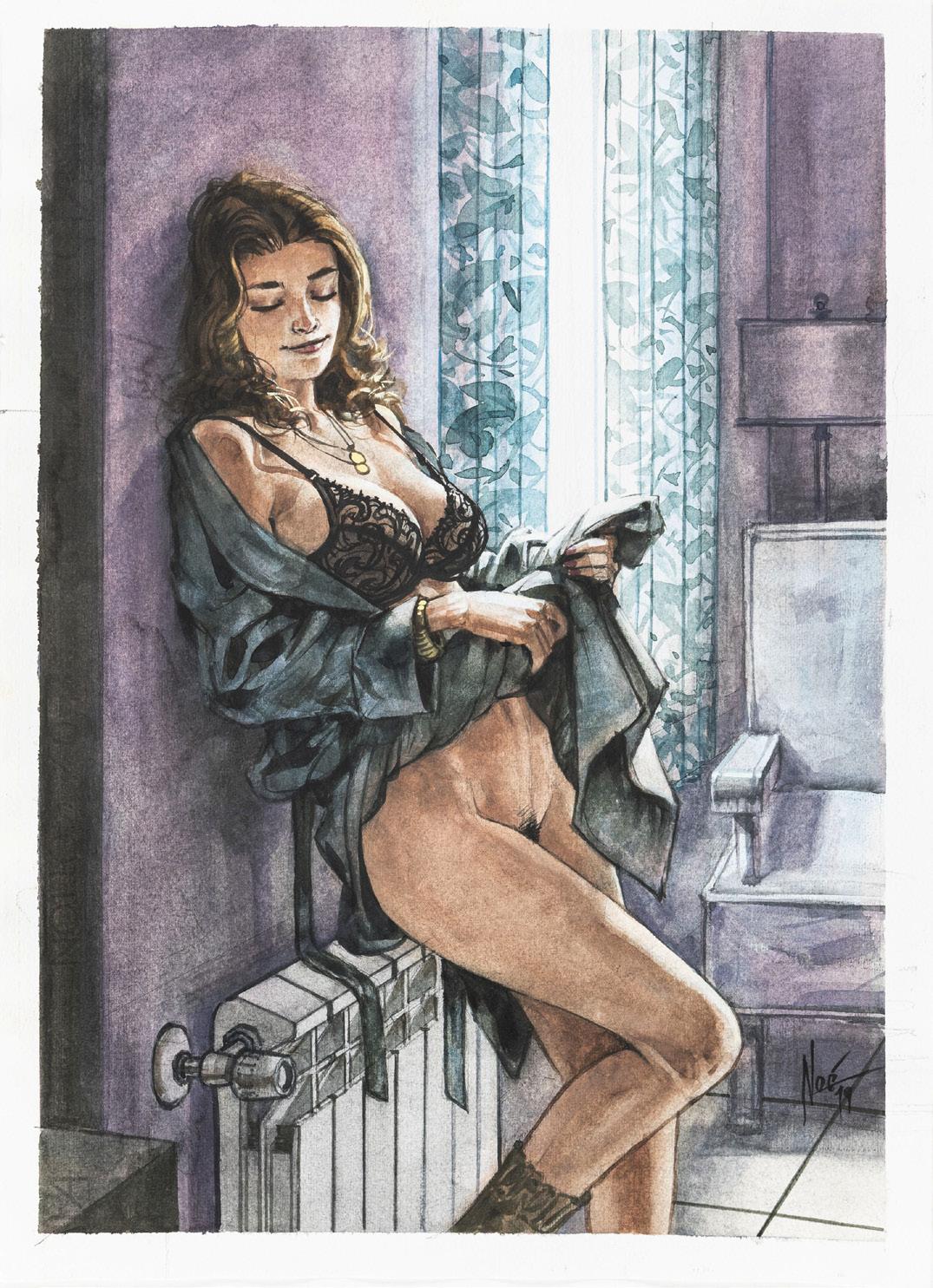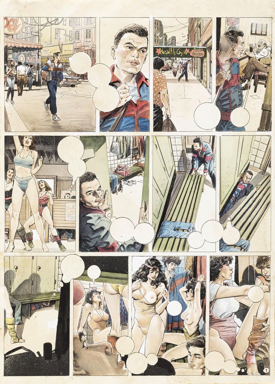 Tavola originale realizzata da Altuna per la pag. 1 della avventura erotica intitolata “En forma”, pubblicata per la prima volta sulle pagine di Playboy negli anni ‘80 e successivamente ristampata nel volume “El Mirón 2” dalle Ediciones de la Urraca nel 1996.