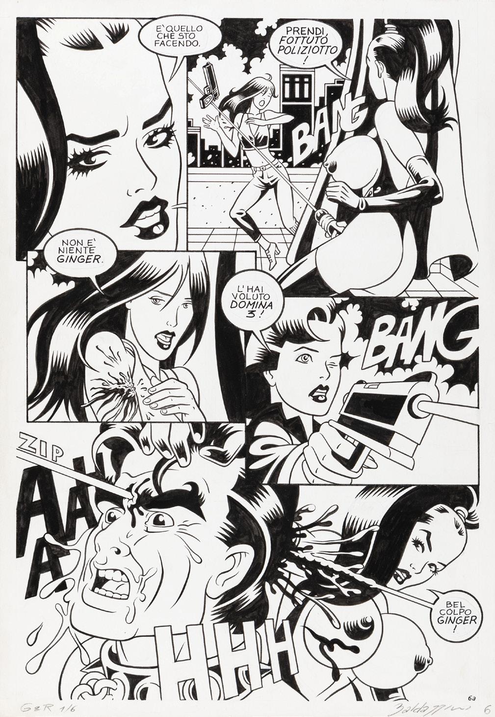 Tavola originale realizzata da Baldazzini per “Domina Invaders”, pag. 6 di questa avventura di Ginger & Rogers edita per la prima volta sulla rivista Blue n. 57 nel 1995. Firmata.