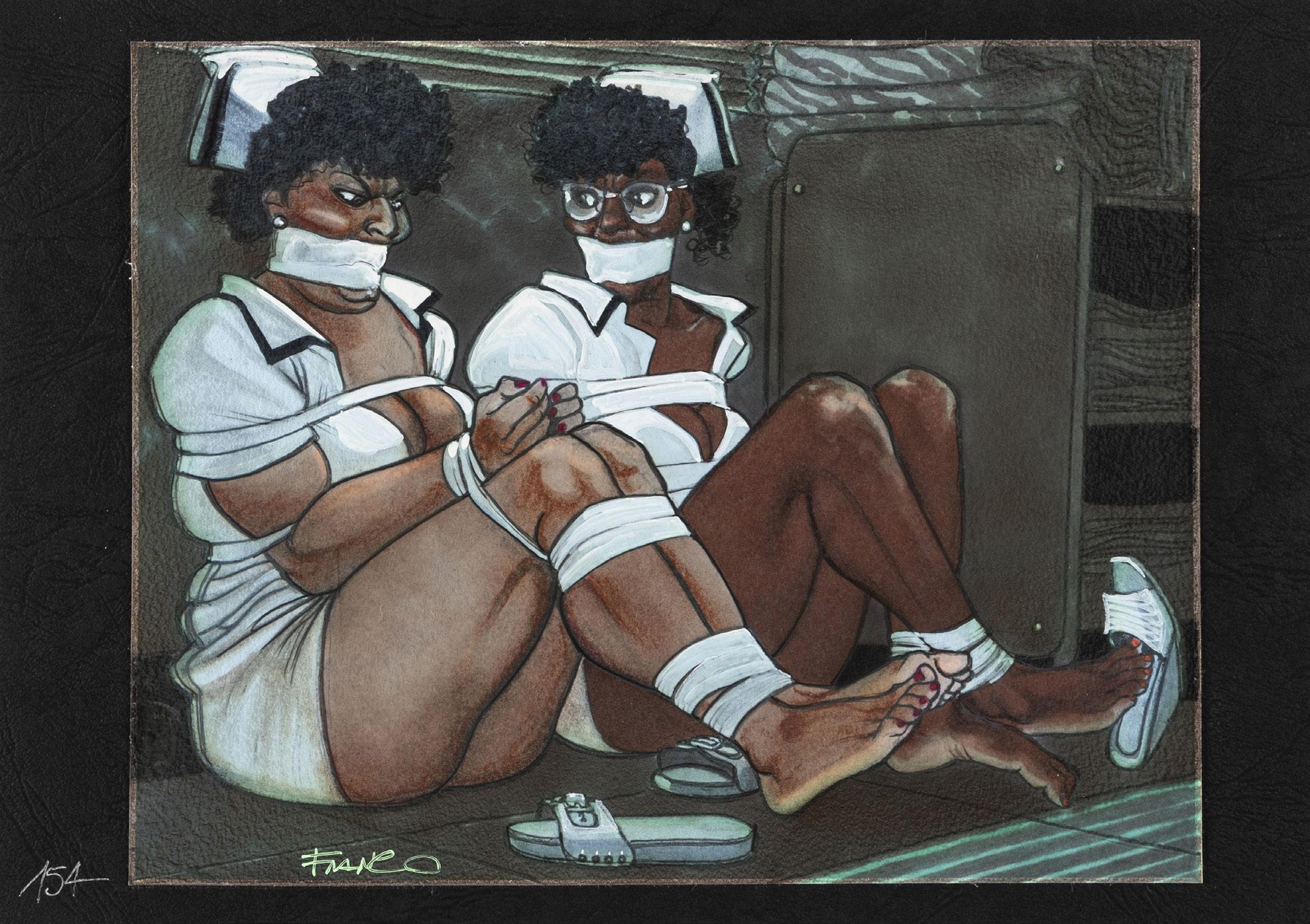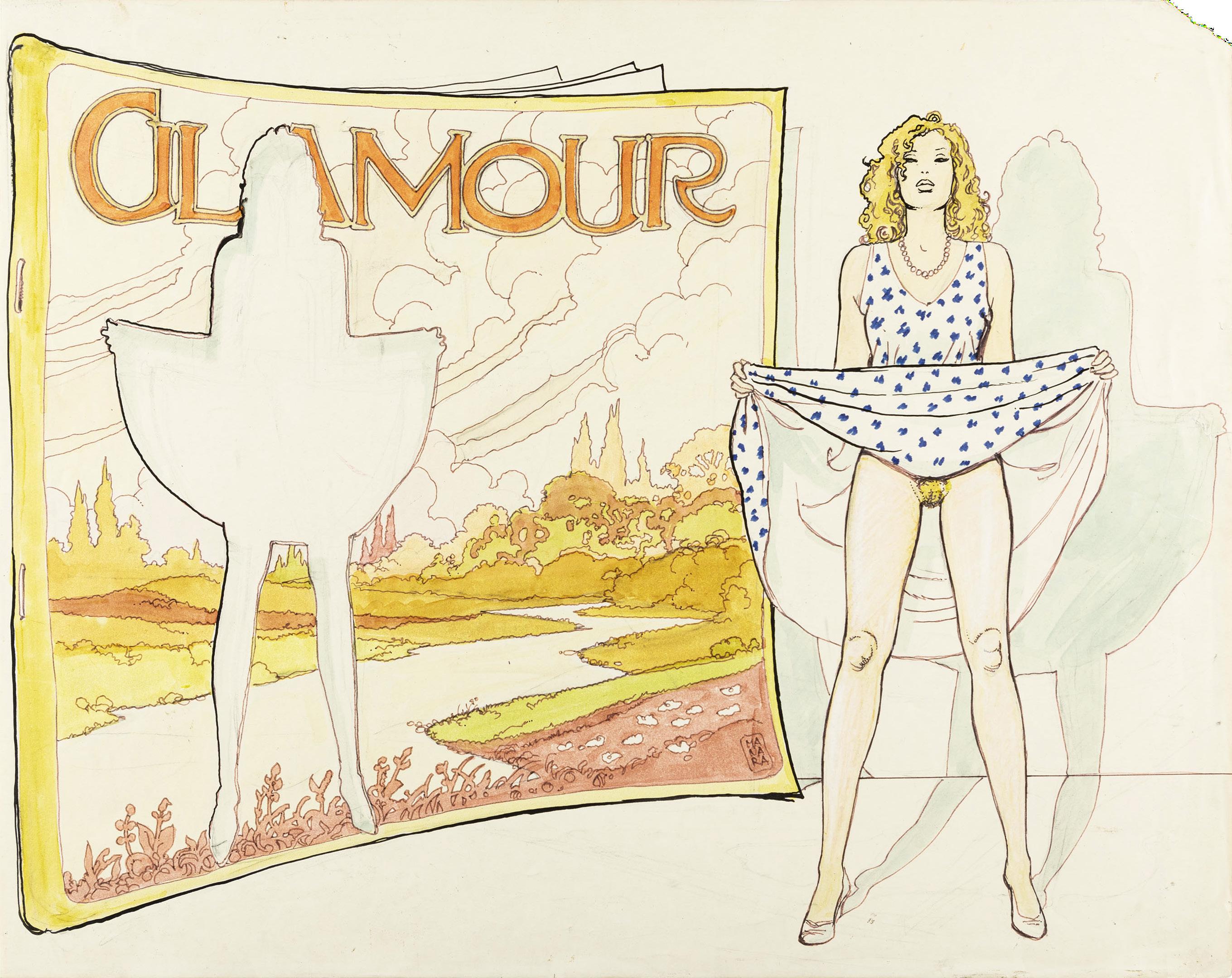 Pencil, ink, white lead, and tempera on photocopy. Original comic art made by Altuna for page 1 of the erotic adventure titled “En forma”, first published in the pages of Playboy in the 80s and later reprinted in the volume “El Mirón 2” by Ediciones de la Urraca in 1996.