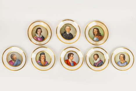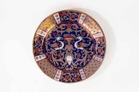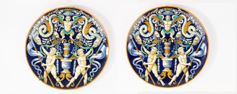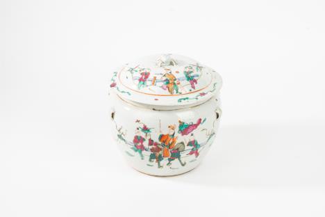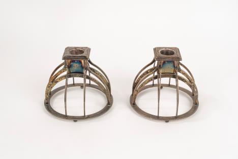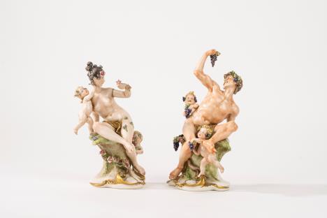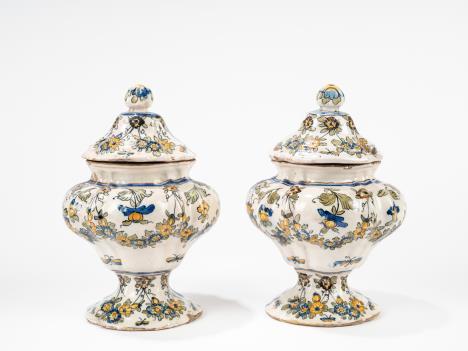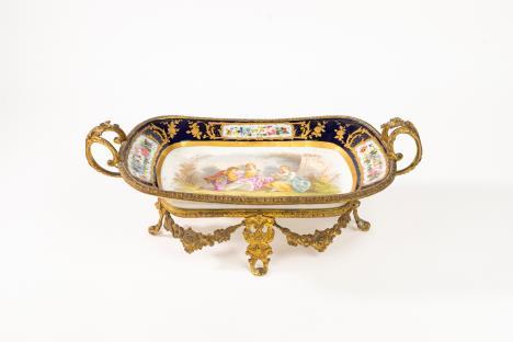 CoppiadivasiImperobiansatiinporcellanadorataepolicroma, secoloXIX corpiovoidaliconriservedipintesulfronteascenedigenereesulretroa paesaggi, unoconsbeccaturasullabase