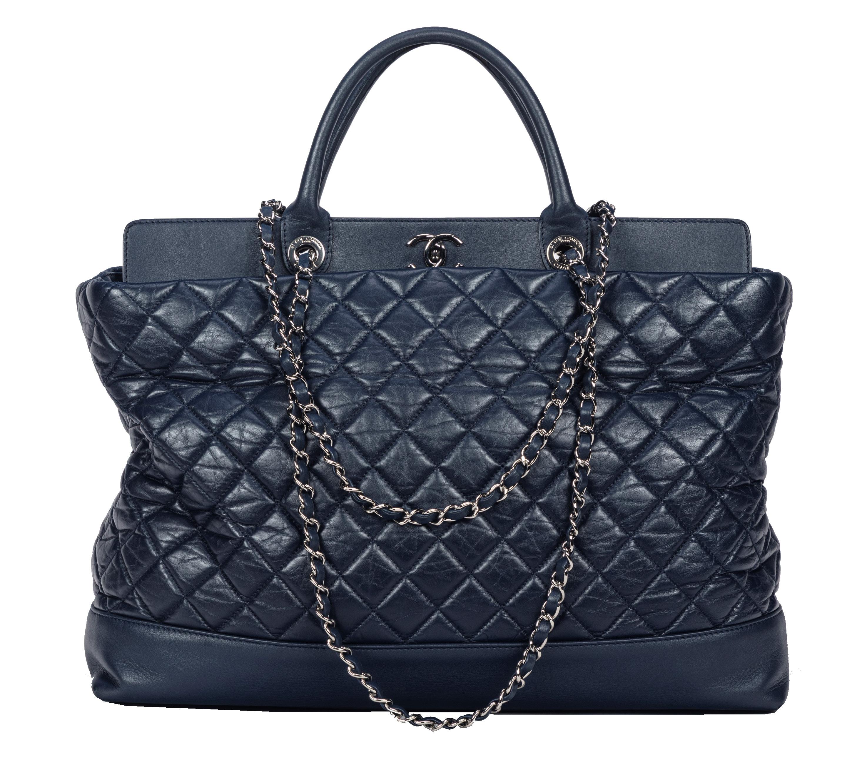 in pelle matelassé color blu, dettagli e tracolla in metallo dorato, cm 31, con sacchetto e scatola (lievi segni d’uso), 2014