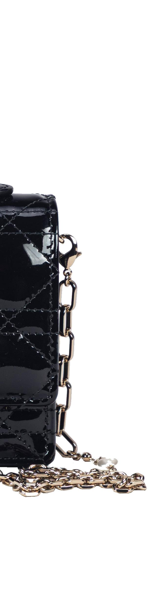 pelle verniciata color nero, tracolla a catena in metallo dorato, doppio scomparto interno, cm 24, con sacchetto e scatola, 2008