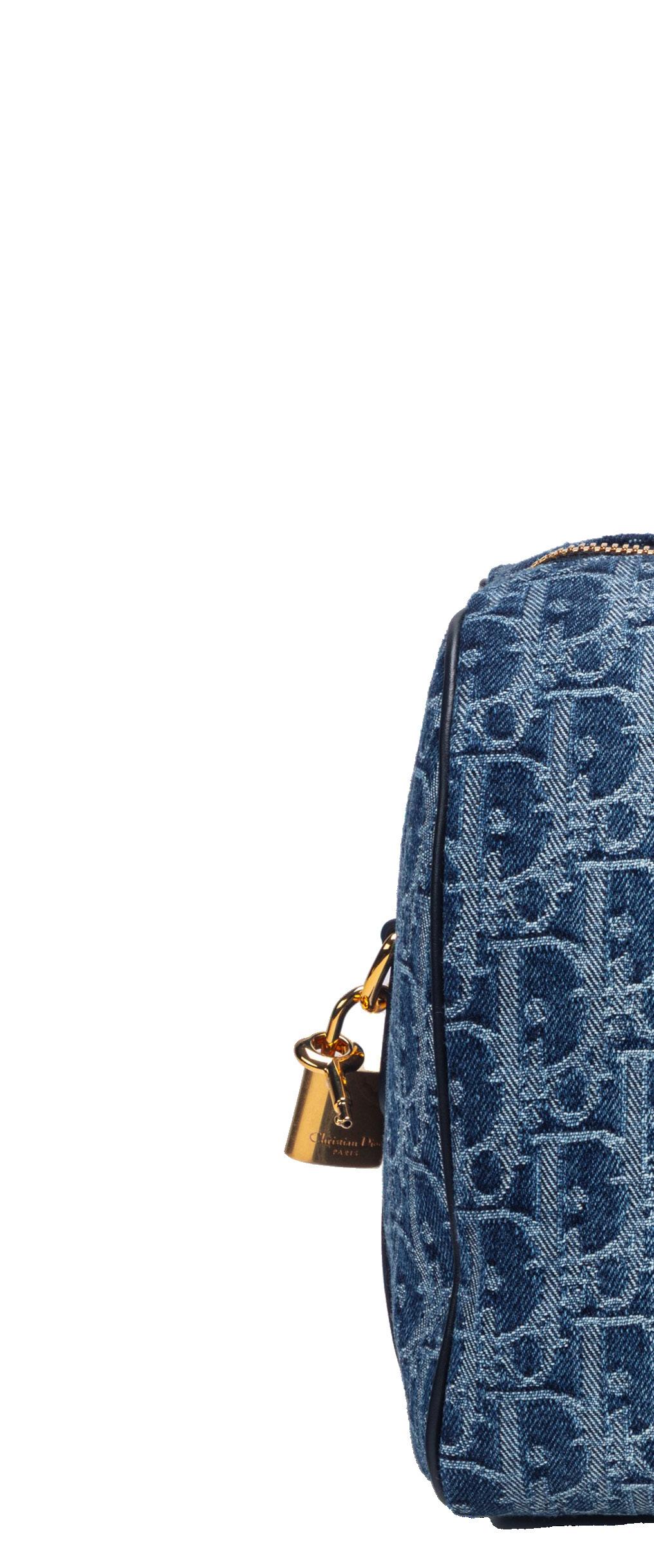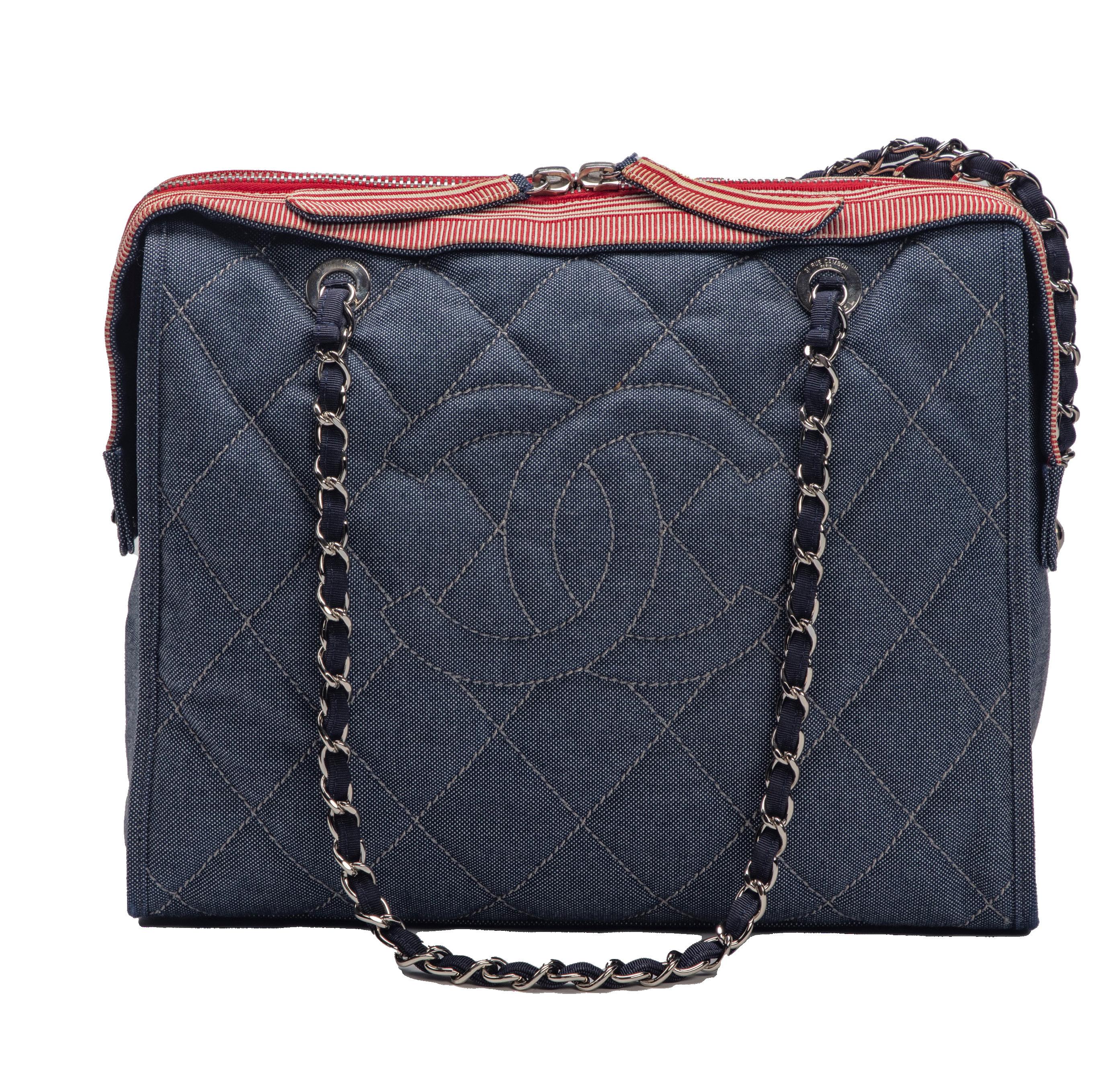 Denim canvas matelassé chain shoulder bag, satin metal details, cm 23, with dustbag