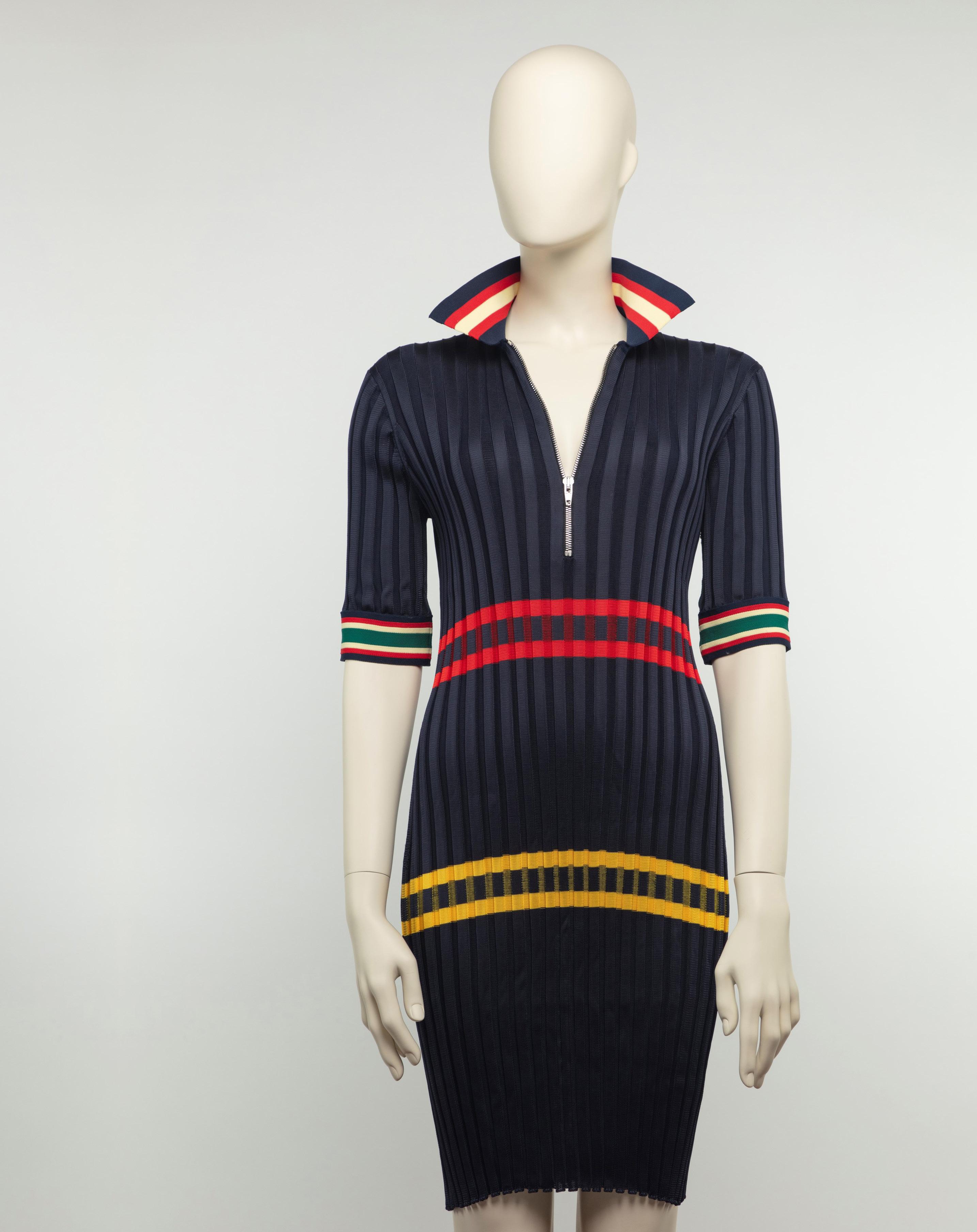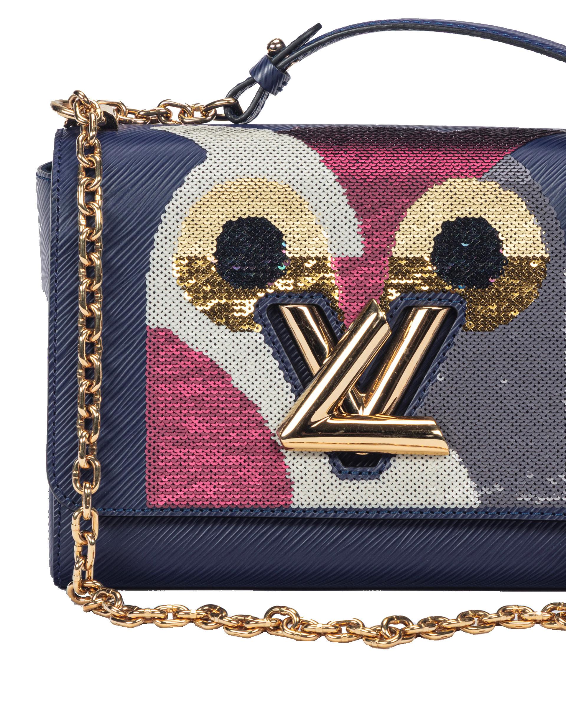 in tela denim e righe color bianco e rosso, doppia tracolla a catena, dettagli in metallo, cm 35, con sacchetto, 2009