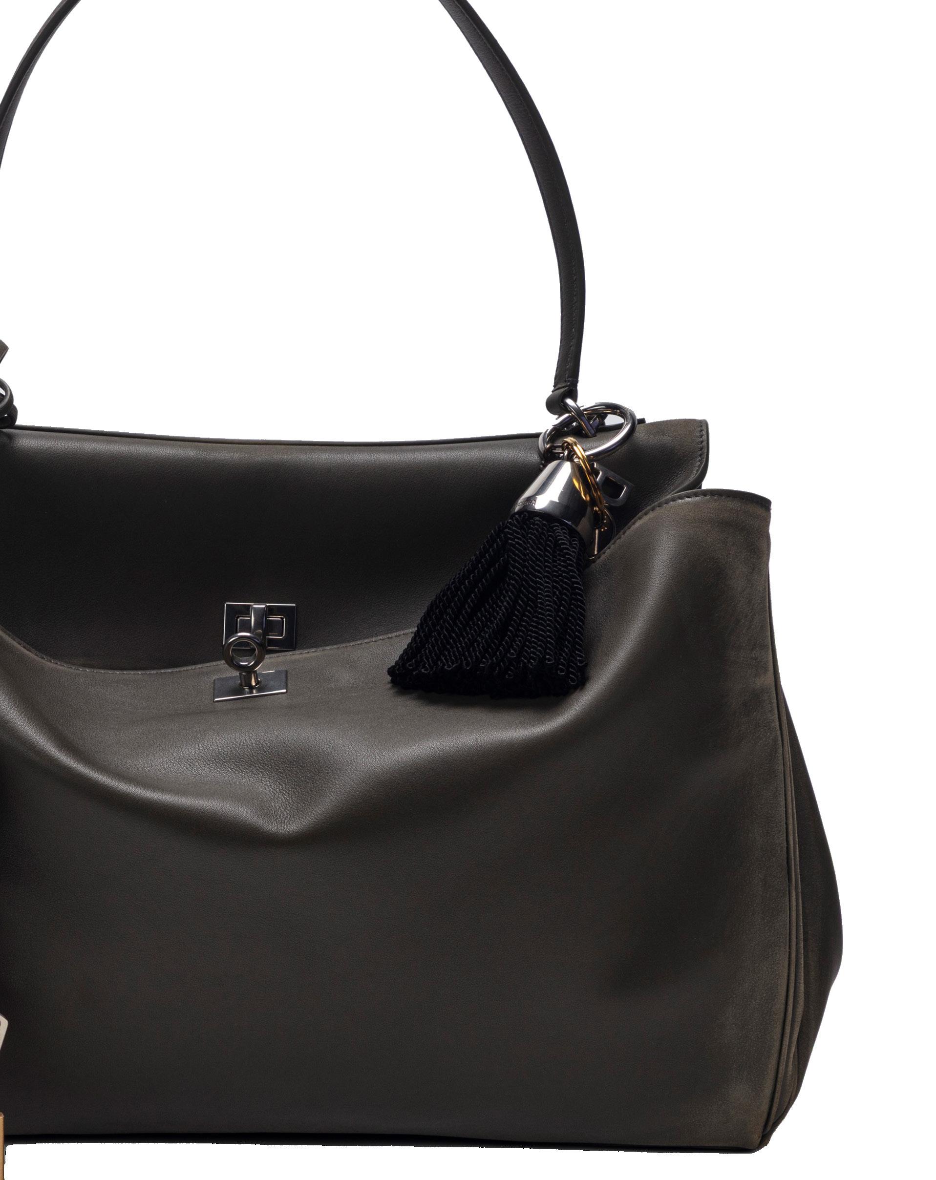 Light grey leather large shopper bag, double shoulder strap, metal details, fabric lining, cm 30 (base), with dustbag (signs of use), 2009