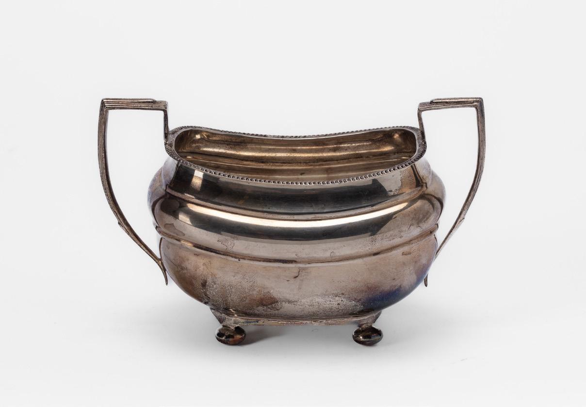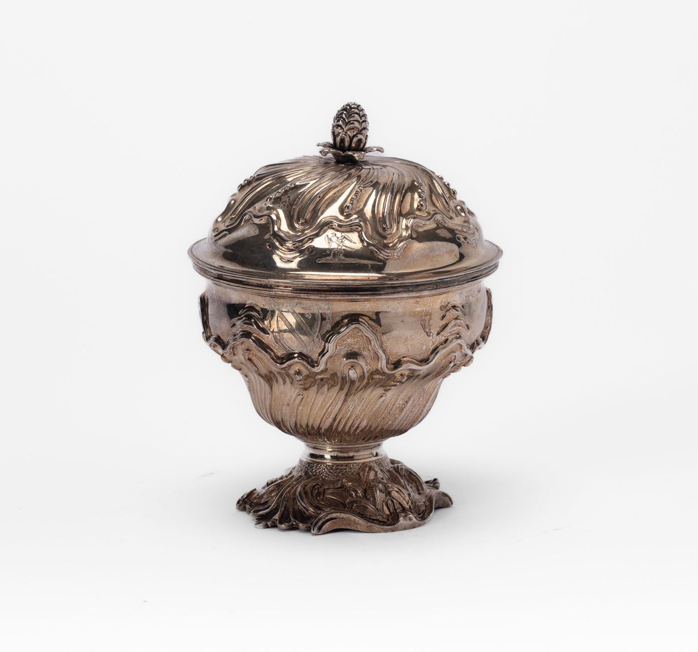 ZUCCHERIERA, SECONDA METÀ SECOLO XX, in argento, interno in vermeil, corpo costolato, prese mosse e pomolo del coperchio decorato con frutto con foglie a tuttotondo.