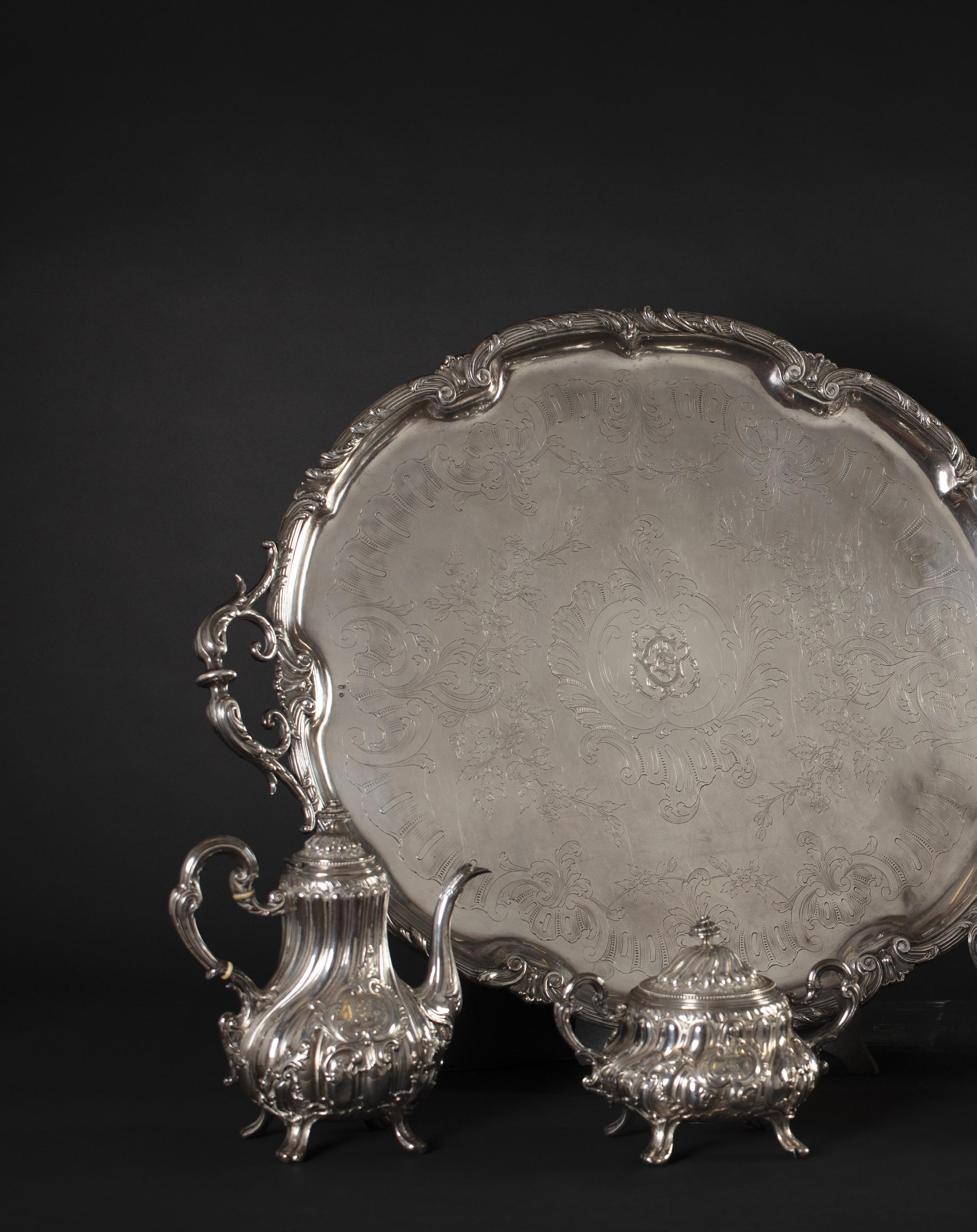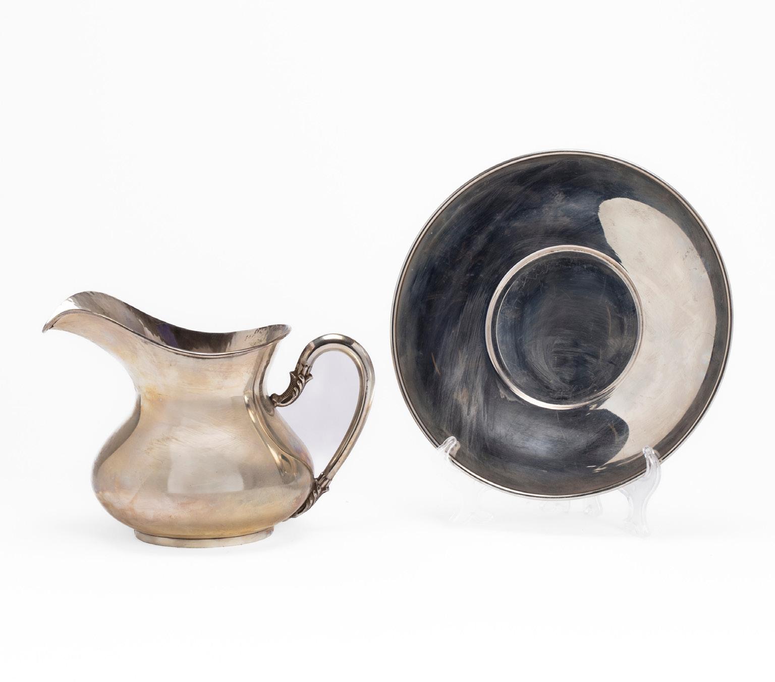 JUG WITH PLATE, ITALY, SECOND HALF OF THE 20TH CENTURY, in silver, smooth-bodied with a shaped handle, accompanied by a matching round small plate.