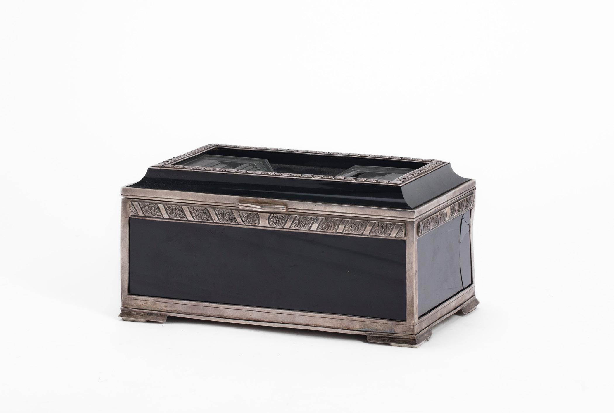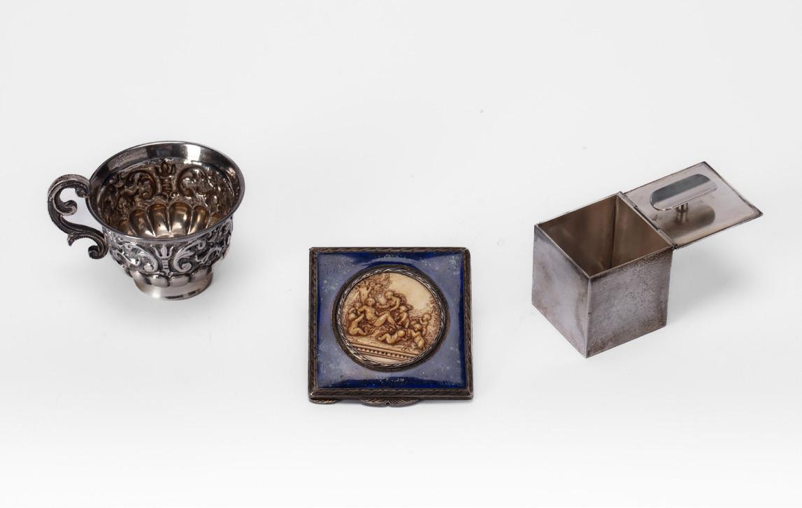 LOTTO DI TRE OGGETTI, METÀ SECOLO XX, in argento 925, composto da una piccola tazzina in argento 925 a corpo sbalzato, un posacenere in argento 925 di forma cubica, e un porta cipria di forma squadrata con coperchio decorato in pietra dura e medaglione centrale. Peso lordo g 260,00 (misure diverse)