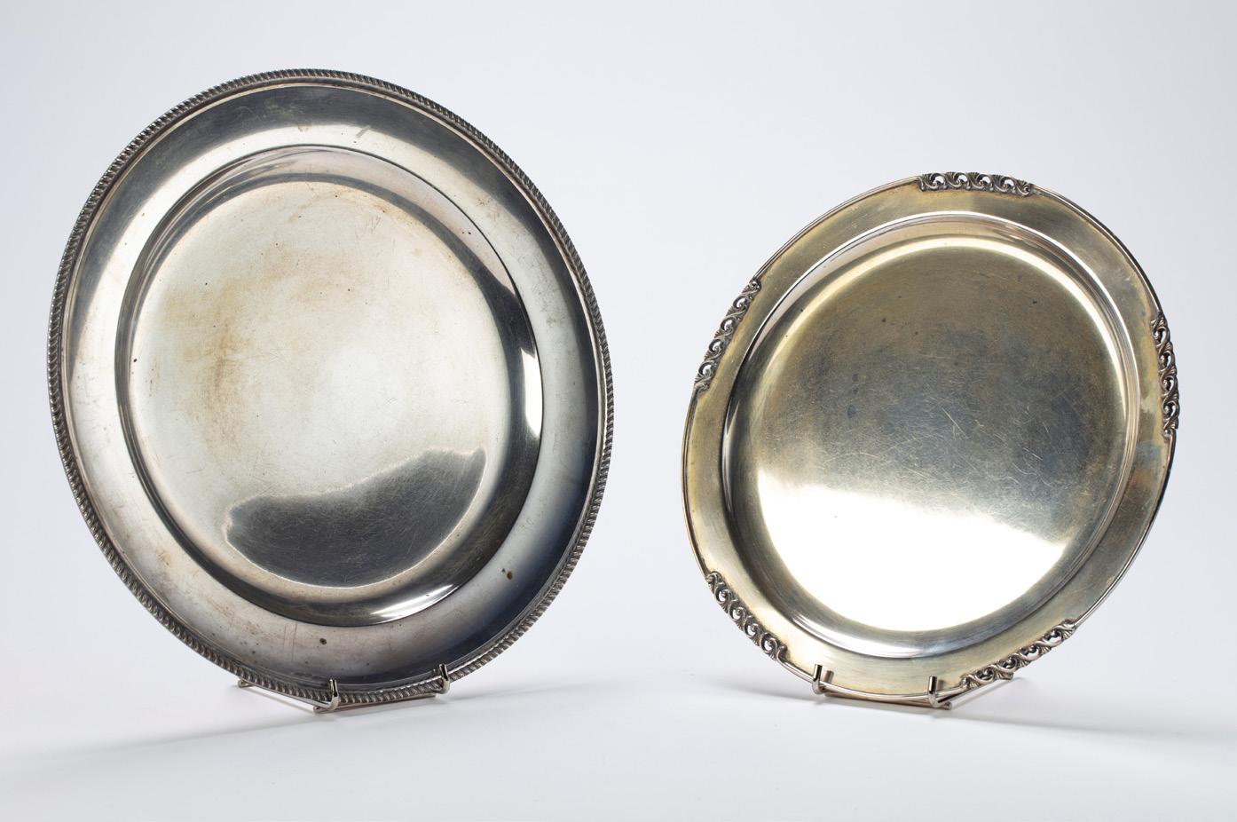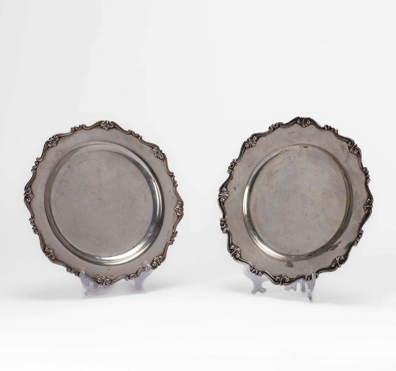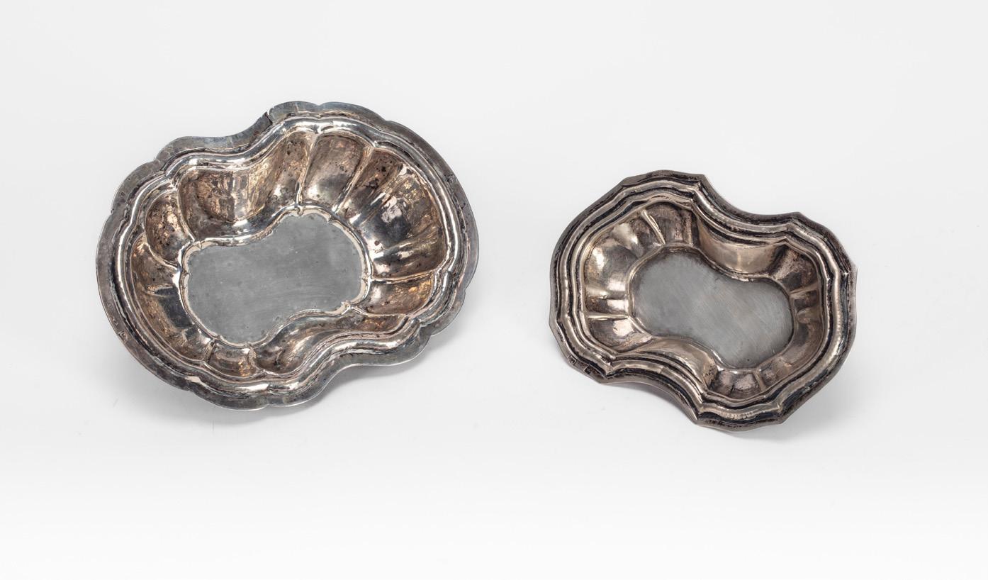 COPPIA DI CIOTOLINE, PRIMA METÀ SECOLO XX, in argento, di forma sagomata con cavetto sbalzato.