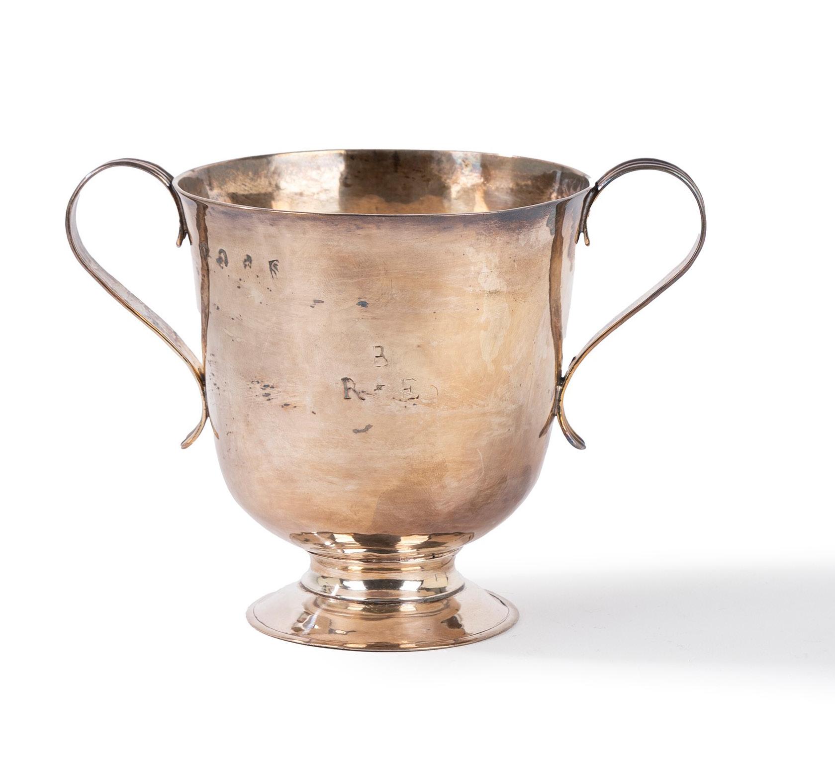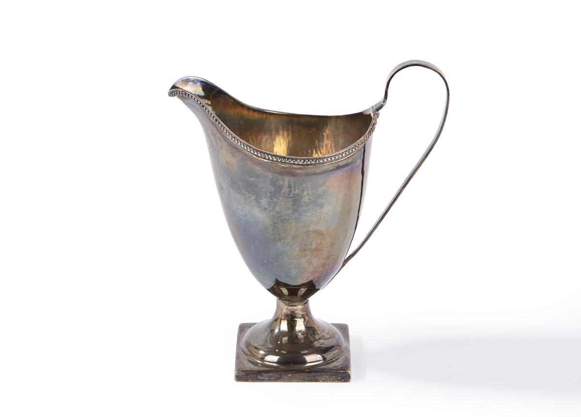 MUSTARD POT, DUBLIN, 1766, in silver, with smooth body, serrated rim, and shaped handle; silver spoon and blue glass liner. (Minor defects).