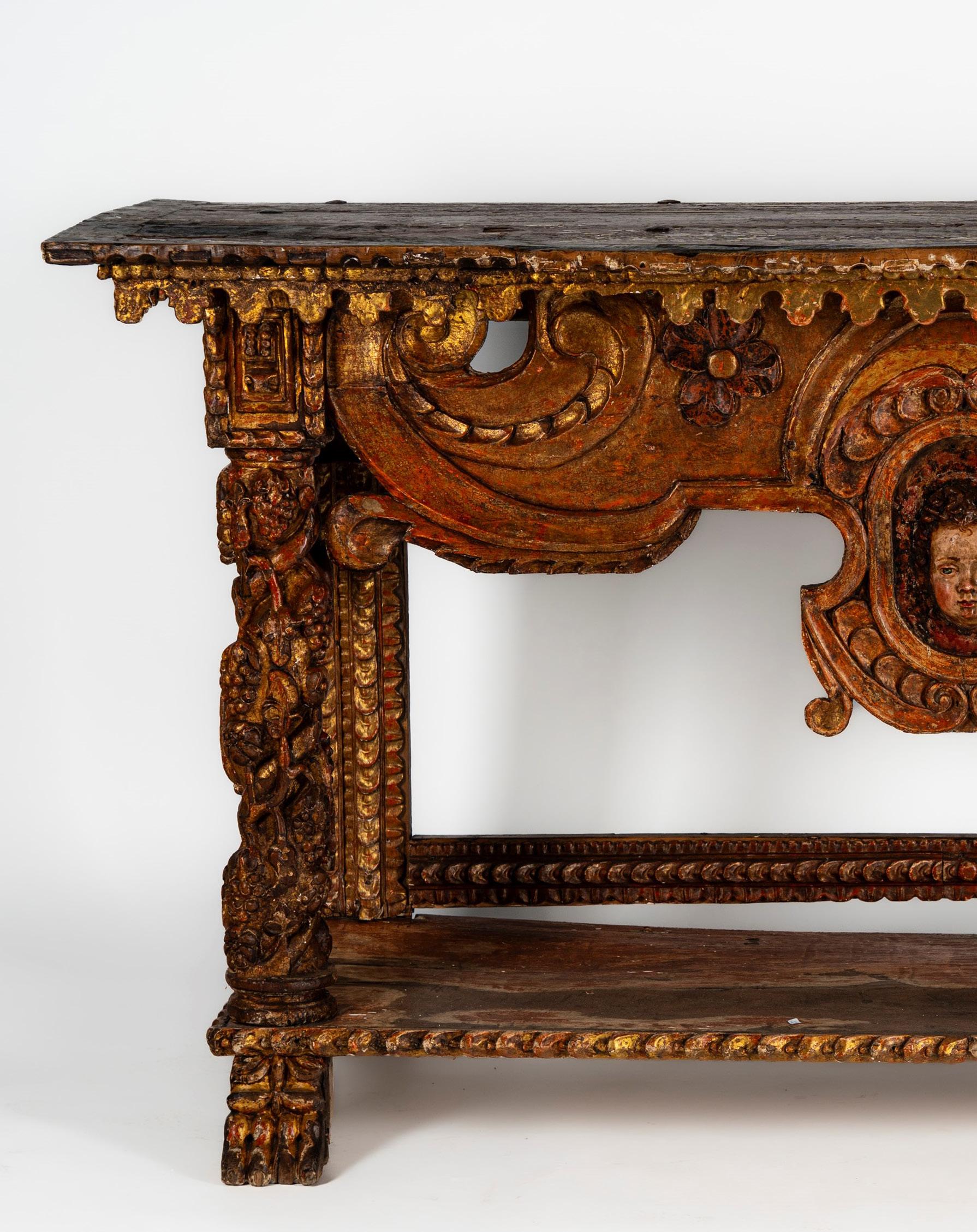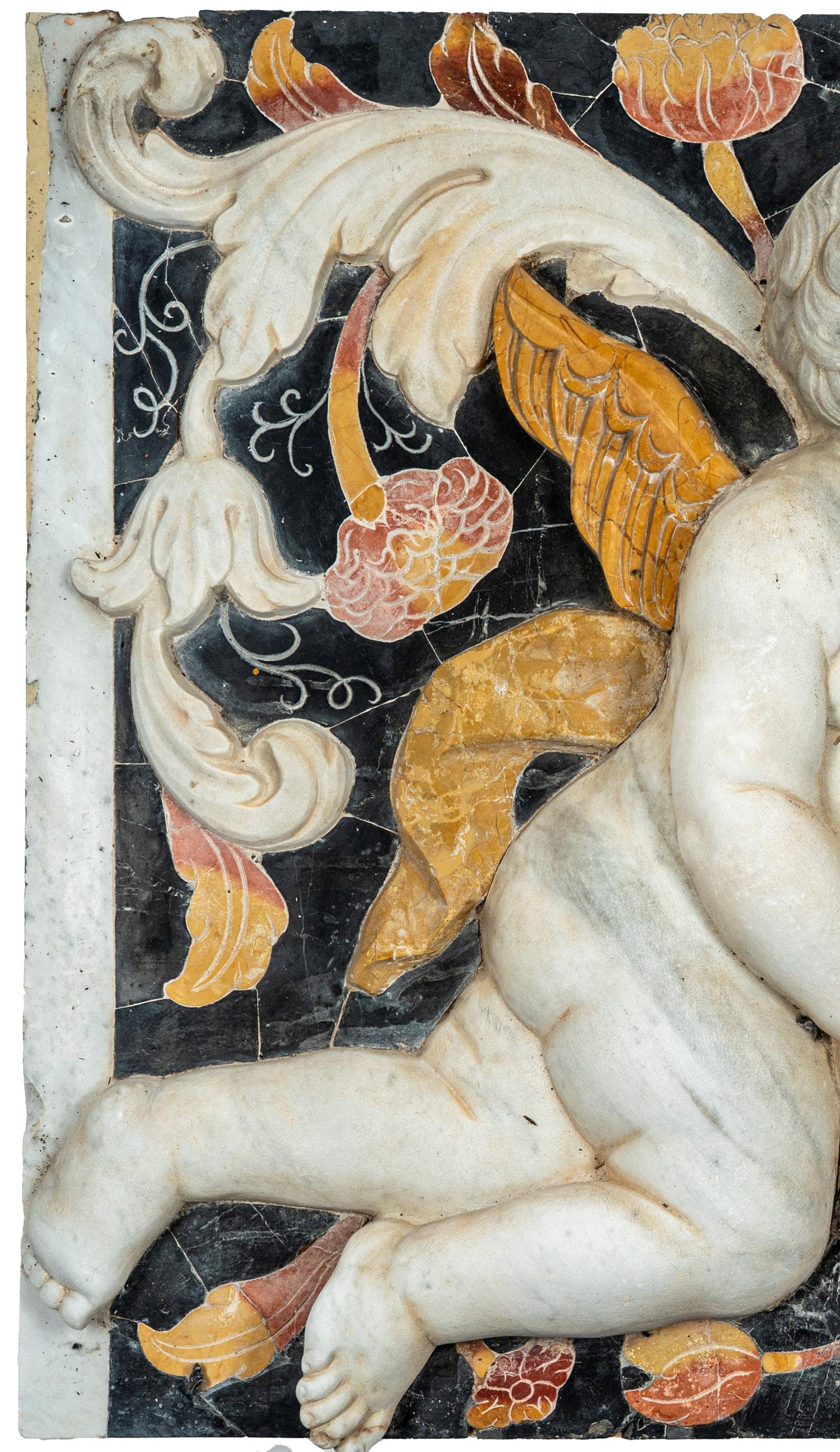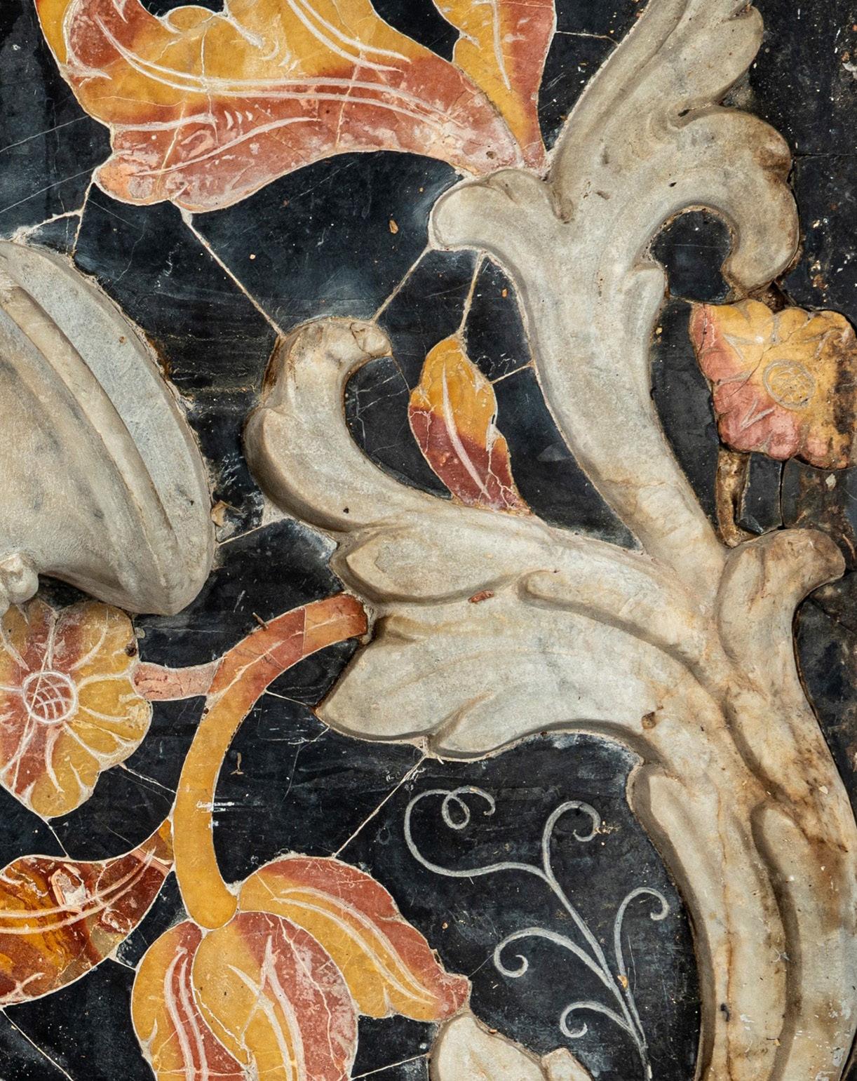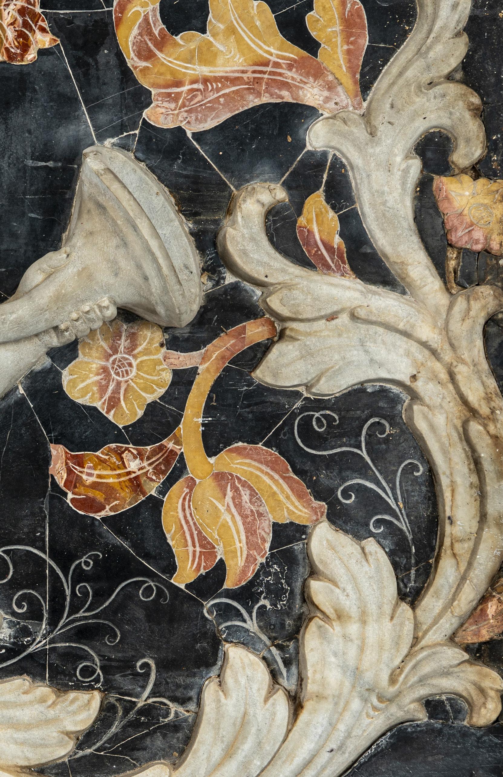 Riccamente decorato da ghirlande e volute entro cornici, bordura in marrone.