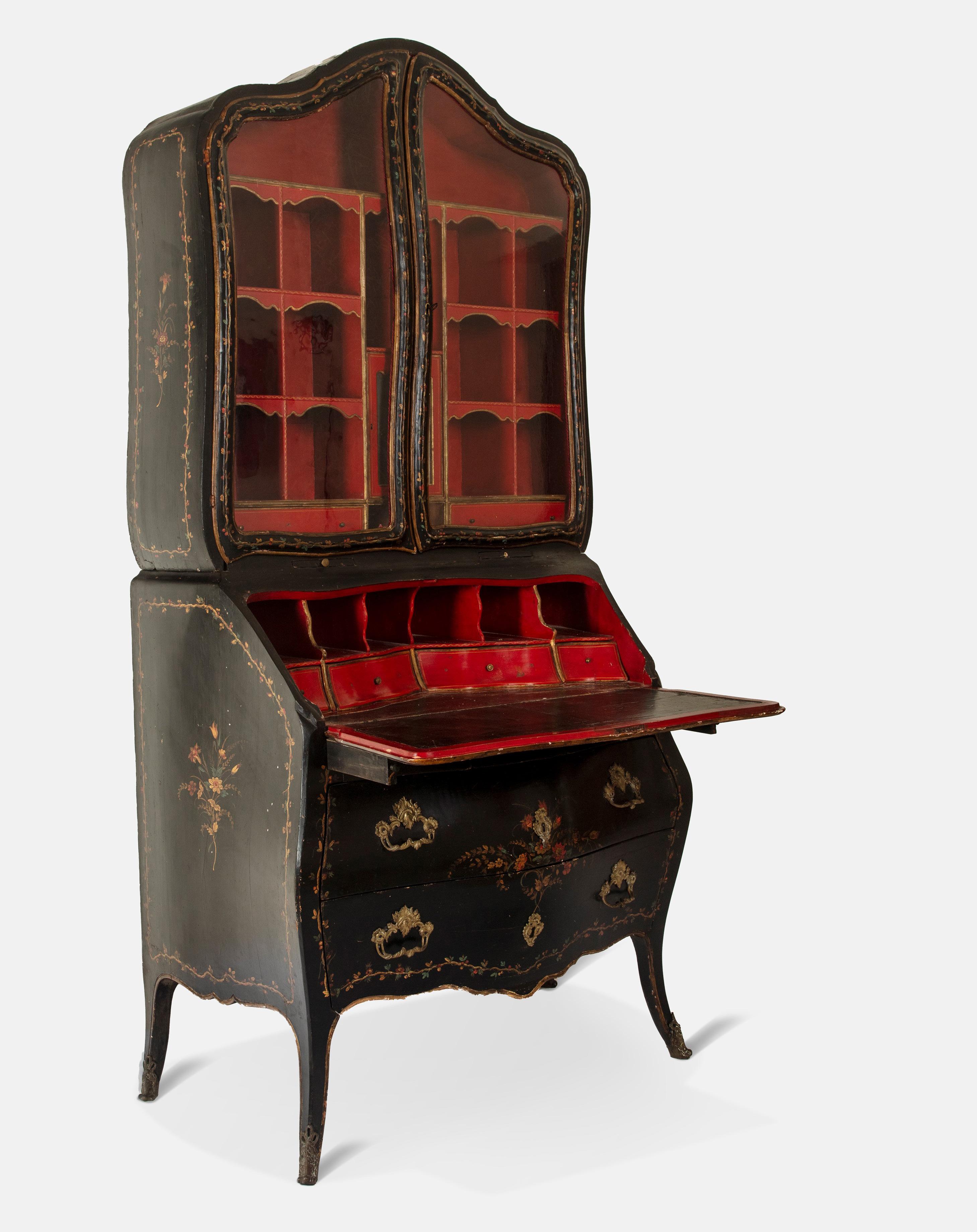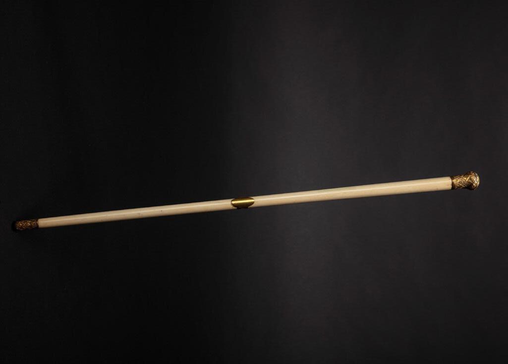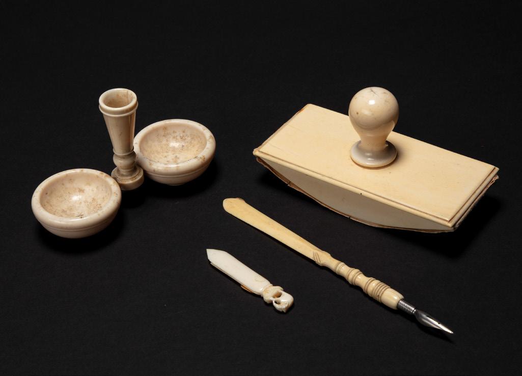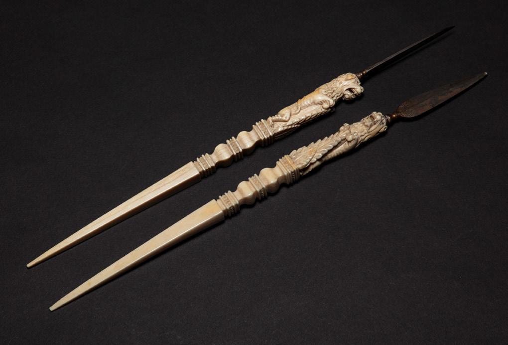 ☼ Un coltellino e un raschino da scriba con lame in acciaio con tracce di doratura alle basi incise e manici in avorio sormontati da leoni rampanti appoggiati a motivi fogliacei stilizzati. Italia settentrionale o Germania meridionale, metà secolo XVIII l cm 32 (lievi difetti)
