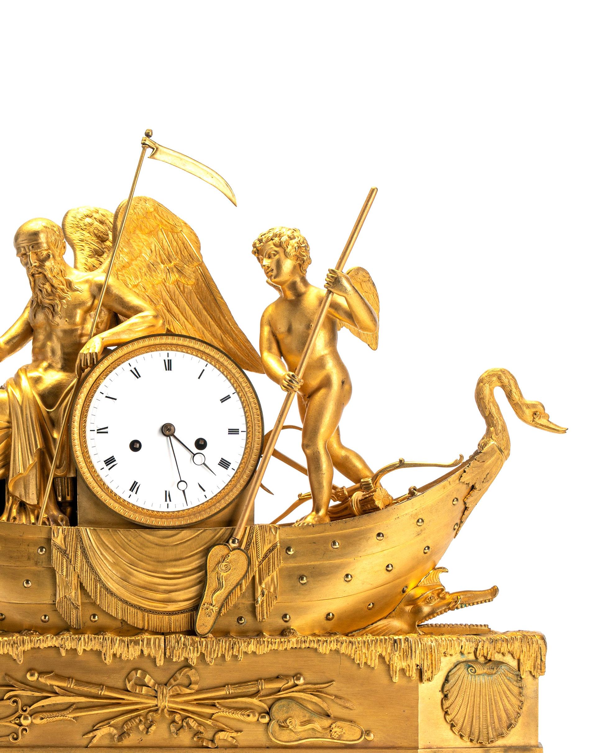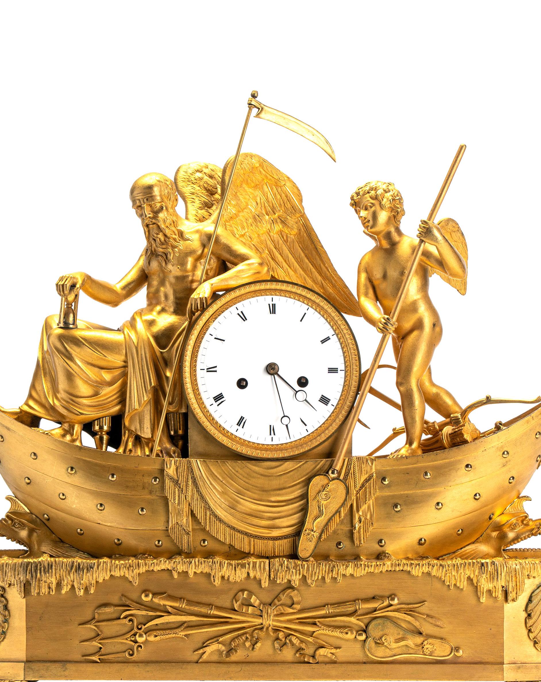 Di forma parallelepipeda con quattro colonnine angolari, sormontata da vaso biansato. Quadrante in smalto bianco con numeri romani per le ore e arabi per i minuti. Suoneria delle ore e delle mezze su gong.